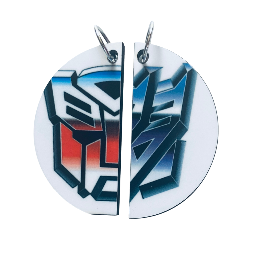 Celebrate your Transformers fandom and friendship with this bold and unique Transformers best friend pendant set. Designed with two interlocking half circles — one showing half of the Autobot and the other showing half of the Decepticon — this set is perfect for fans who want something symbolic.