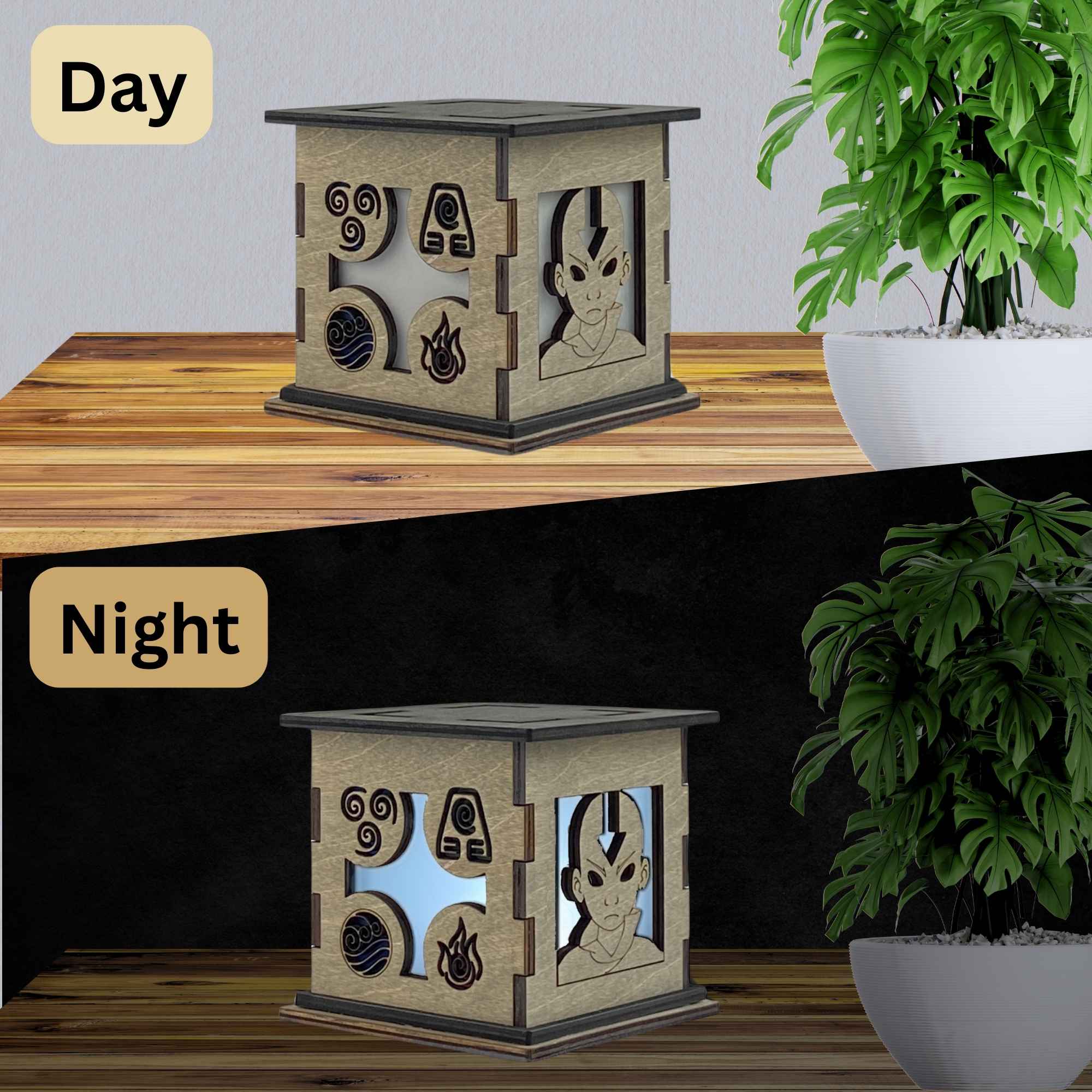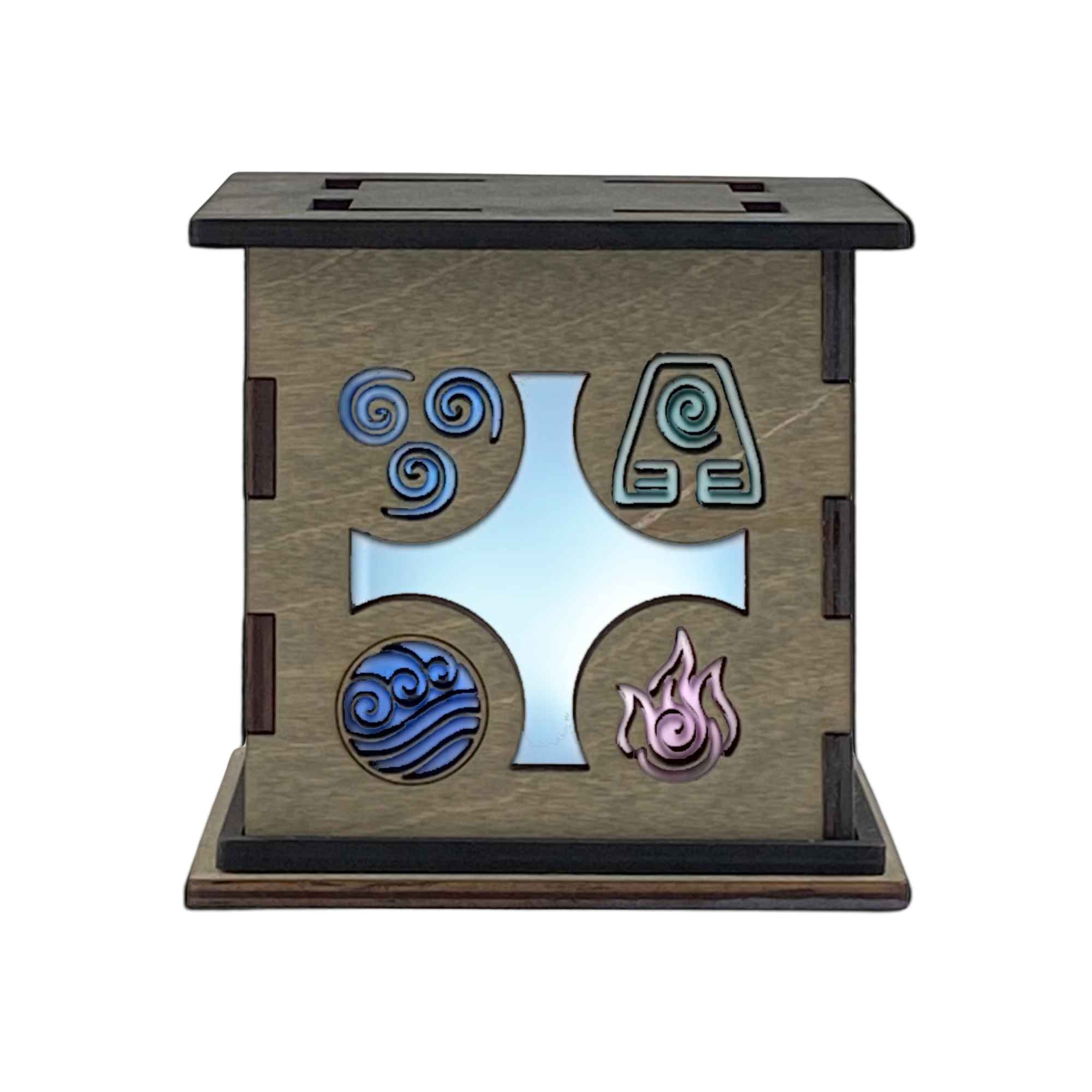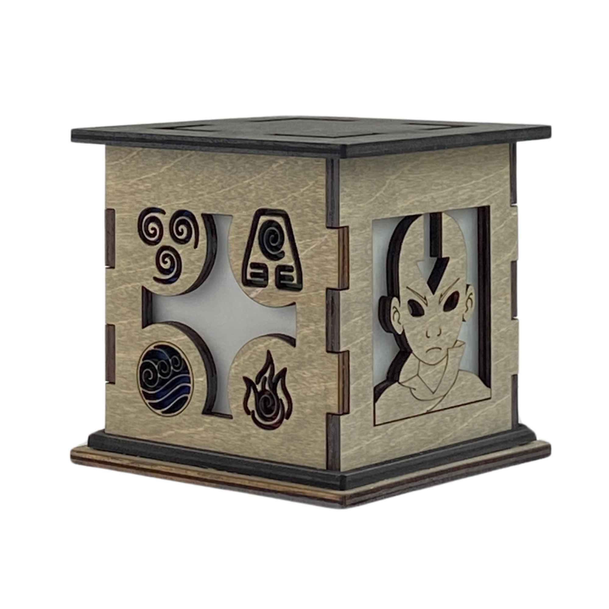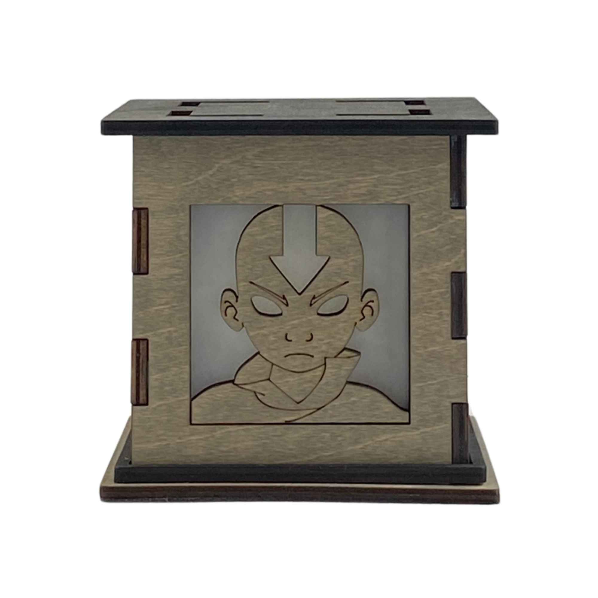 Channel the Avatar State with this handcrafted glow box inspired by Avatar: The Last Airbender. Designed for fans of the beloved animated series, this wooden light box features two intricately cut side. Firstly, one side showcasing Aang in his Avatar State in front of a white translucent filter. While the other displaying the four elemental nations—Water, Earth, Fire, and Air. This design sits in front of a custom printed filter that features the respective color of each nation behind their symbol. Additionally, included is a battery-operated tealight that allows the box to cast a warm, flickering glow. The soft light brings your favorite scenes to life, whether you’re placing it on a nightstand, shelf, or display case.