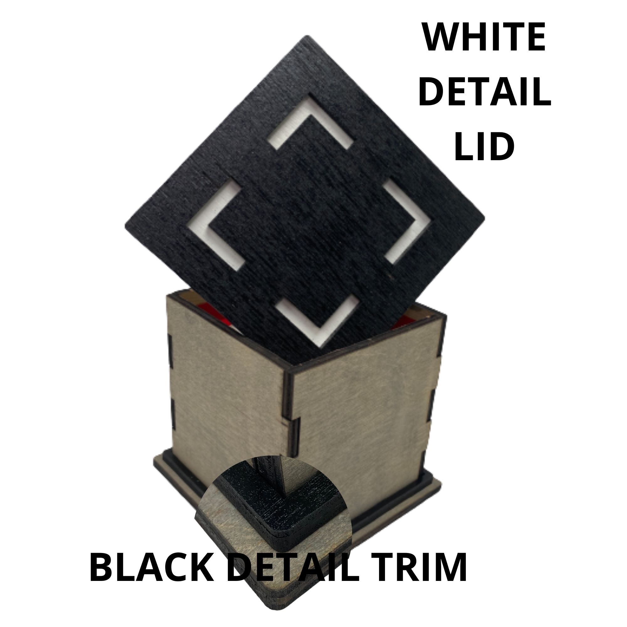 Measuring 5″ on each side, this wooden lantern is the perfect size for a table, mantle, or bedside display. Stained in a versatile grey tone and topped with a sleek black-painted lid. In addition the lid features matching cutouts on the top to echo the side designs. The contrast between the grey and black adds a sophisticated touch—making it both nerdy and elegant.