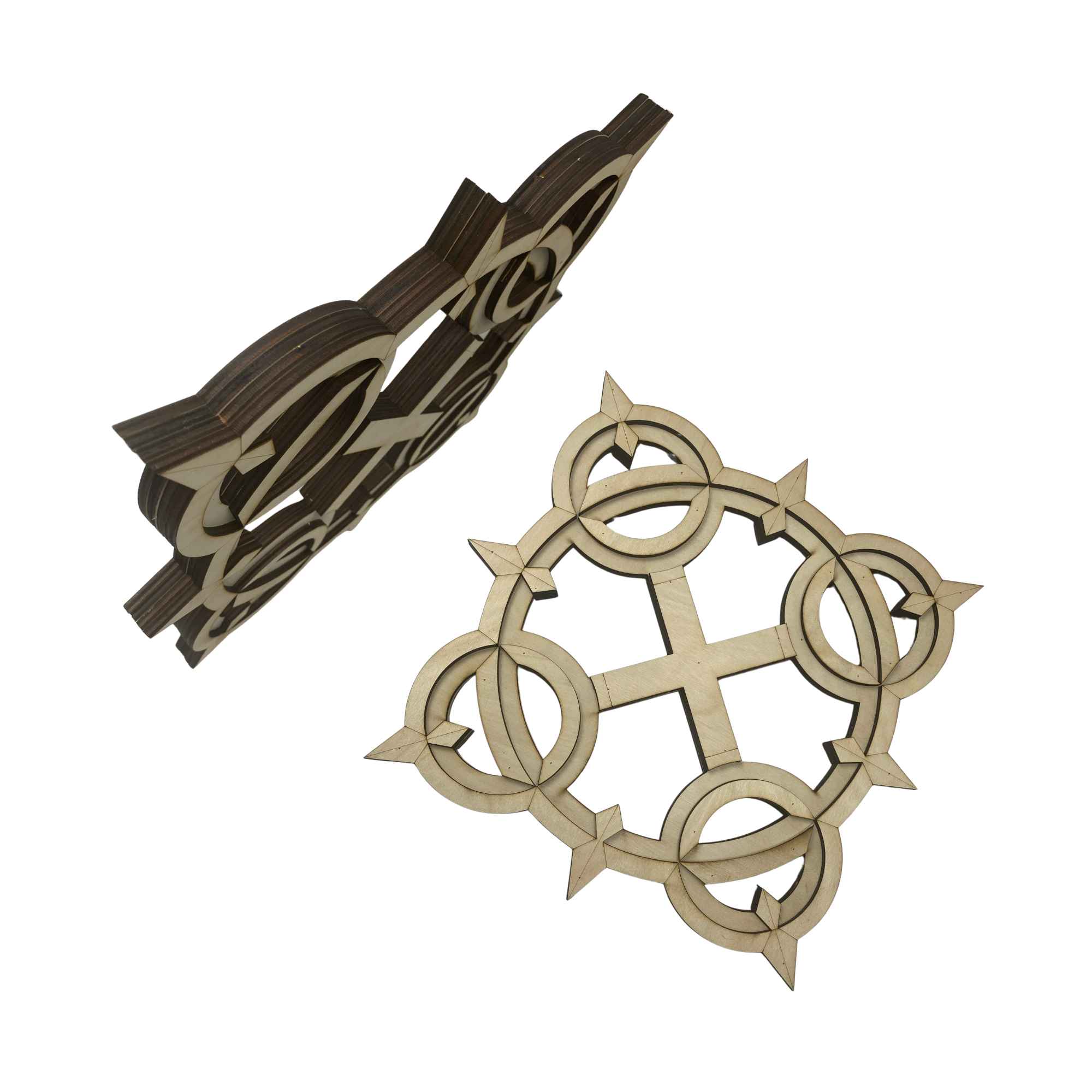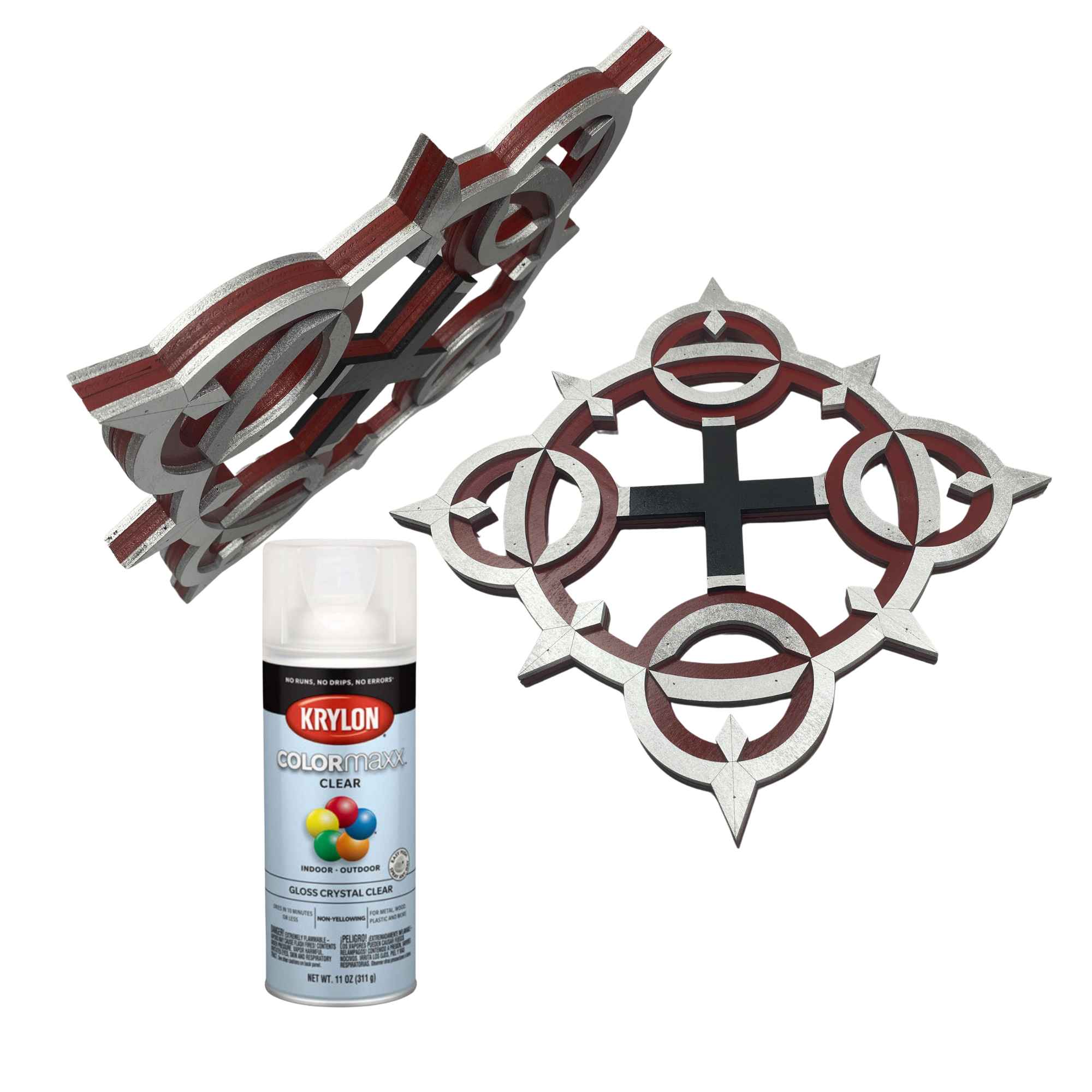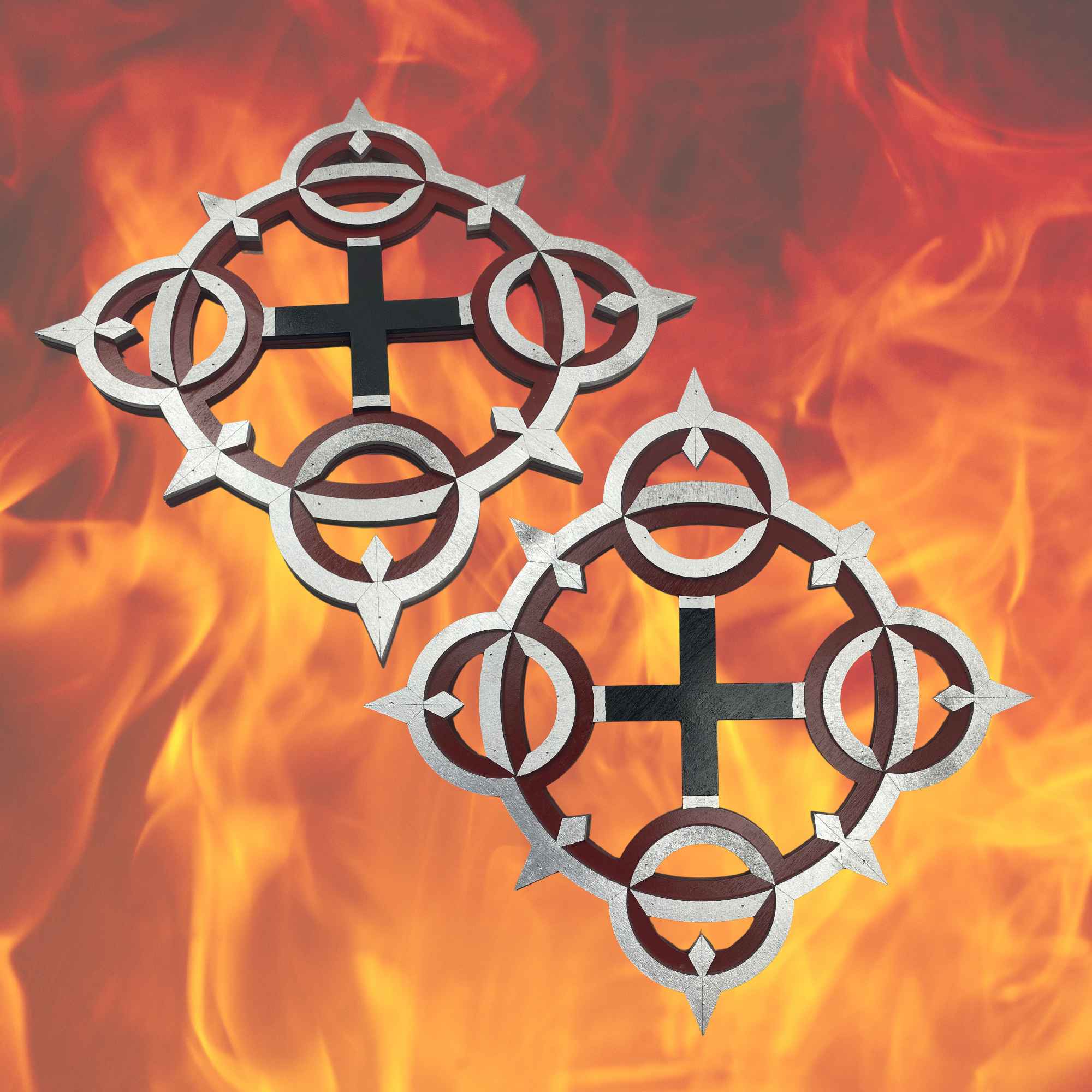 Axel Eternal Flame Chakrams are hand crafted from layered ¼” thick wood, the costume replicas are durable and light weight. These layers provide structure and remarkable detail to create a replica as close to the original source as possible. After we have sanded, primed, painted, glued and micro nailed each layer together creating a strong and durable fully immersive cosplay accessory. These are highly decorated replica pieces made for the imagination. We do not encourage actual LARPing as paint and more delicate sections are prone to damage on collisions.
