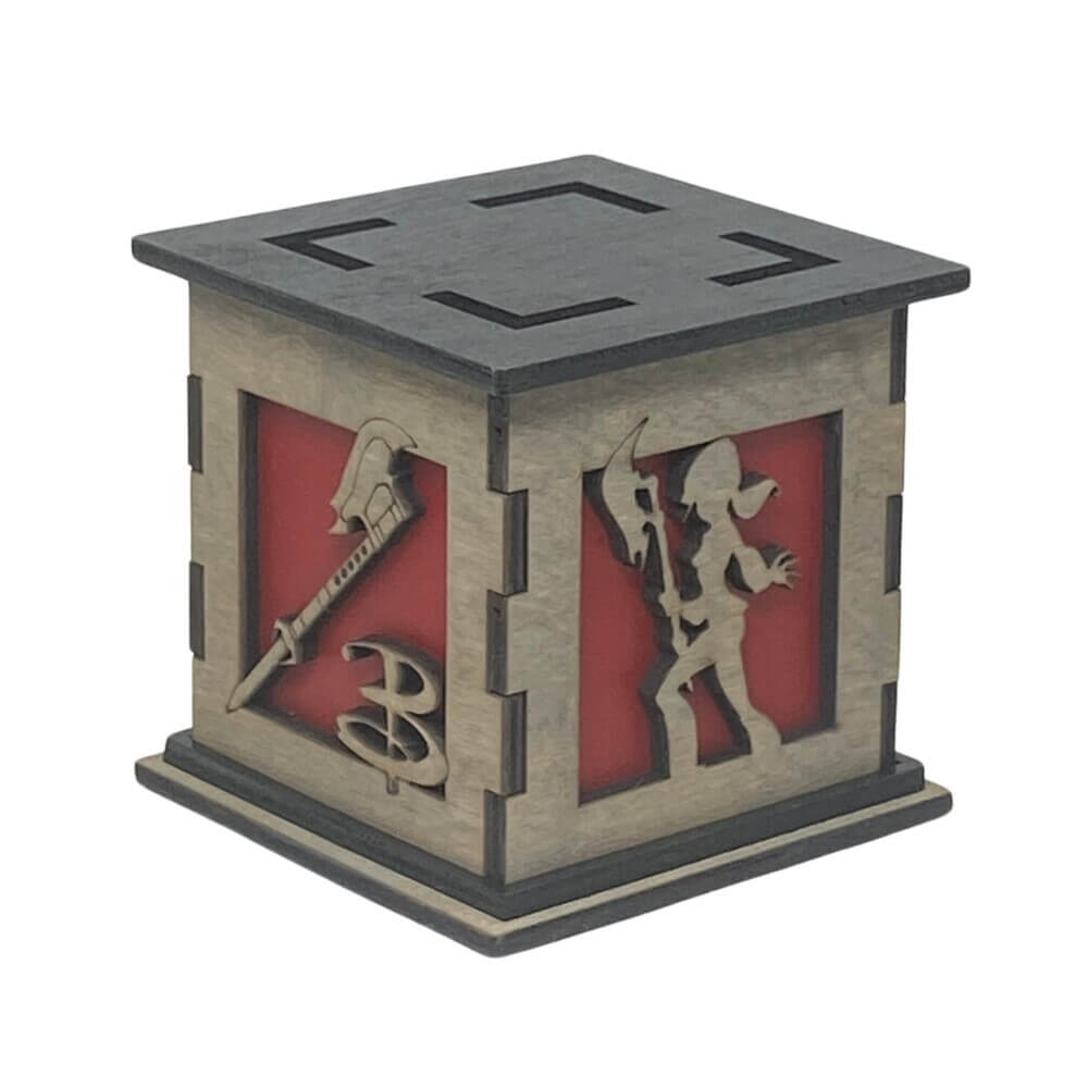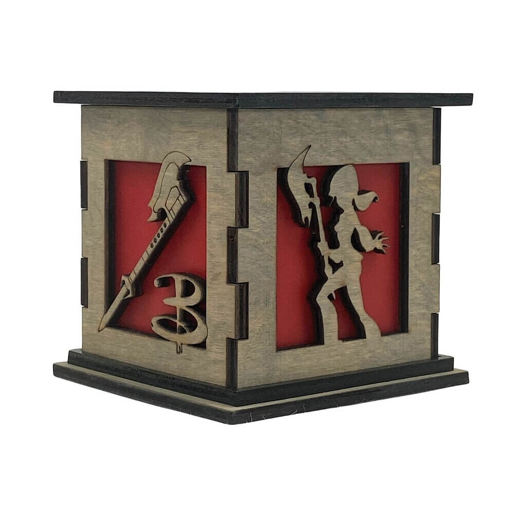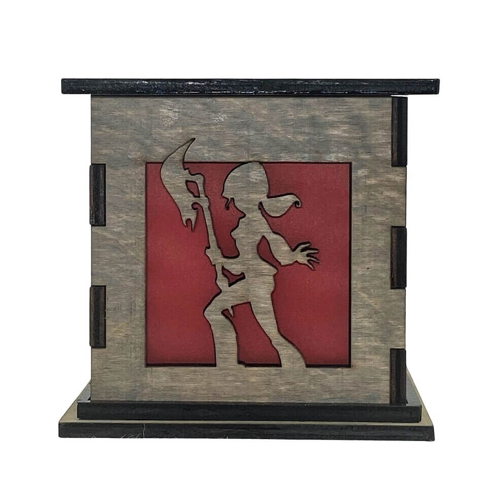 This wooden lantern measures at 5″ on each side. Creating a cubed box that is an excellent decorative keepsake for your table, shelf, mantle, bedside, desk and more. Beautifully stained grey to match any existing home décor.  Lined with a colored translucent filter that gives your box a pop of color even when not lit up. Featured on the top is a painted black top with four cut outs featuring the same color on display on the sides. The black top and rim contrast against the grey and give the box an overall elegant look.  The lamp comes with a white tea light that allows the box to give off its glow.  These details result in a candle holder that has that unique combination of nerdy with sophistication.  Giving the option to display your passions while not taking away from keeping a beautiful home.