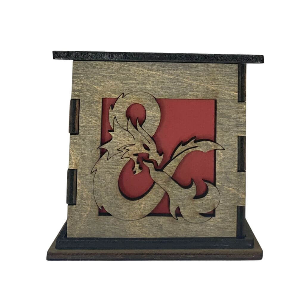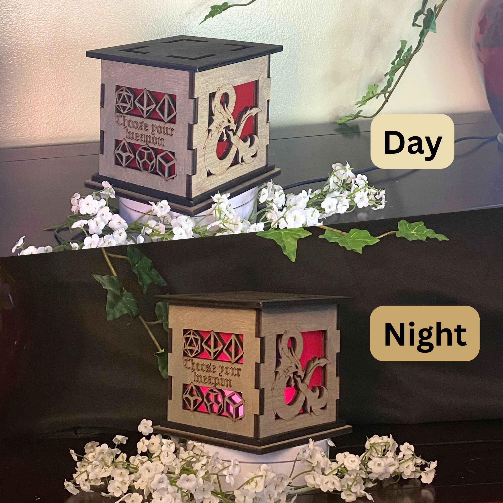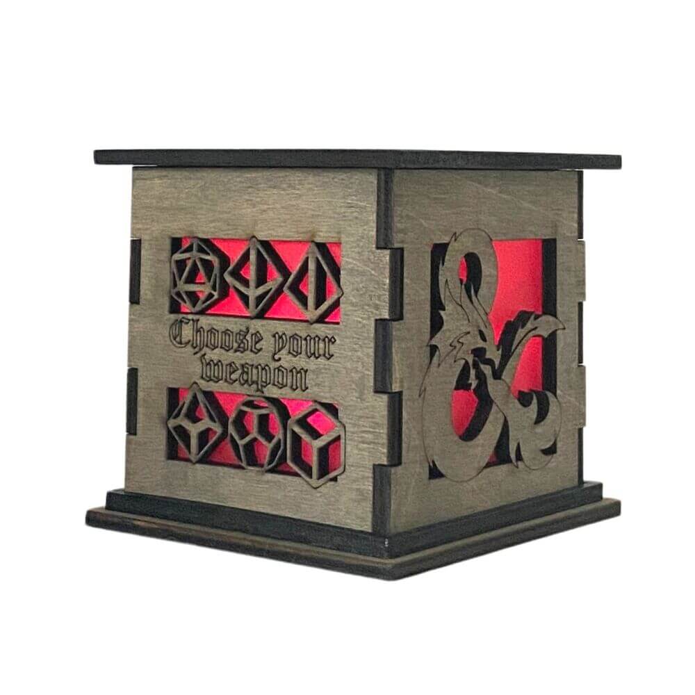 You don’t have to make a dice roll to take the initiative and get this D&D Light Up Box. A perfect way to display your love for adventure and role play through Table top gaming. Whether proudly displayed on a shelf or brought to the table next to the DM its going to bring light to your journey. Measuring at 5″ on each side this handmade wooden box also makes for great dice storage. Engraved and cut out on two sides and detailed with a cut out of the dragon ampersand on one side of the box. While the other side is decorated with 6 die cut out and the words engraved “choose your weapon”. As a result, you get that unique combination of nerdy with elegance and sophistication for your table decoration.