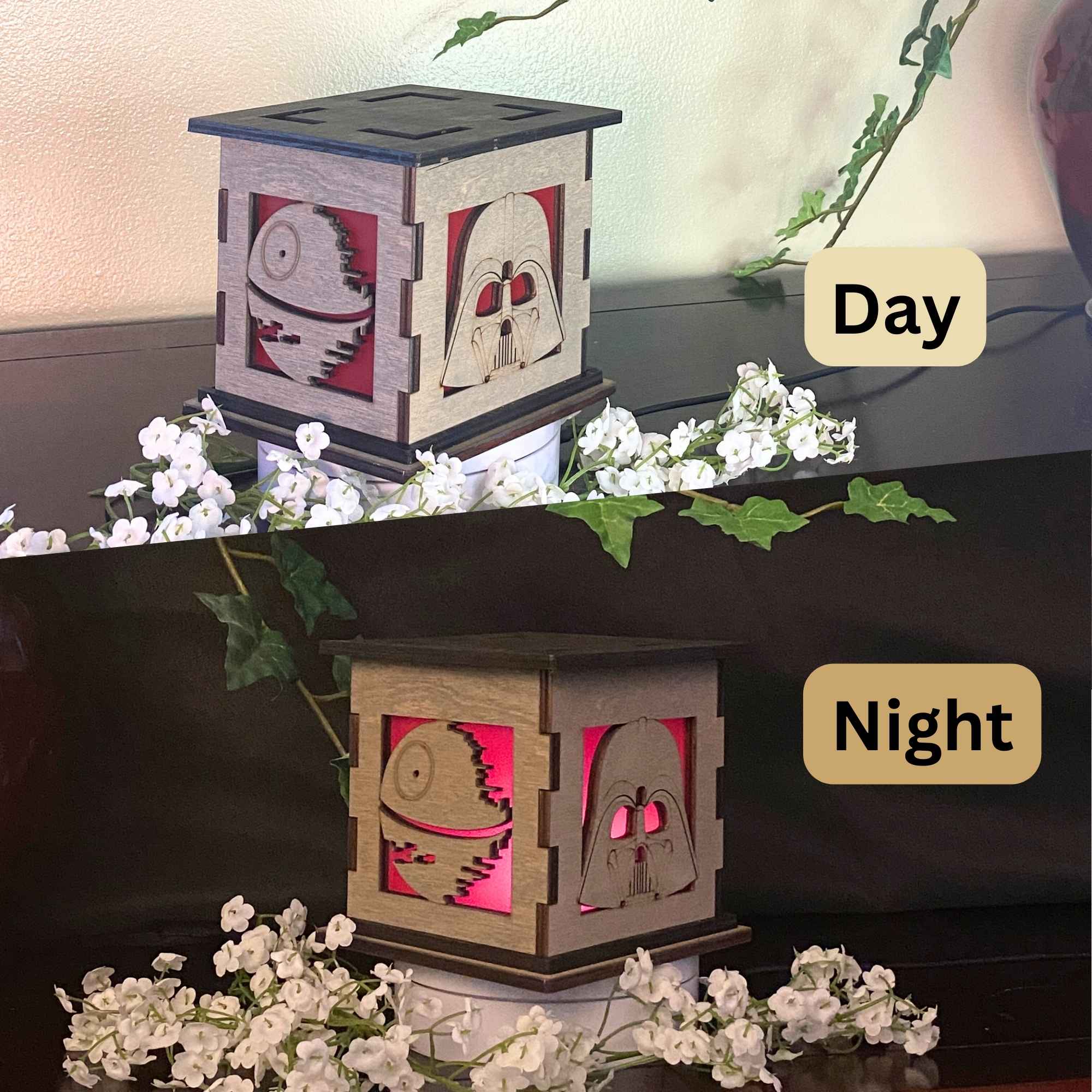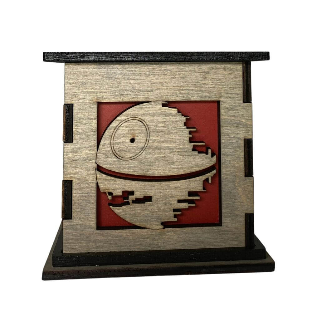 Whether you’re allied with the Dark Side or you are just looking for its weakness than you need this Death Star Light Up box on display. Beautiful 5″ Cubed Death Star Decorative Box for your table centerpiece, shelf, mantle, bedside table, and more. There is no better way to display your geeky personality than this charming box. Engraved and cut out on two sides so you can simply nestle the box into an existing collection, making the perfect table centerpiece for any space, or allow it to stand alone and be fully admired. On one open side of the box is a cutout of the feared Death Star. While the other open side is detailed with Darth Vader’s menacing helmet. As a result, you get that unique combination of nerdy with elegance and sophistication for your table decoration. Measuring at 5″ on each side to make for easy placement on any surface. Either as a treat for yourself or as that unique gift for a Star Wars fanatic in your life. This is the perfect nerdy decor that is sure to be the perfect accent in all of the Empire.