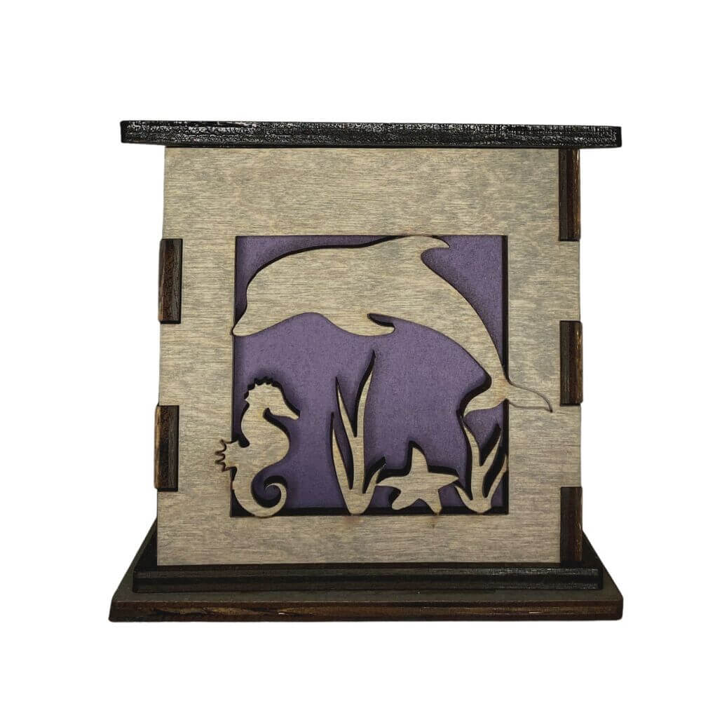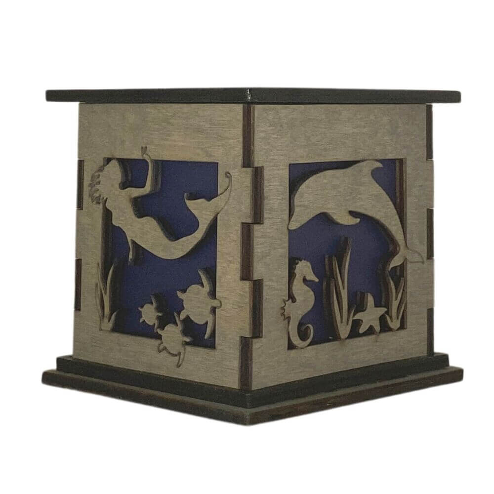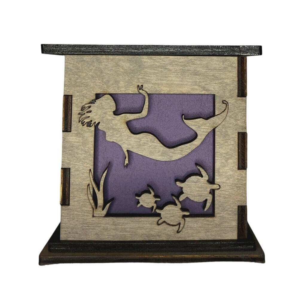 The perfect gift or home decor addition for any lover of the ocean is this Under the Sea Light Box. Decorated with details that celebrate aquatic life on two sides. One side features the silhouette of a mermaid as they swim along a group of turtles and some seaweed. While beside it is a cut-out design of a dolphin over a sea horse and starfish hidden among the seaweed. All of these details sit in front of a blue translucent color filter adhered to the inside that allow it to glow the blue of the ocean water.