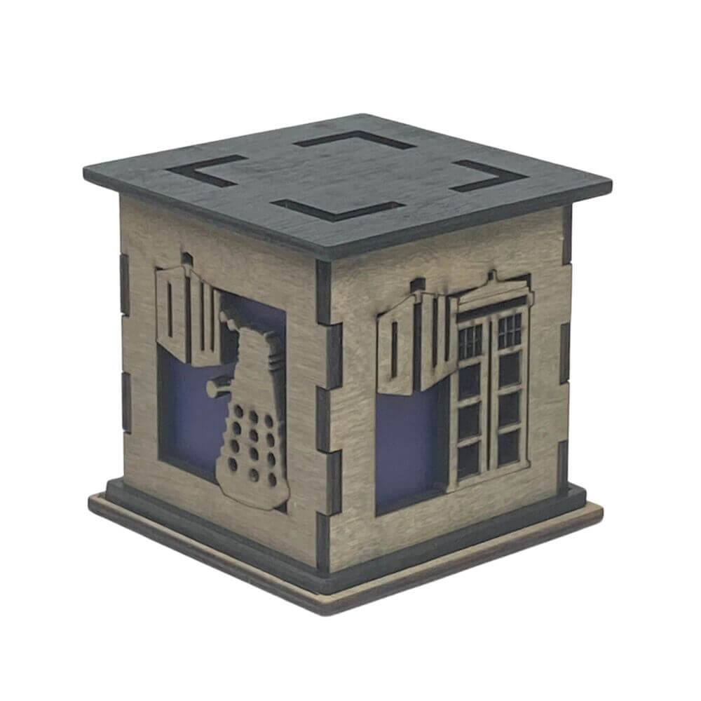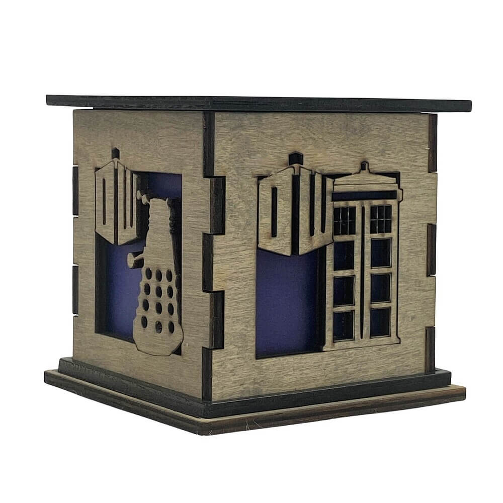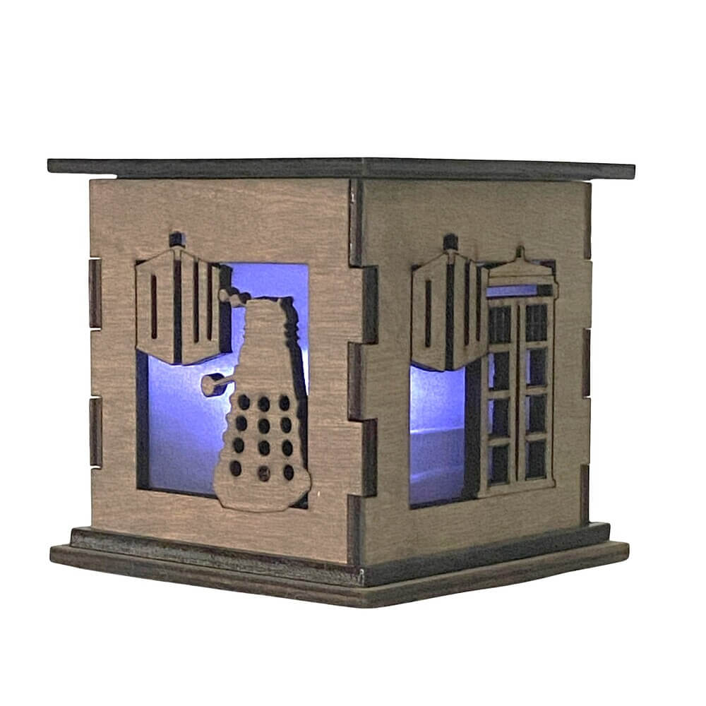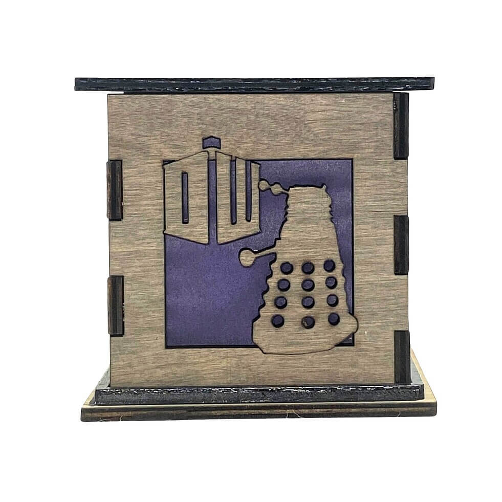 You can’t be a Dr. Who Fan and not own this 5″ Dr. Who Light Box. This handcrafted wooden lighted box measures 5″ on each side. Creating a both easy to place shelf sitter whilst still large enough to be a distinct addition to any Dr. Fan home, office or bedroom. Perfect for the dorm room! One open side of the Light Box displays the TARDIS while the other side features a Dalek. A unique combination of nerdy with elegance and sophistication for your table decoration, making the perfect table centerpiece for any special occasion, or allow it to stand alone and be fully admired.
