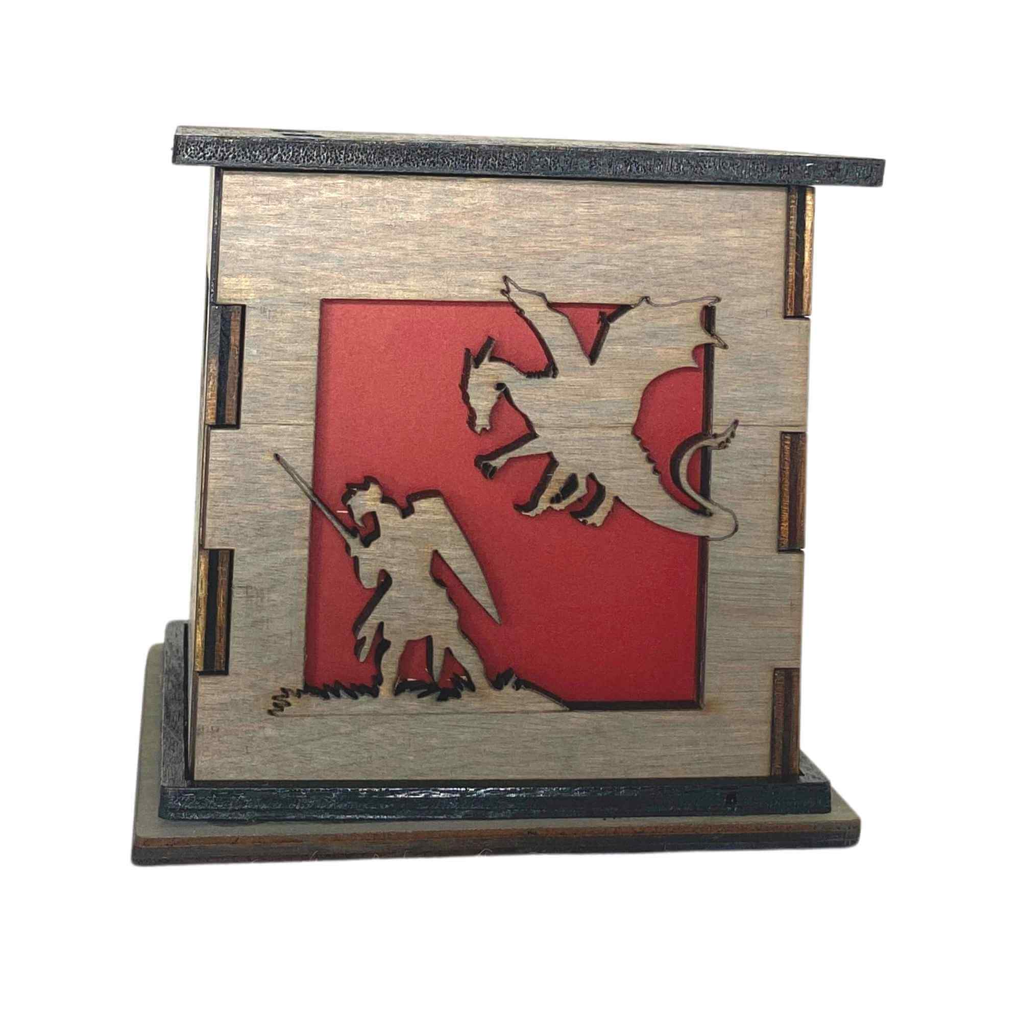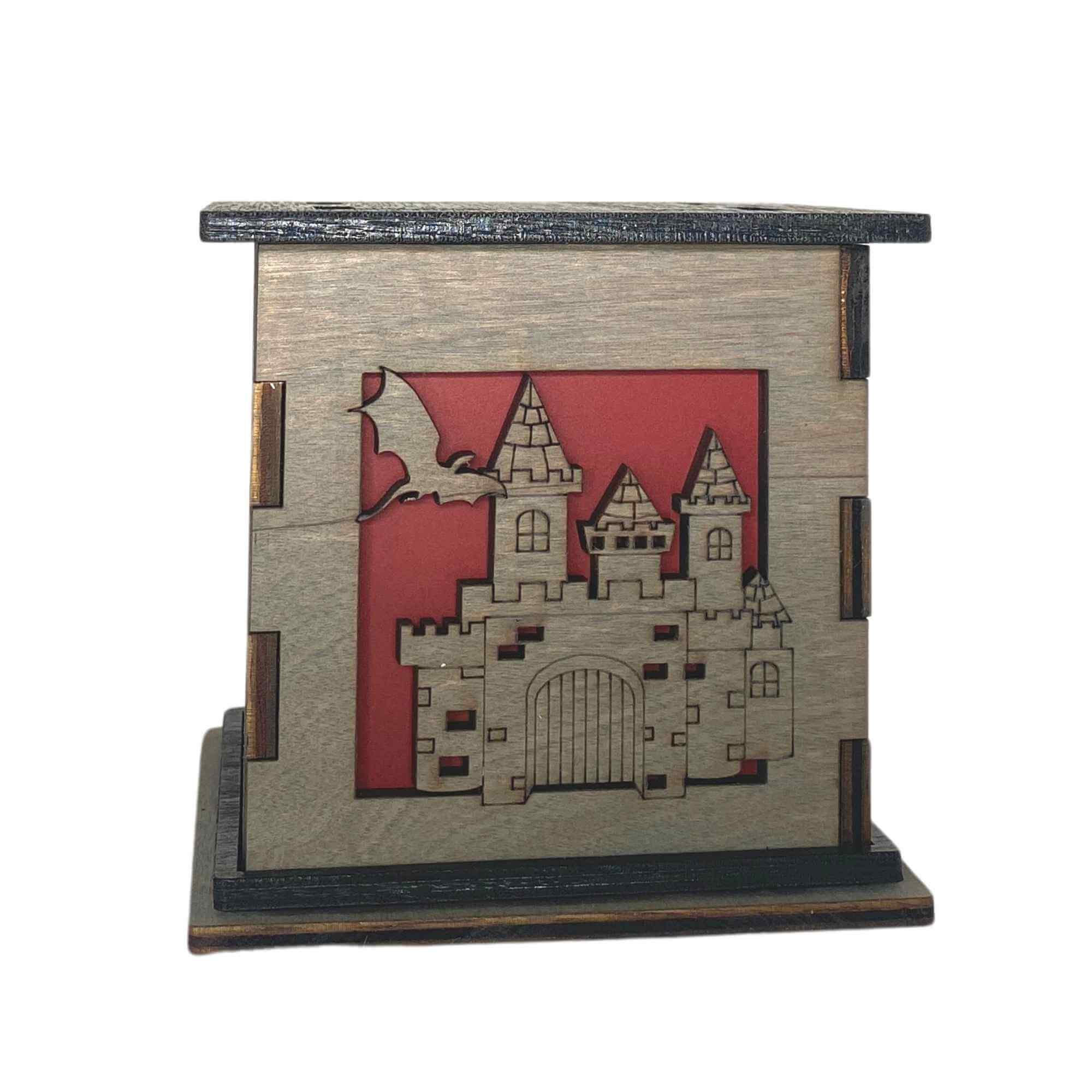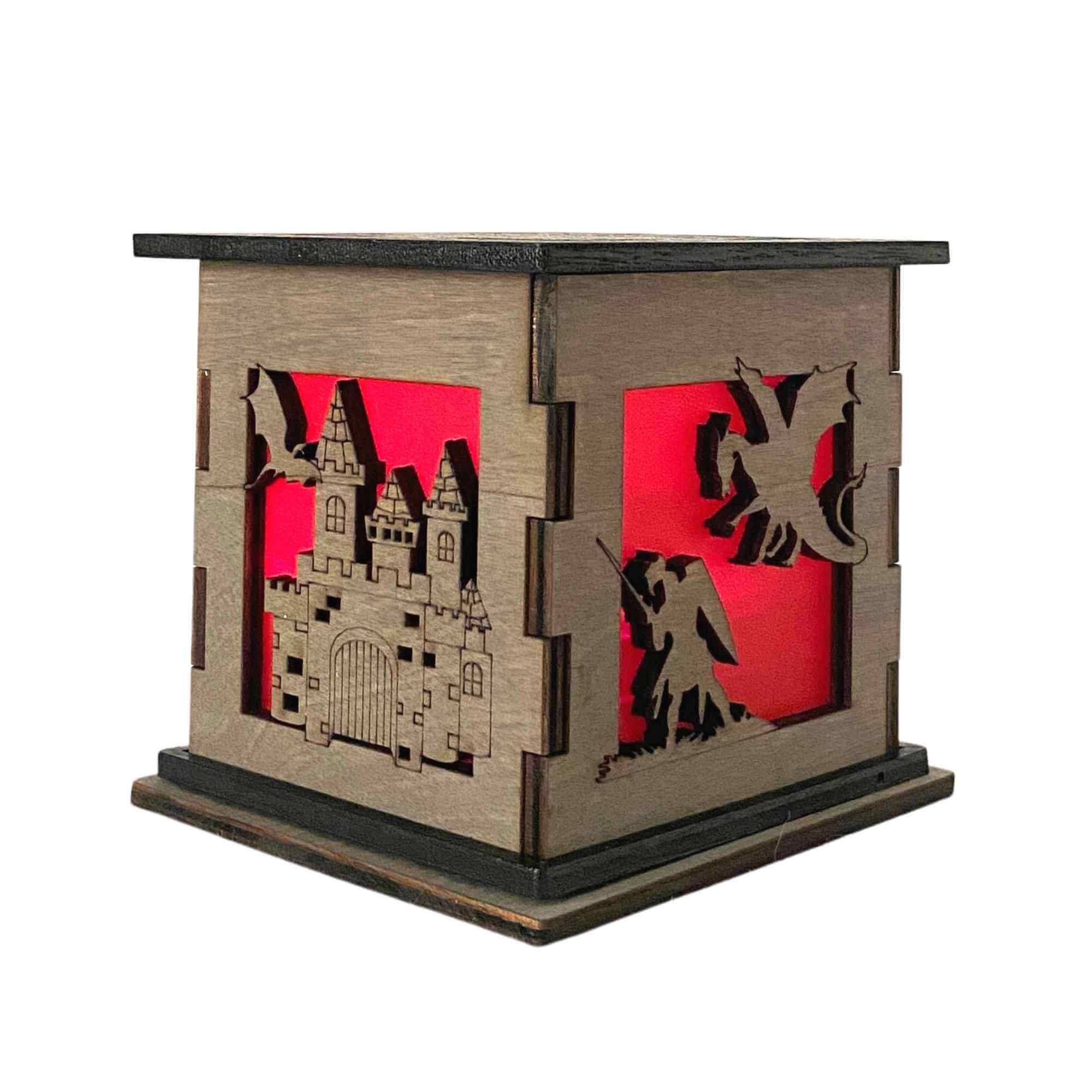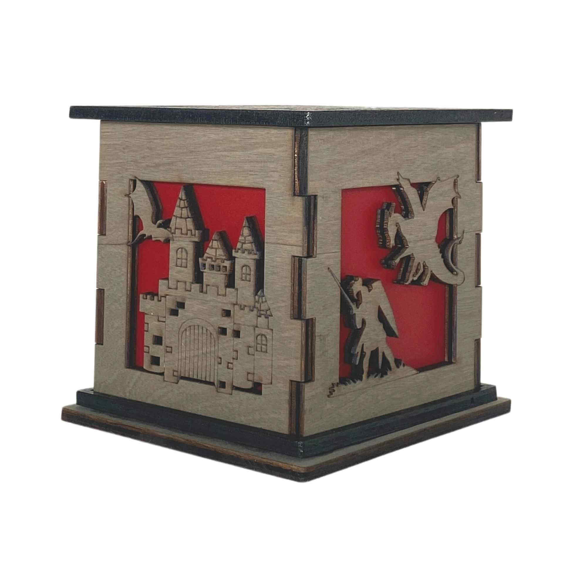 This Dragon Light Up Box is the perfect gift or home decor addition for any adventurer. Bring the fiery red glow of a dragon into to your home. Adorned with two decorative sides in front of a red translucent color filter that along with the included LED tea light allow your box to glow. One side features the design of an illustrious castle about to be set siege upon by a flying dragon. While the other side features the scene of a silhouette of a knight and dragon in battle. Altogether making the perfect gift for any fan of dragons, whether it be through gaming, film, or books.