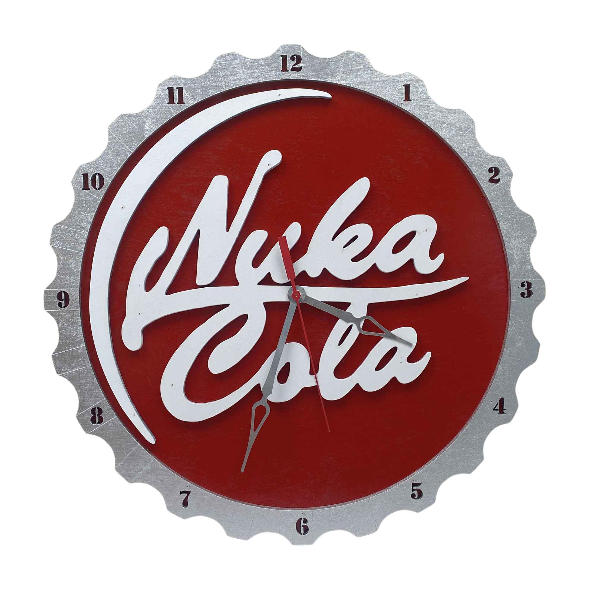 This clock features a unique, scalloped circular shape crafted from layered wood. The background is painted a rich Nuka-Cola red, while the outer rim is finished in metallic silver. As a result, the clock closely resembles the vintage bottle caps from the game.
