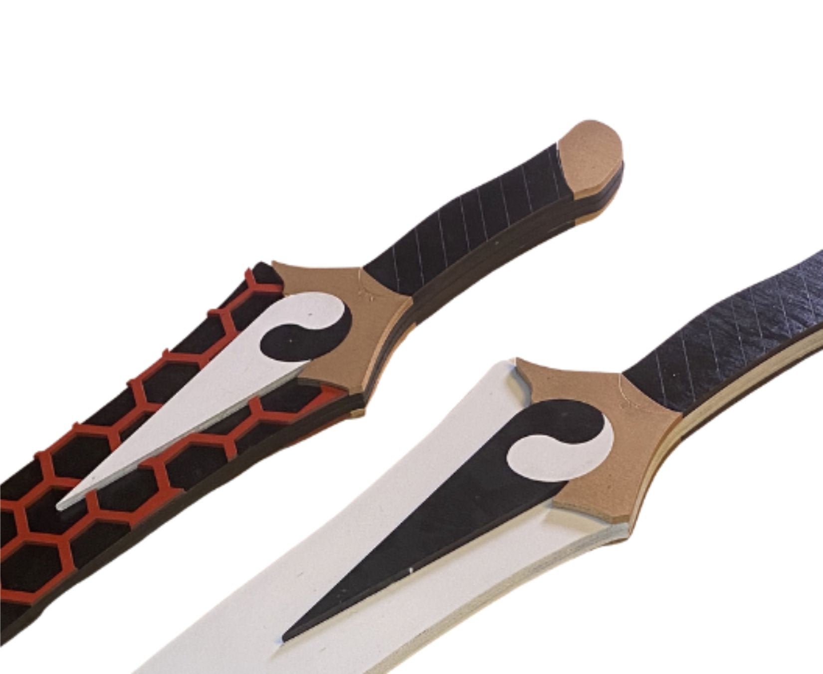 Fate/Stay Night Archer Swords costume replicas are durable and lightweight. Hand crafted from layered ¼” thick wood, providing structure and remarkable detail to create a replica as close to the original source as possible. Specifically we sand, prime, paint, glue and micro nail each layer together creating a strong and durable fully immersive cosplay accessory. Subsequently creating a highly decorated replica piece made for the imagination. However, we do not encourage actual LARPing as paint and more delicate sections are prone to damage on collisions.