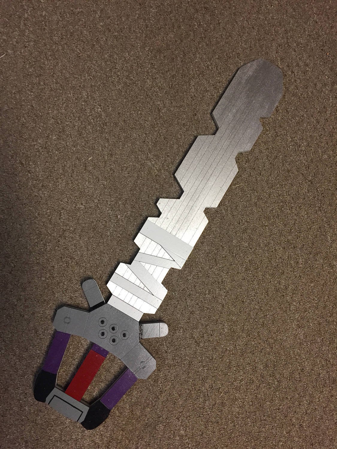 Fenrir Keyblade is hand crafted from layered ¼” thick wood, the costume replicas are durable and light weight. These layers provide structure and remarkable detail to create a replica as close to the original source as possible. After we have sanded, primed, painted, glued and micro nailed each layer together creating a strong and durable fully immersive cosplay accessory. These are highly decorated replica pieces made for the imagination; we do not encourage actual LARPing as paint and more delicate sections are prone to damage on collisions.