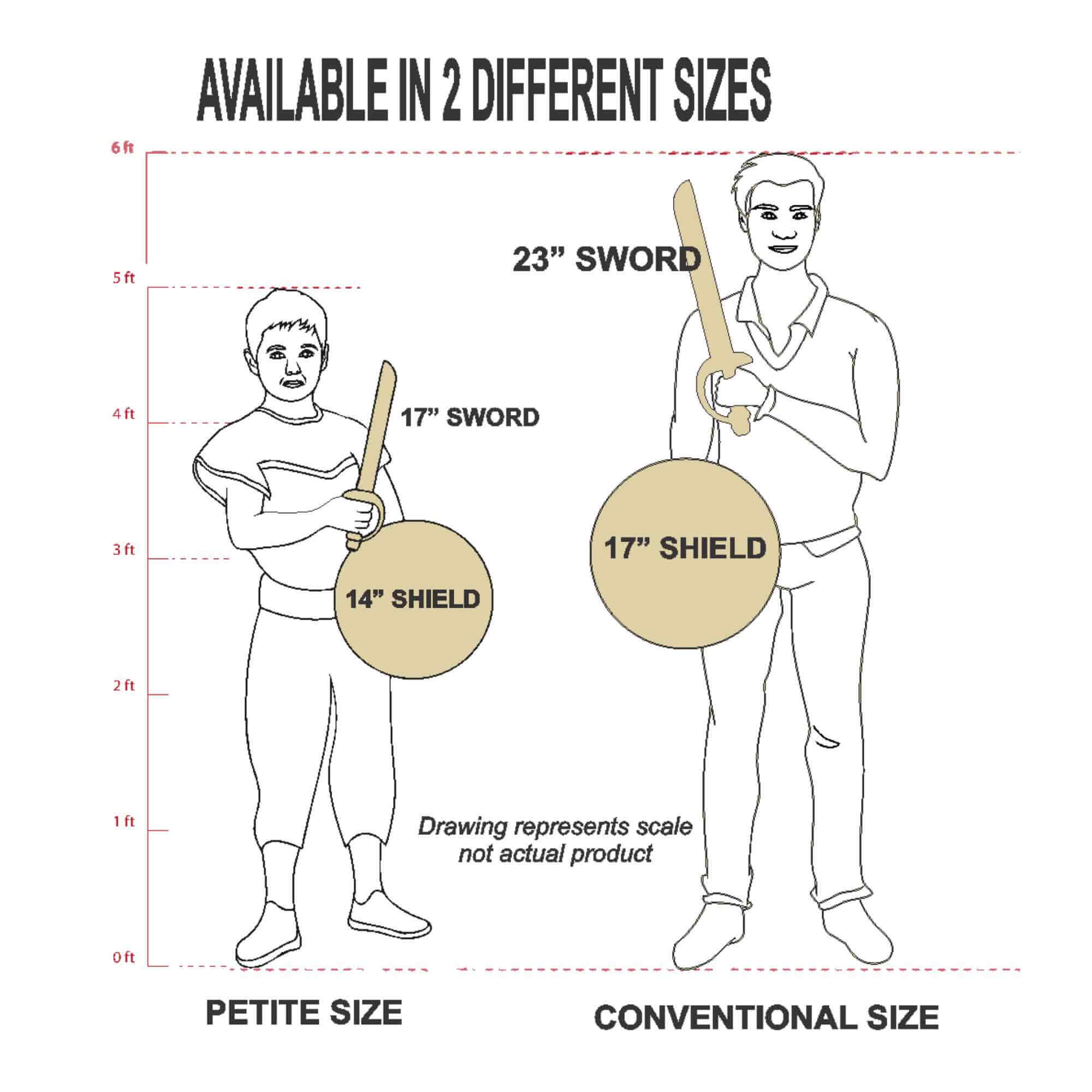 Unsure of the size you need? Check the product gallery photos on How to Measure for a conventional sized sword and shield using regular sized 8.5″ x 11″ paper. If the mock-up looks too large then you may wish to choose petite. We do offer a separate listing for the sword in an X-Large Size of 31″ in length and 10.25″ at the widest part.