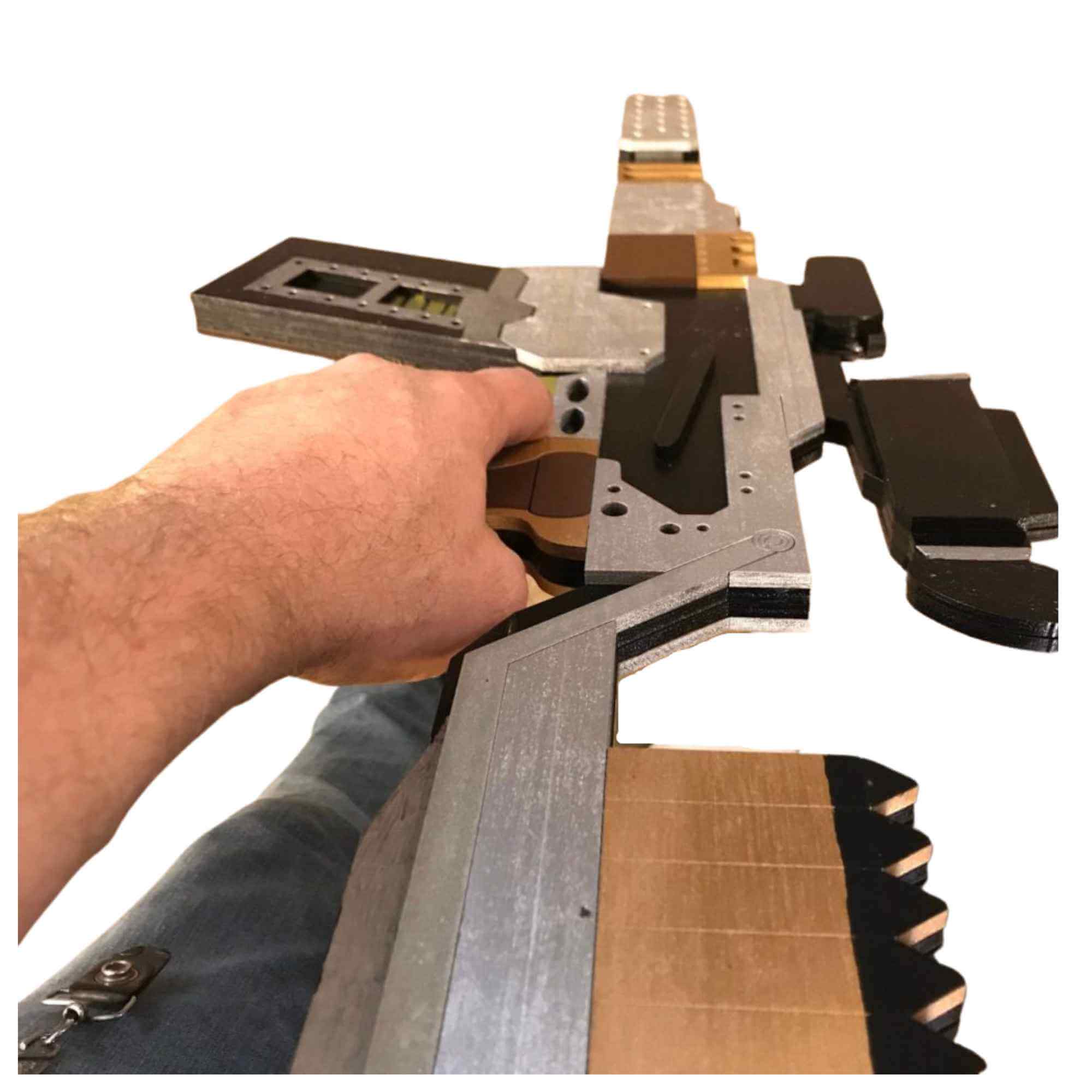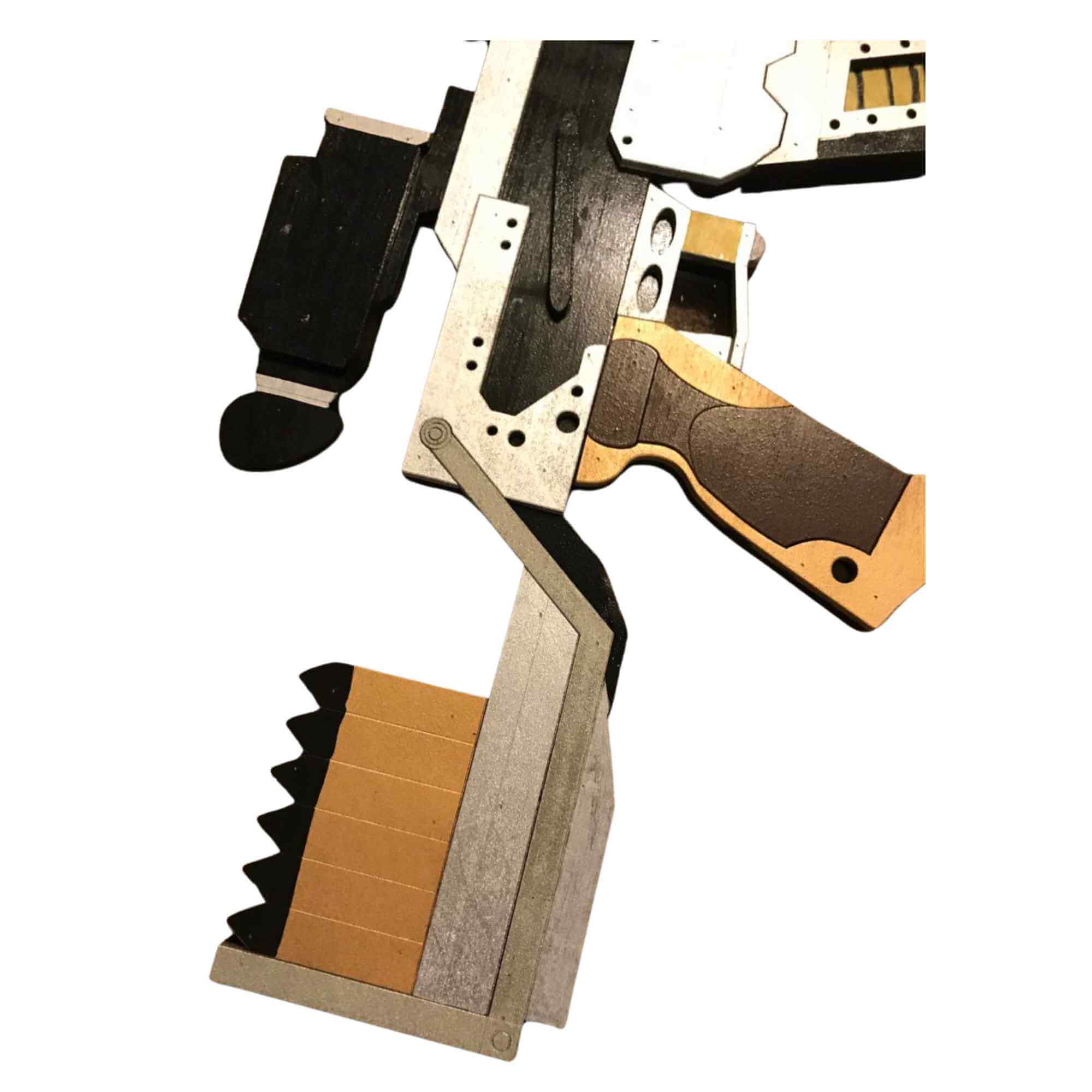 Firefly Vera Gun costume replicas are durable and lightweight. Hand crafted from layered ¼” thick wood, providing structure and remarkable detail to create a replica as close to the original source as possible. Specifically we sand, prime, paint, glue and micro nail each layer together creating a strong and durable fully immersive cosplay accessory. Subsequently creating a highly decorated replica piece made for the imagination. However, we do not encourage actual LARPing as paint and more delicate sections are prone to damage on collisions.