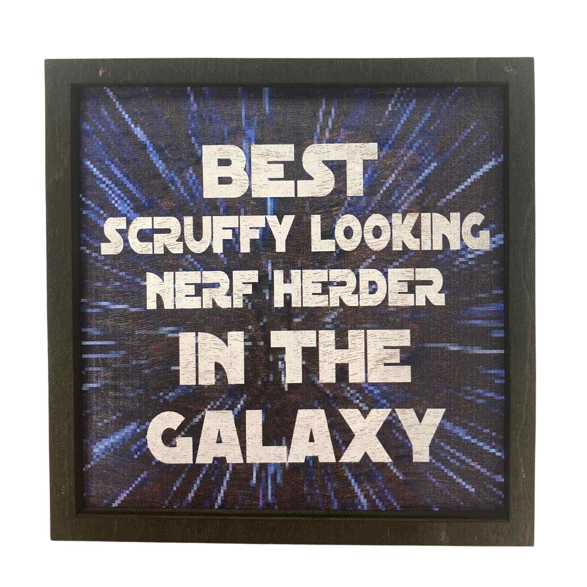 Celebrate the galaxy’s most beloved rogue with this Han Solo Mini-Frame with the iconic quote insult-turned-badge-of-honor: “Best scruffy looking nerd herder in the galaxy.” Inspired by Star Wars’ Han Solo, the starburst background and bold type shout this sentiment with pride. The black frame grounds the look in space-opera coolness.