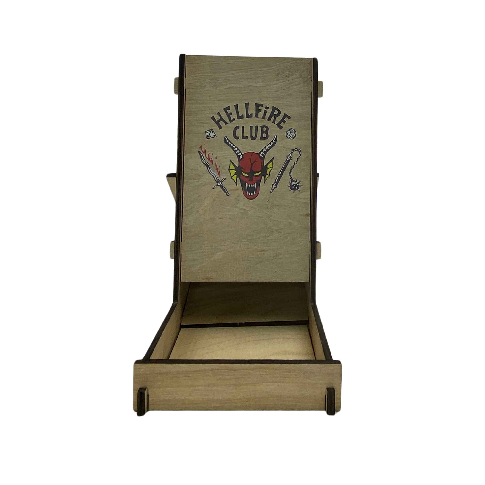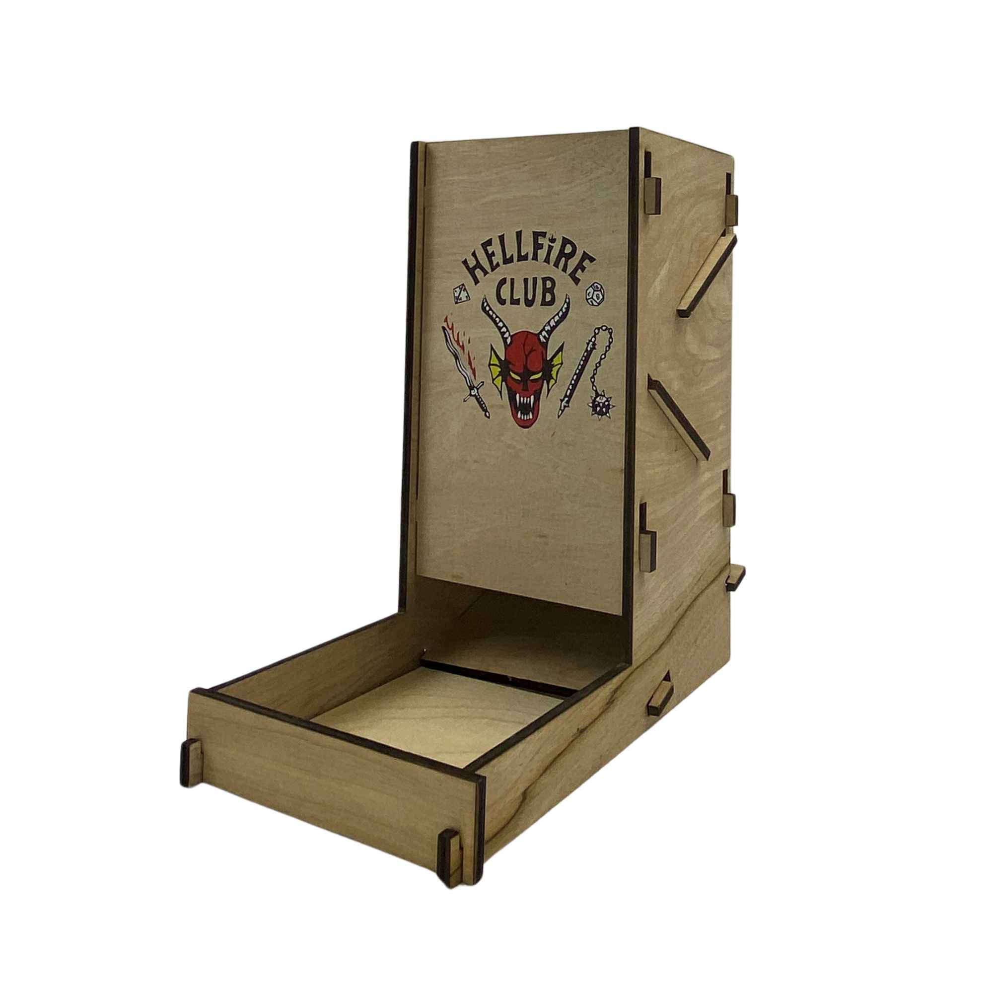 No more cheating with this X-Large dice tower adorned with the Hellfire Club image from Stranger Things.  Captures the essence of both mystery and nostalgia, appealing directly to fans of the popular Netflix series and tabletop gaming enthusiasts alike.  The image is a high temperature graphic, pressed directly on the wood.  A great conversation piece!
