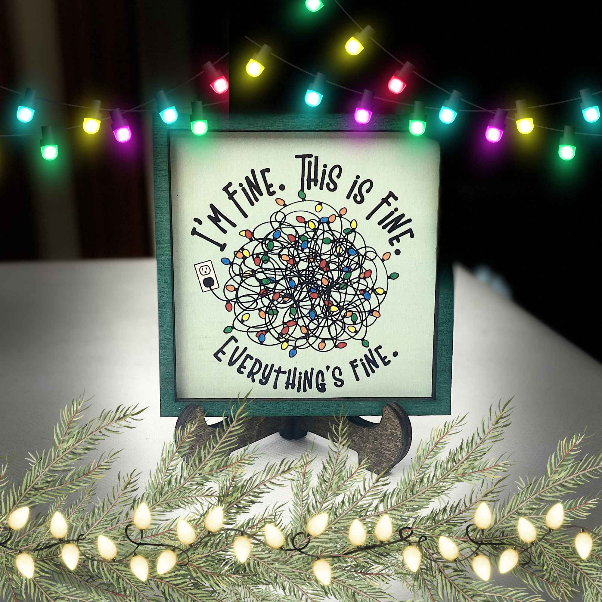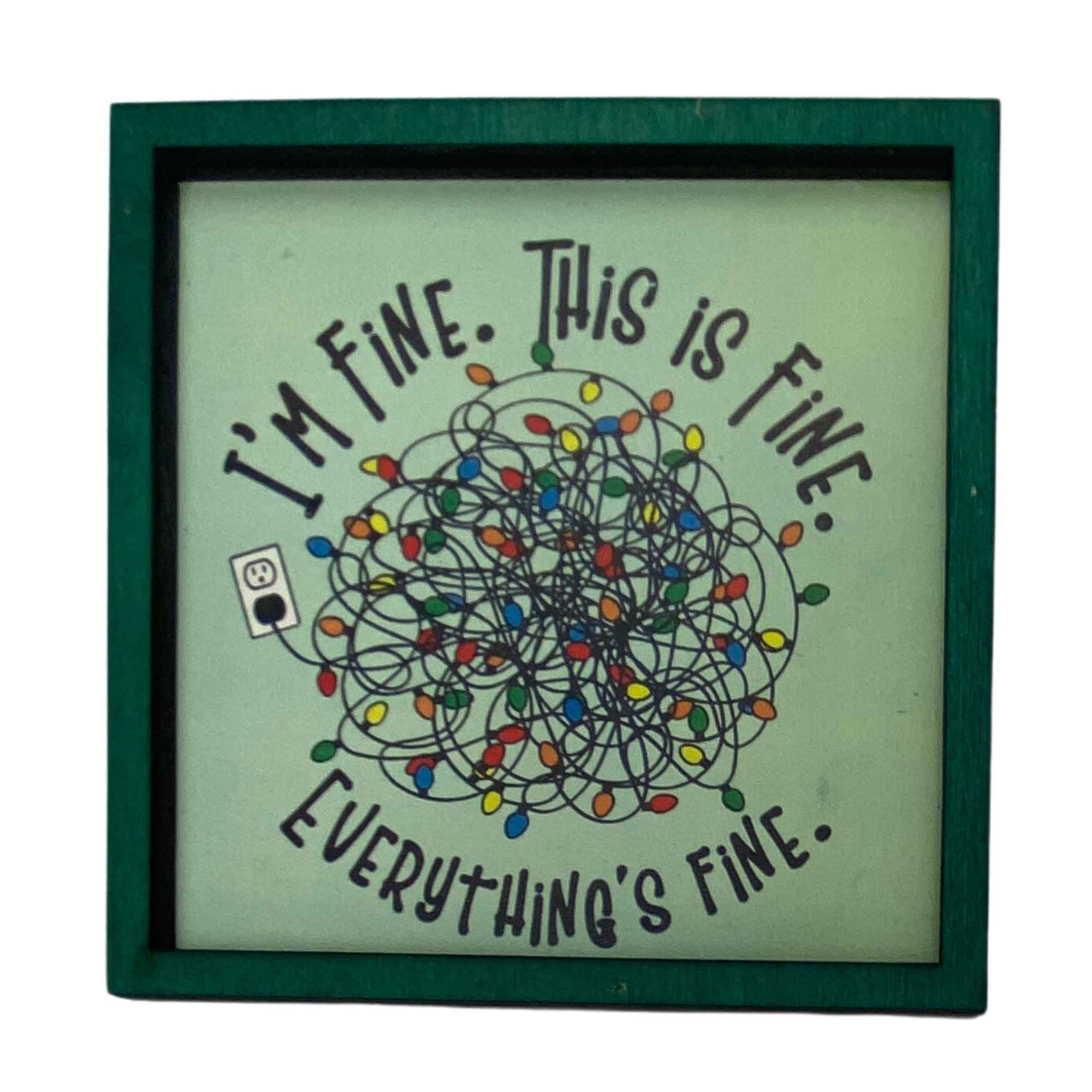 Holiday stress is real — but with this mini frame you can at least you can laugh about it. This mini-frame captures the chaos with a hilarious mess of tangled lights and the sarcastic mantra “I’m fine. This is fine. Everything’s fine.” The arched text dances around the clutter, framed in cheerful green.