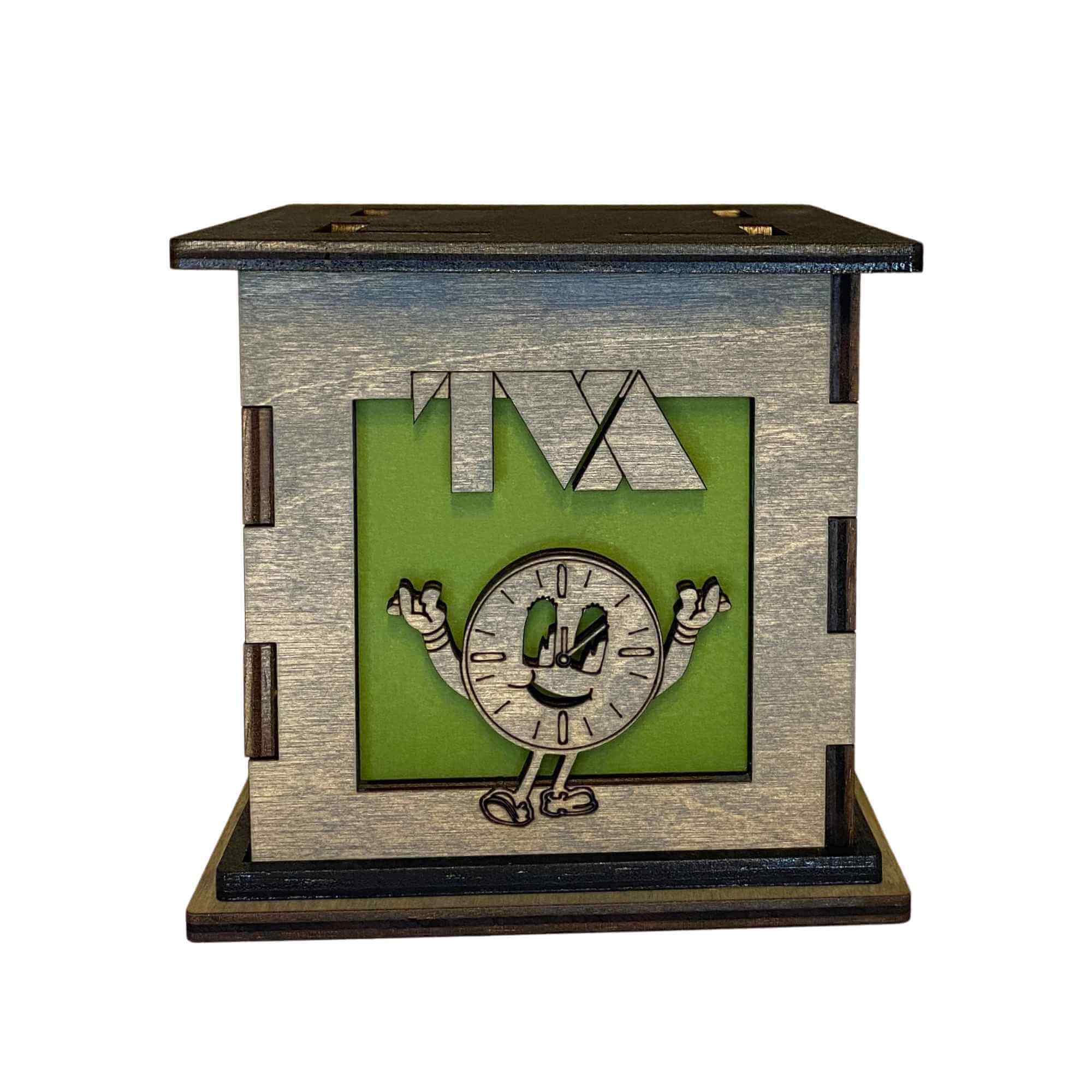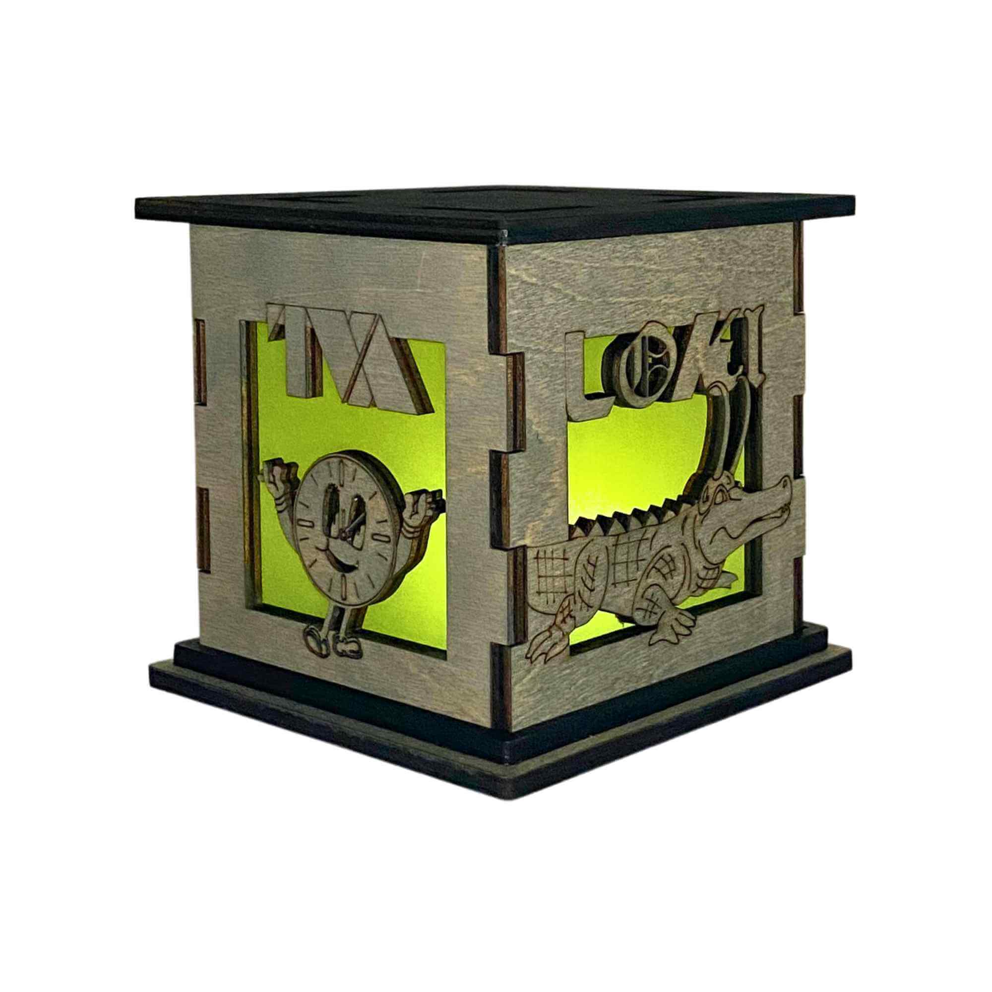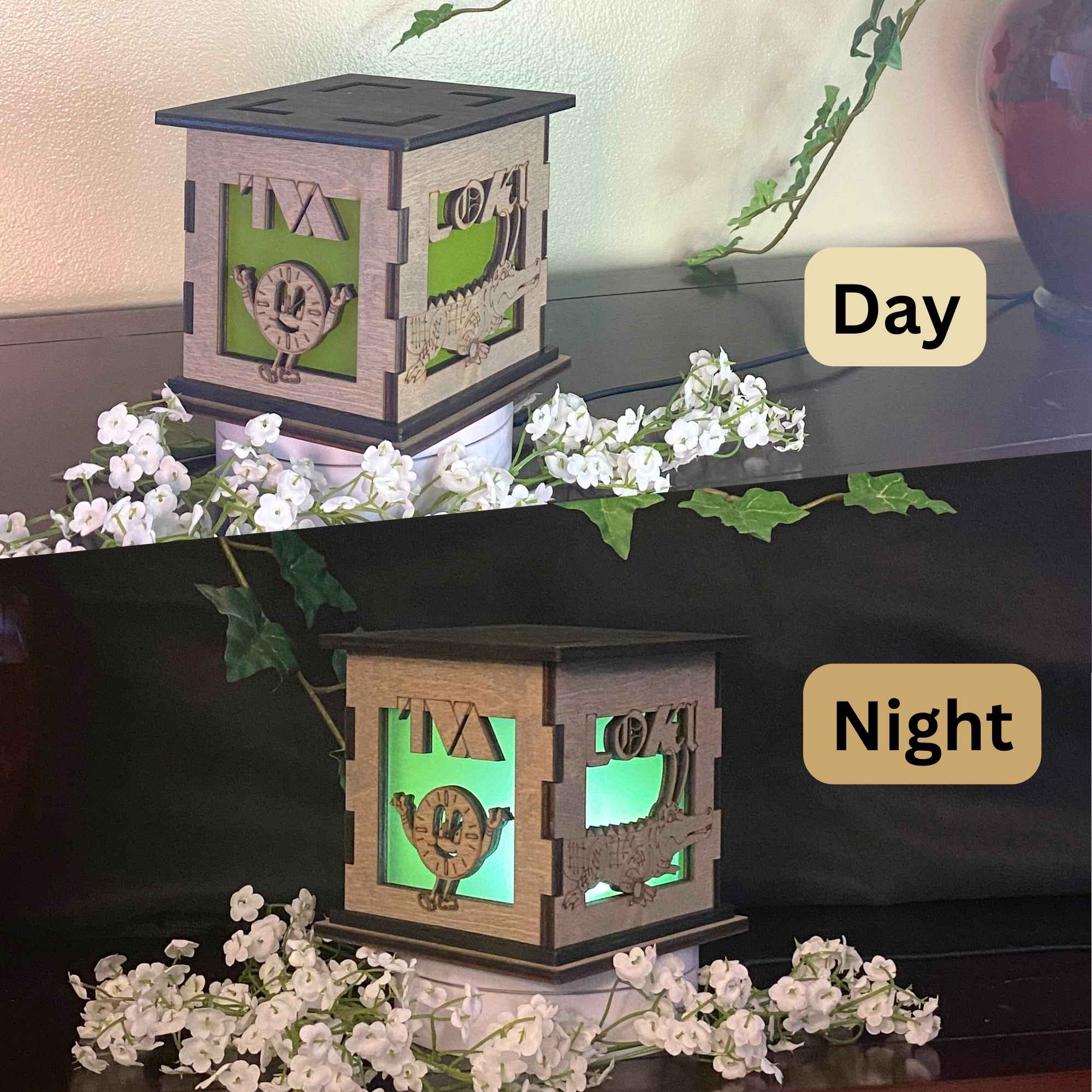 This nightlight measures at 5″ on each side. Creating a cubed box that is an excellent decorative keepsake for your table, shelf, mantle, bedside, desk and more. Beautifully stained grey to match any existing home décor. Lined with a colored translucent filter that gives your box a pop of color even when not lit up. Featured on the top is a painted black top with four cut outs featuring the same color on display on the sides. The black top and rim contrast against the grey and give the box an overall elegant look. The lamp comes with a white tea light that allows the box to give off its glow. These details result in a candle holder that has that unique combination of nerdy with sophistication. Giving the option to display your passions while not taking away from keeping a beautiful home.