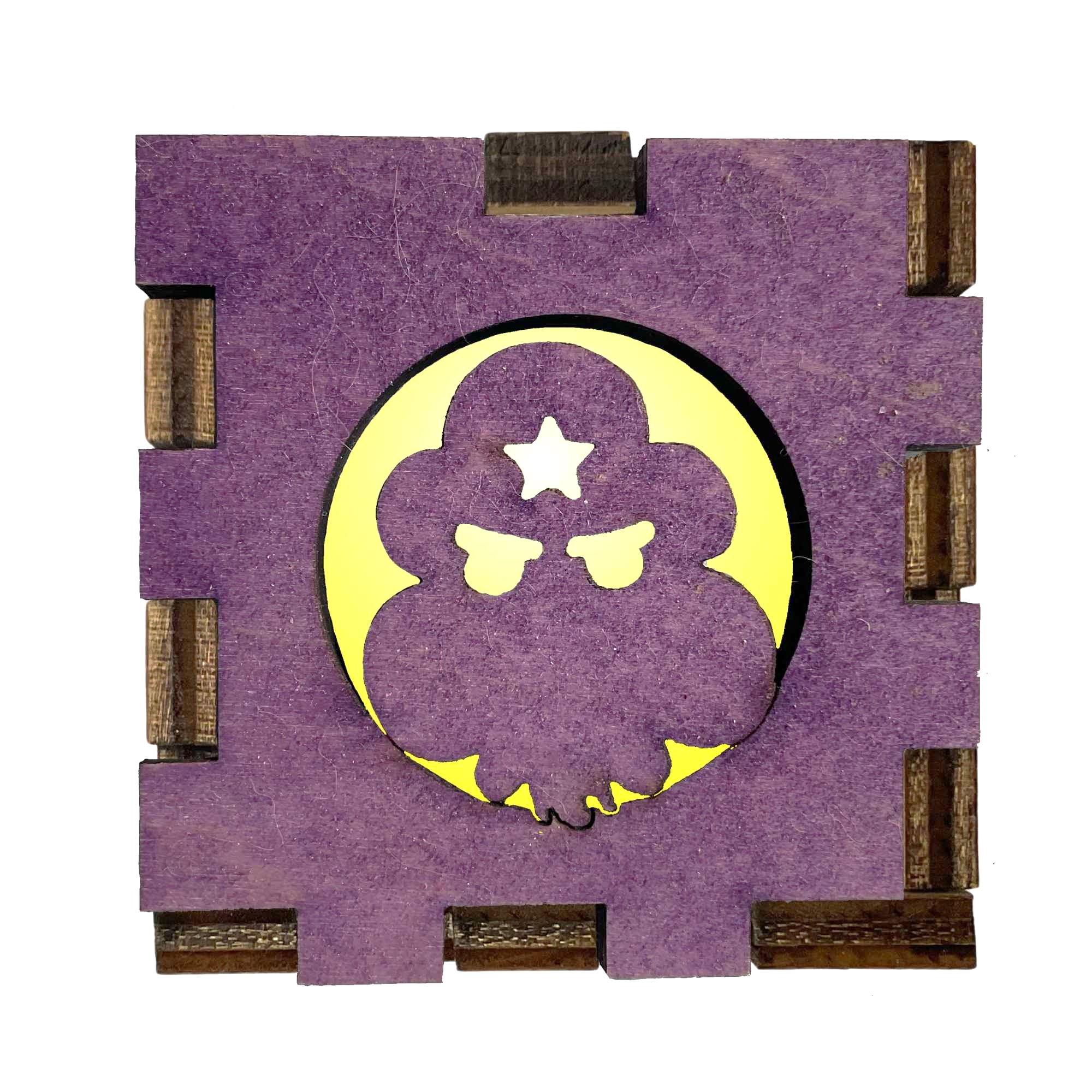 If you’re feeling dramatic, fabulous, and a little chaotic, then this Lumpy Space Princess Light Box is for you. Crafted with a purple-stained wood front and laser-cut LSP silhouette, this box is as bold as her attitude. Light it up with a flickering LED tea light and six color filter options (yellow, red, green, blue, pink, and white) to give your princess the perfect glow.