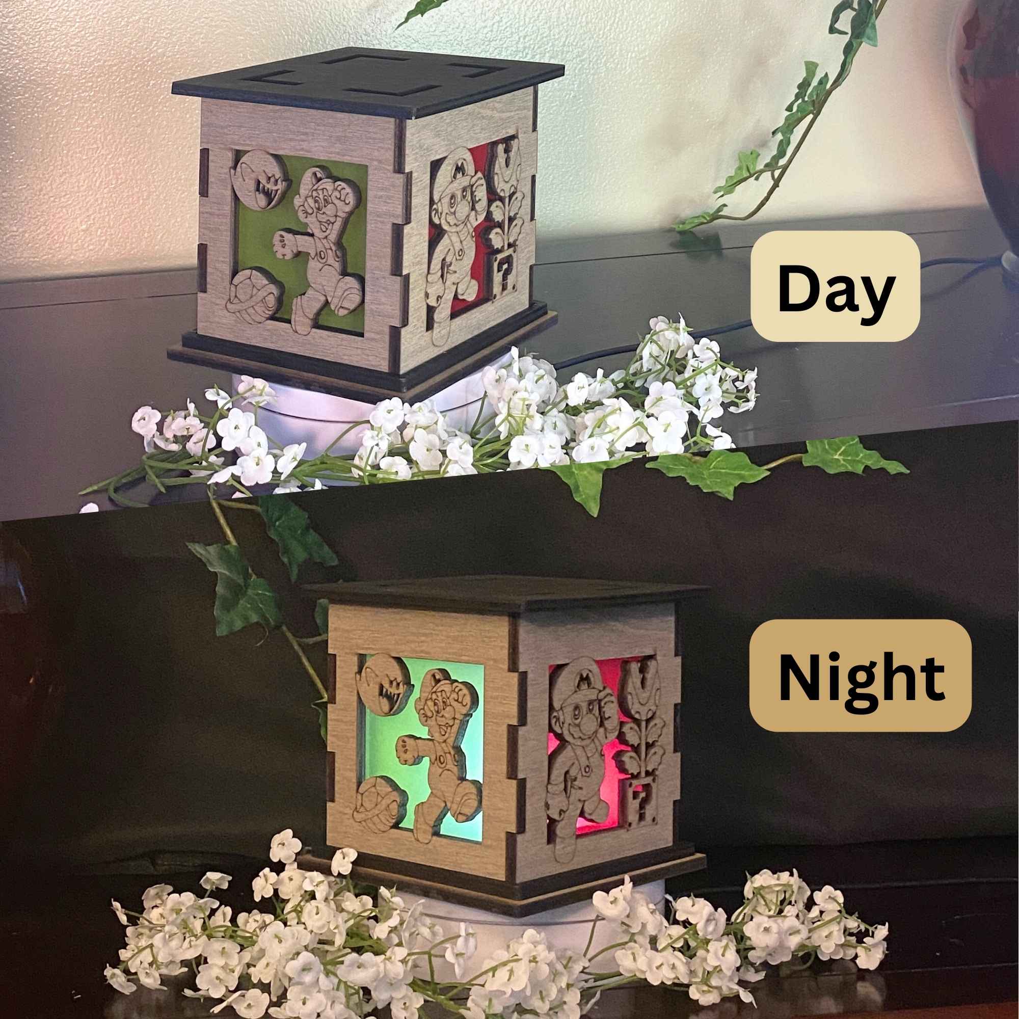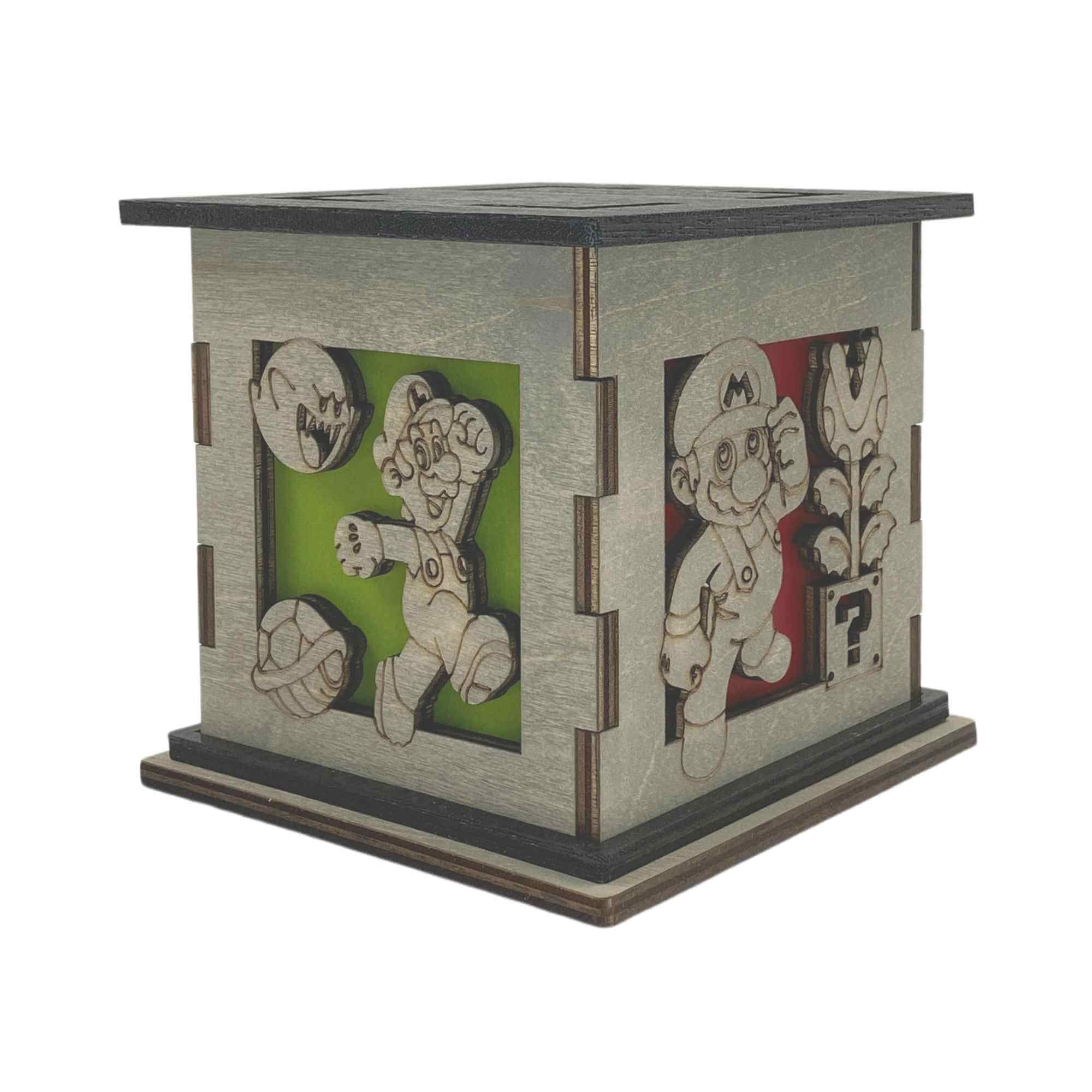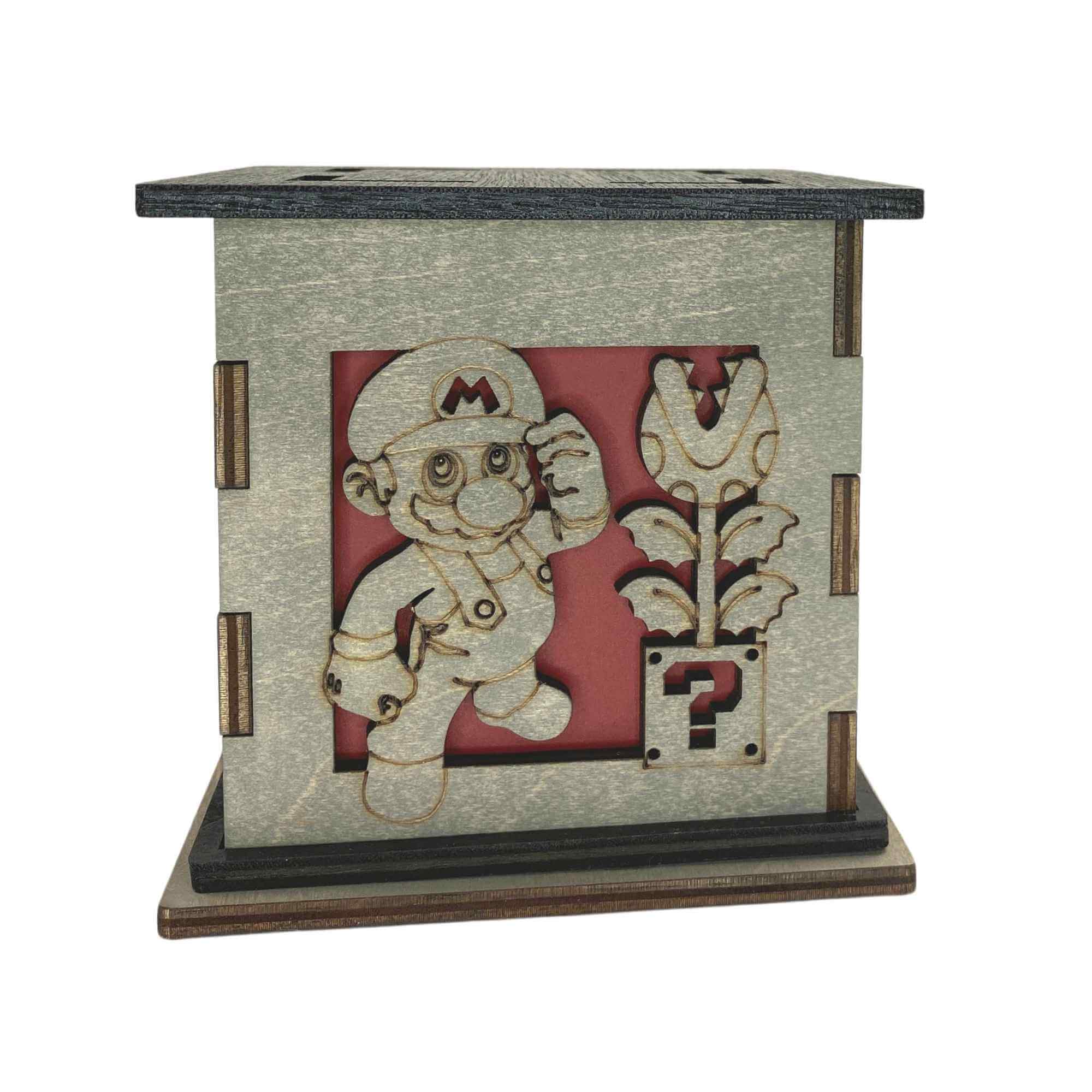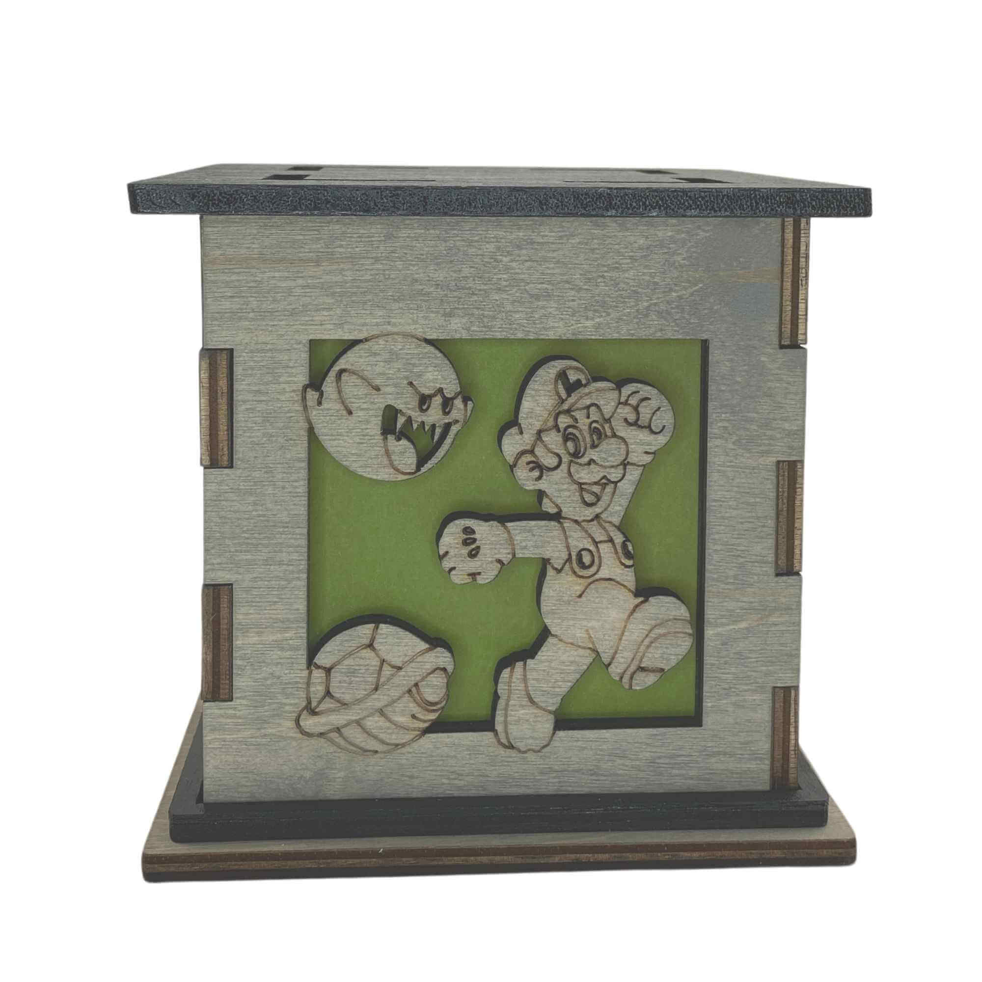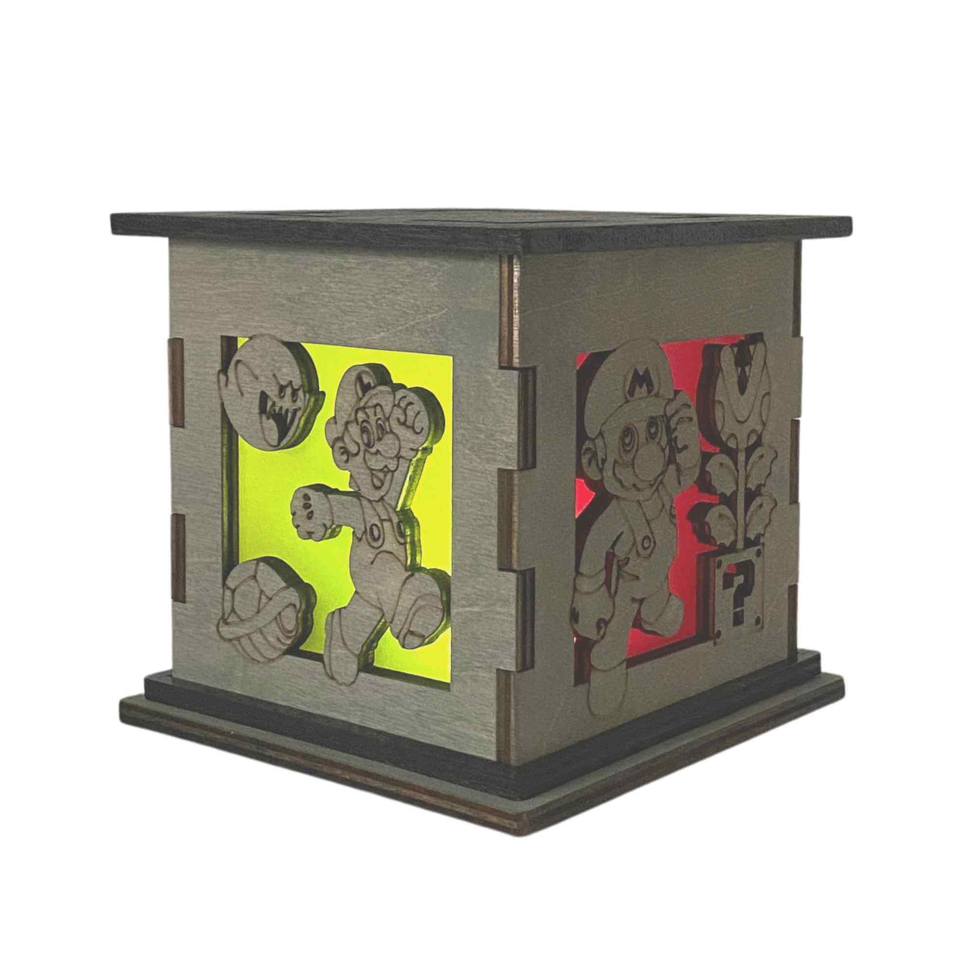 This nightlight measures at 5″ on each side. Creating a cubed box that is an excellent decorative keepsake for your table, shelf, mantle, bedside, desk and more. Beautifully stained grey to match any existing home décor. Lined with a colored translucent filter that gives your box a pop of color even when not lit up. Featured on the top is a painted black top with four cut outs featuring the same color on display on the sides. The black top and rim contrast against the grey and give the box an overall elegant look. The Mario Bros. Light Box comes with a white tea light that allows the box to give off its glow. These details result in a candle holder that has that unique combination of nerdy with sophistication. Giving the option to display your passions while not taking away from keeping a beautiful home.
