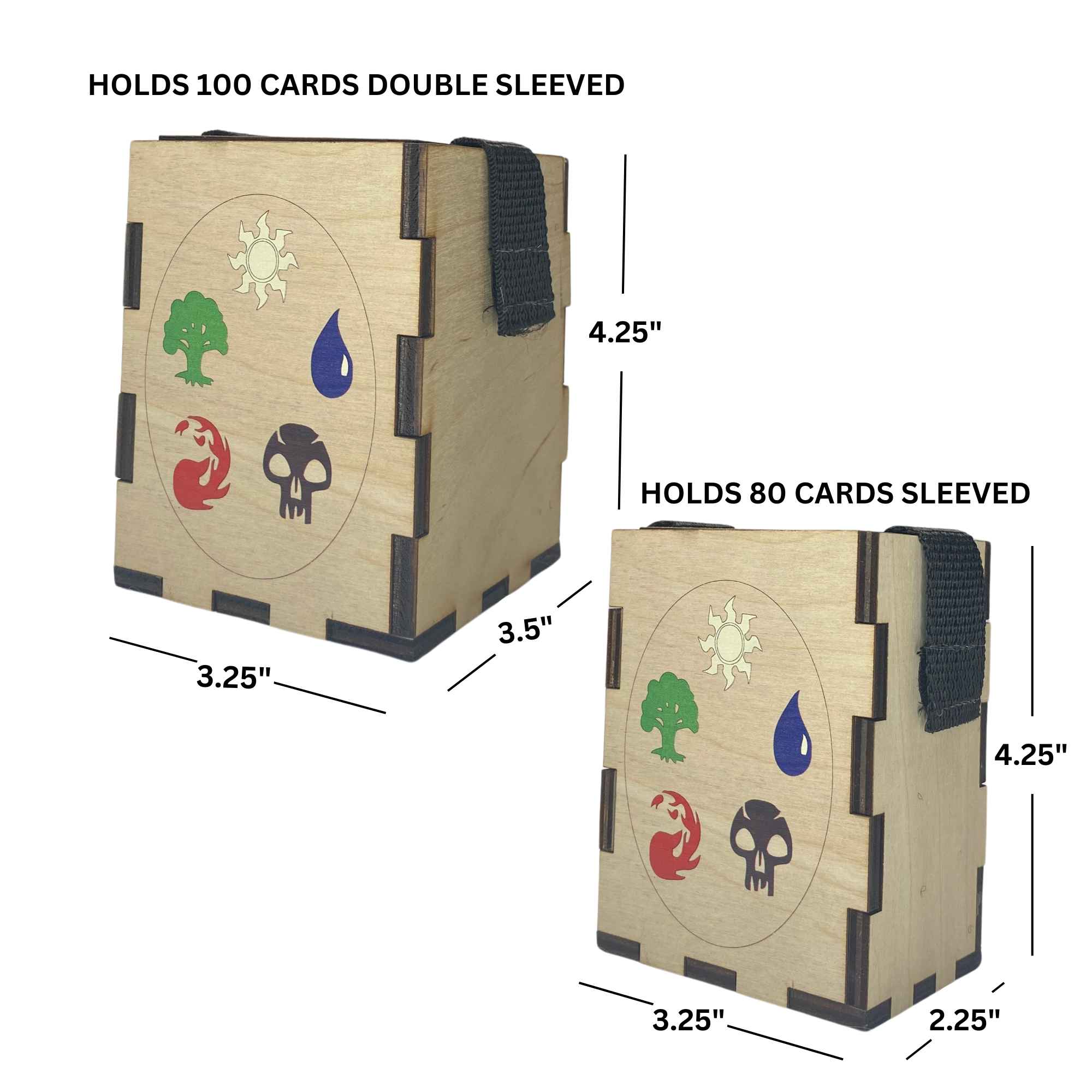 Available in two sizes, both measure 3.25″ wide in the front and stand 4.25″ tall.  The Single Box is 2.25″ and the Commander Box is 3.5″ in depth.  These boxes are designed to cater to different needs and deck sizes.  The Single size comfortably accommodates up to 80 cards sleeved, ensuring your prized collection stays organized and protected. Meanwhile, the Commander size is perfect for larger decks, fitting up to 120 cards sleeved or 100 double sleeved cards. Whether you’re a casual player or a seasoned strategist, our deck boxes offer versatile storage solutions.