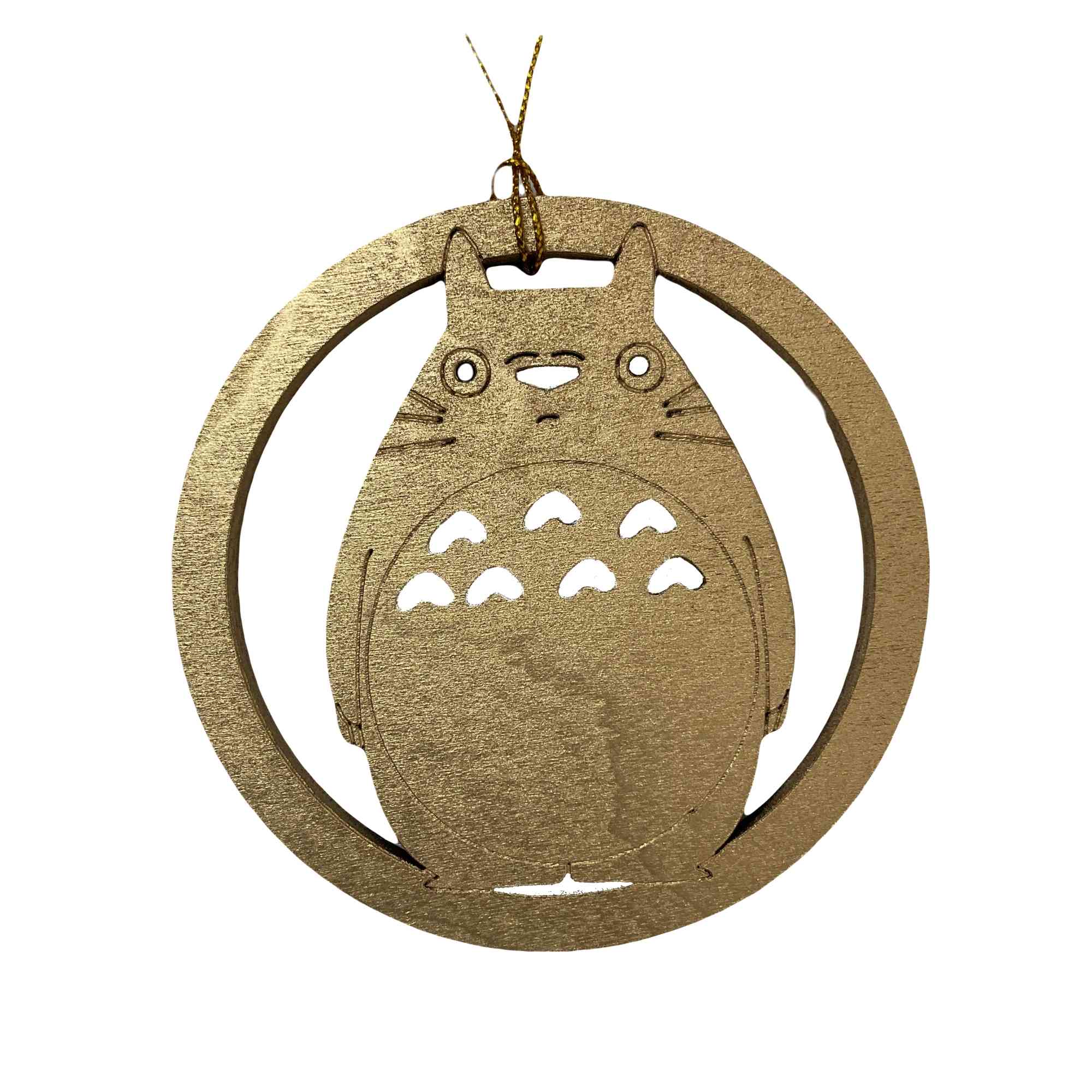 This ornately designed Studio Ghibli My Neighbor Totoro Ornament or Gift Tag is approximately 3.75″ in diameter and makes a great Christmas tree decoration or gift embellishment. A beautiful keepsake, made from wood and cut through with the front side engraved providing a greater detailed ornament. Both sides are painted a shiny gold and includes a gold metallic cord so it is ready to be hung on your Christmas Tree or utilized as a gift tag. The lightweight design makes it easy to hang.
