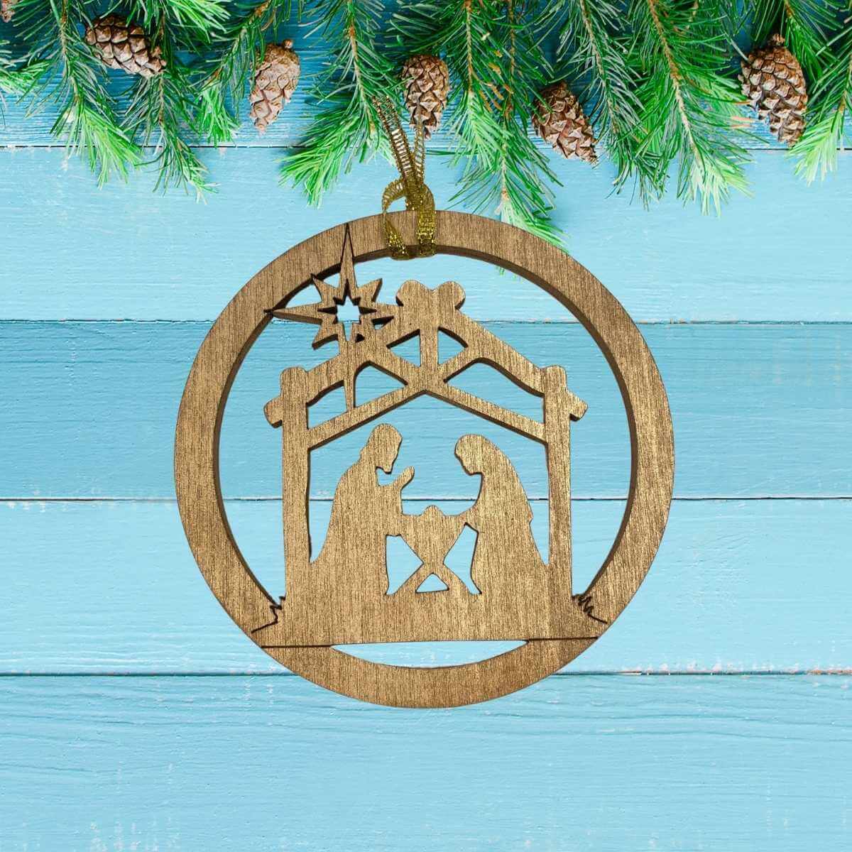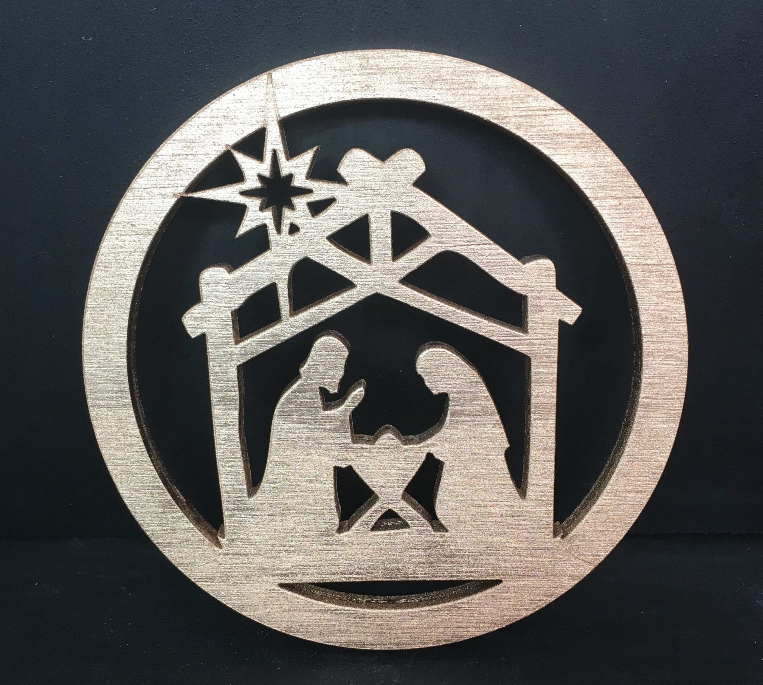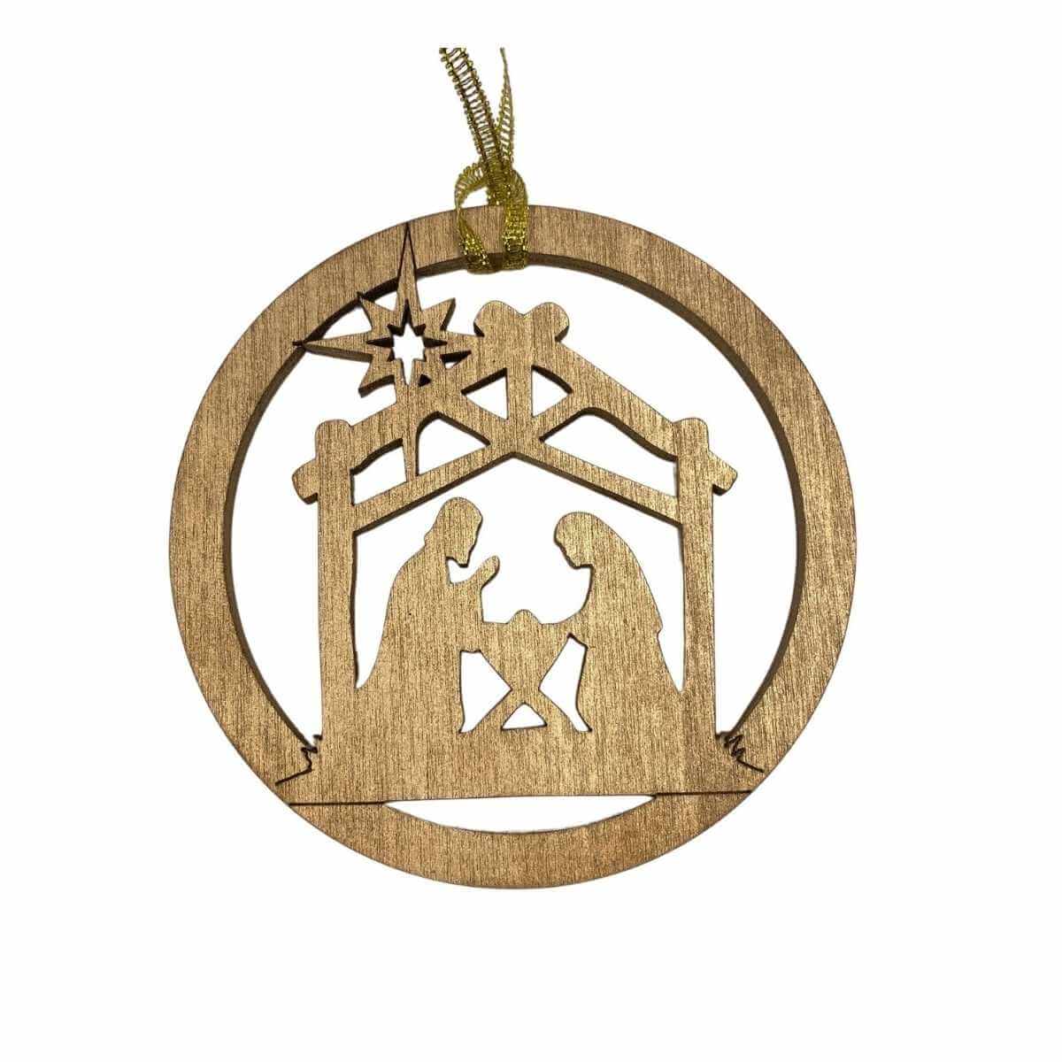 Nativity Christmas Ornament is approximately 3.75″ in diameter. Made from wood and painted gold on both sides. The ornament is cut through with the front side engraved providing greater detail. Each ornament comes with a hanging gold string so it’s ready to adorn your Christmas Tree.