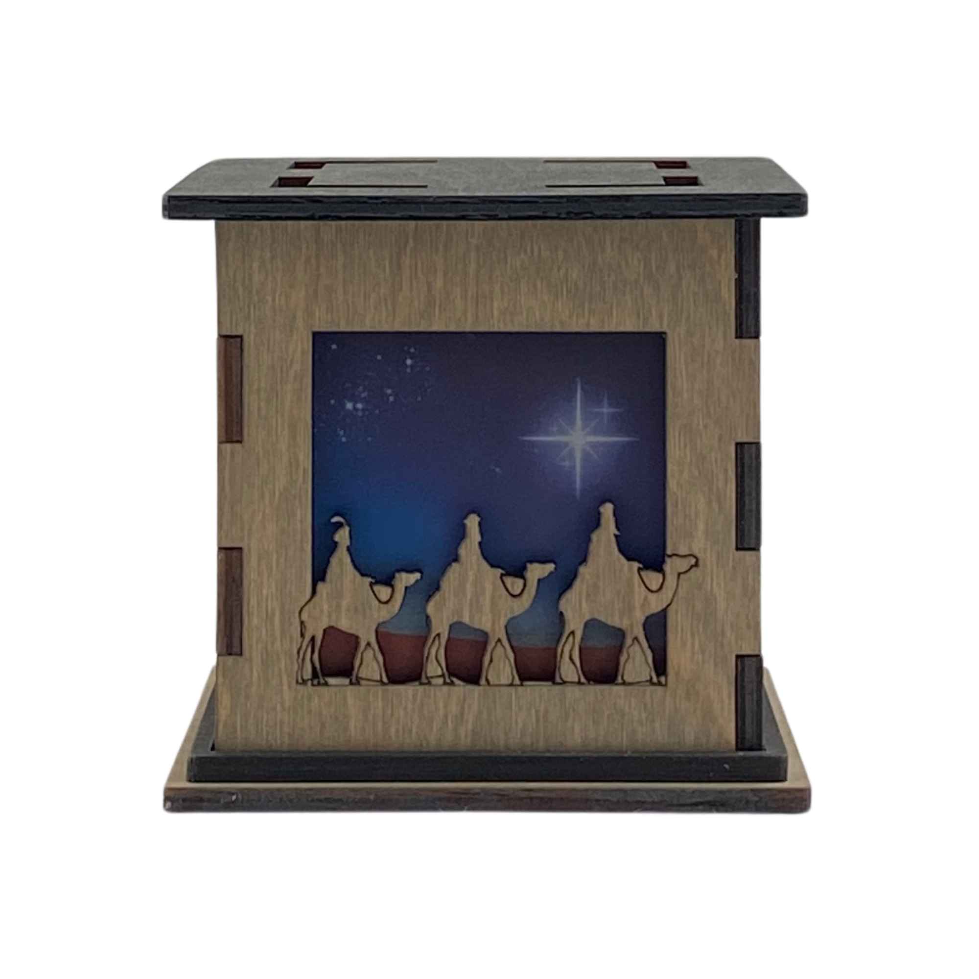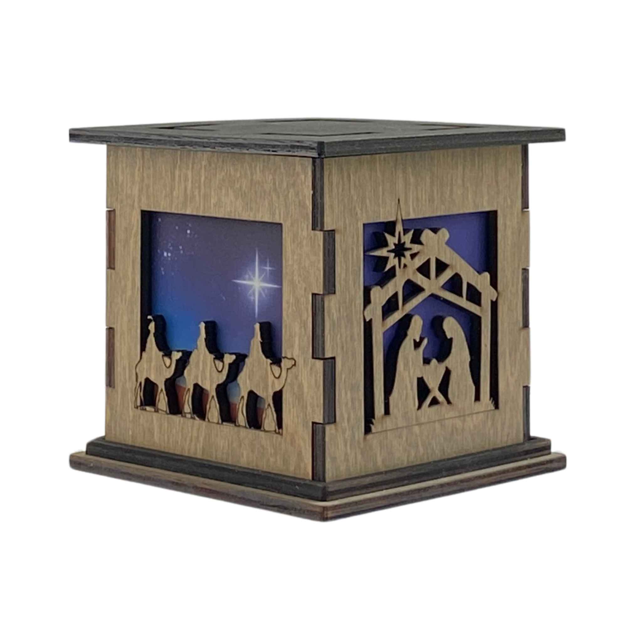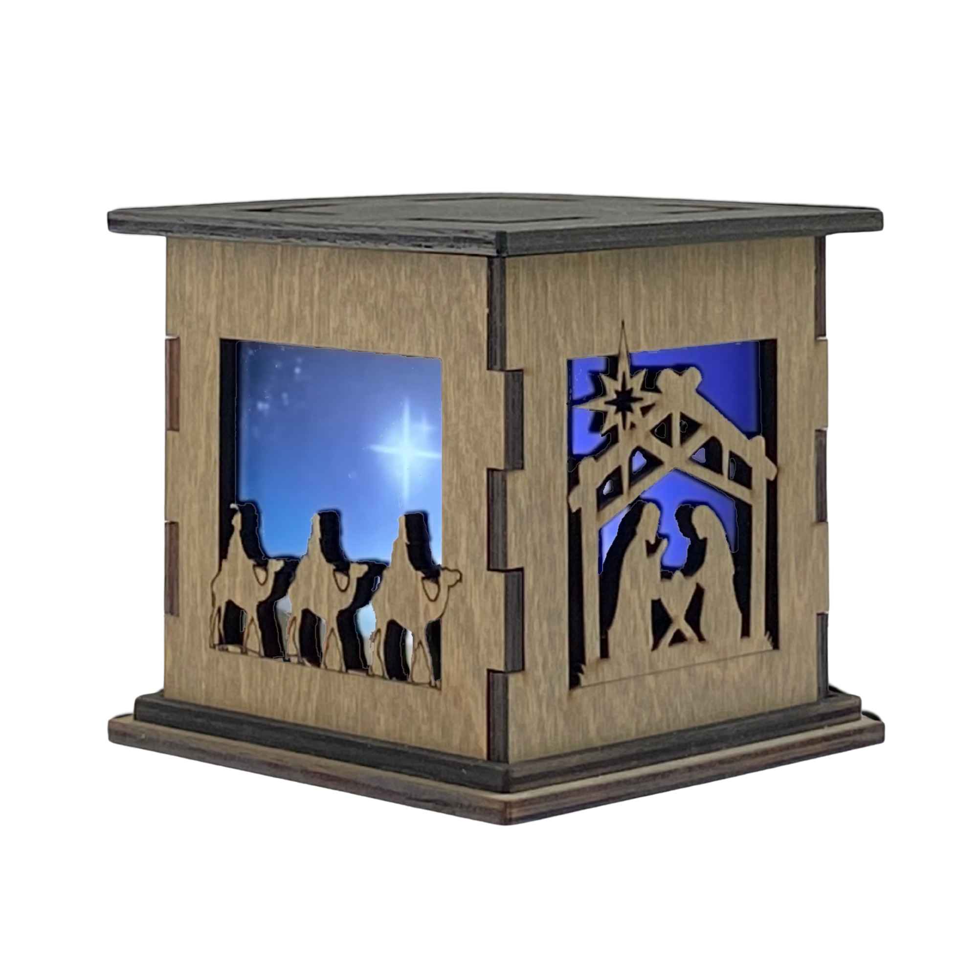 Bring the Christmas spirit to life with the Christmas Nativity Glow Box. This beautiful, handcrafted wooden light up box features a stunning Nativity scene. One side showcases the journey of the Three Wise Men following the North Star. While the other side features a serene manger scene with Baby Jesus. Also, while the nativity scene is accompanied by a blue translucent filter, the Three Wise Men’s journey features a custom printed filter to showcase the North Star. These details make it the perfect way to add a glowing touch to your holiday decorations.