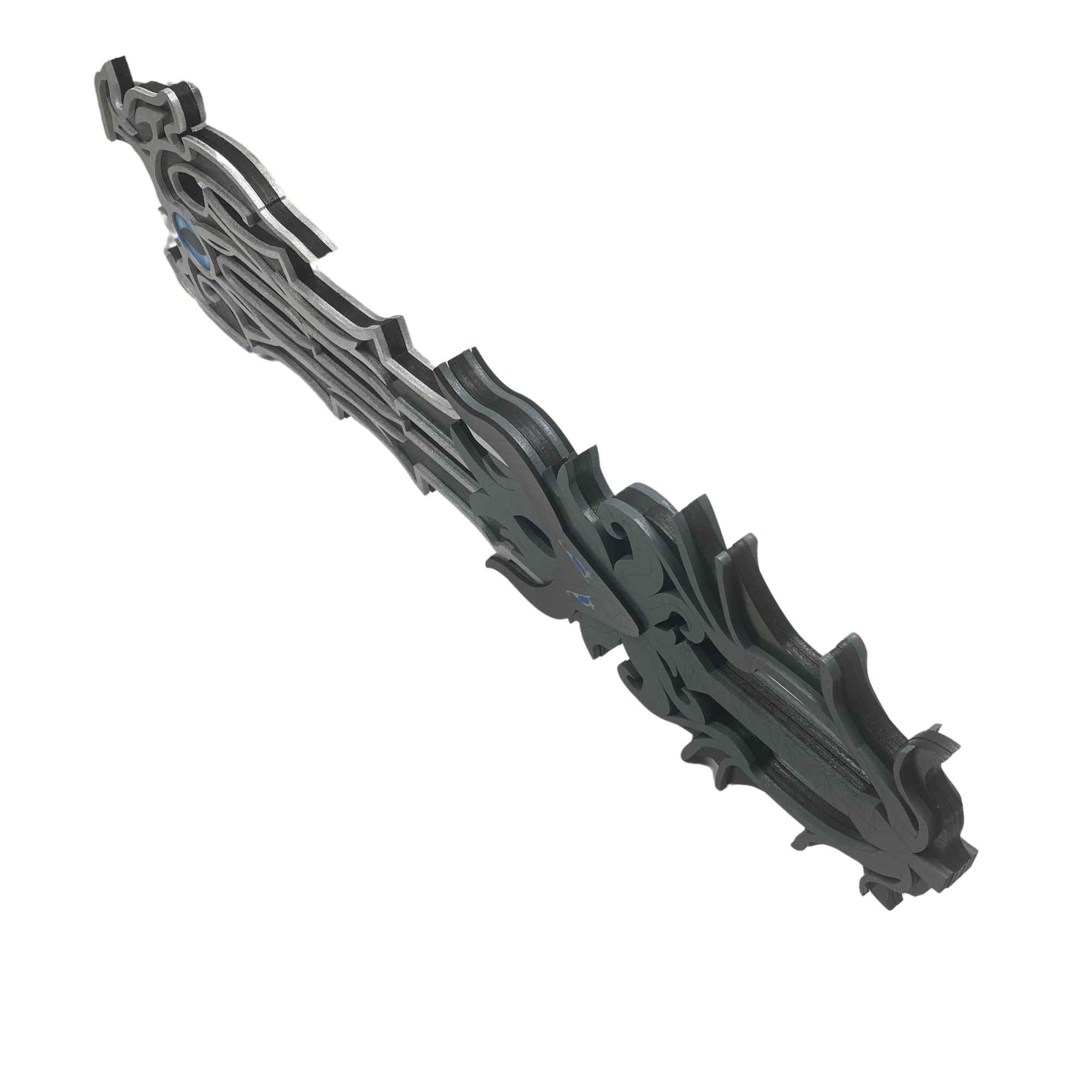 No Name Keyblade is hand crafted from layered ¼” thick wood, the costume replicas are durable and light weight. These layers provide structure and remarkable detail to create a replica as close to the original source as possible. After we have sanded, primed, painted, glued and micro nailed each layer together creating a strong and durable fully immersive cosplay accessory. These are highly decorated replica pieces made for the imagination; we do not encourage actual LARPing as paint and more delicate sections are prone to damage on collisions.
