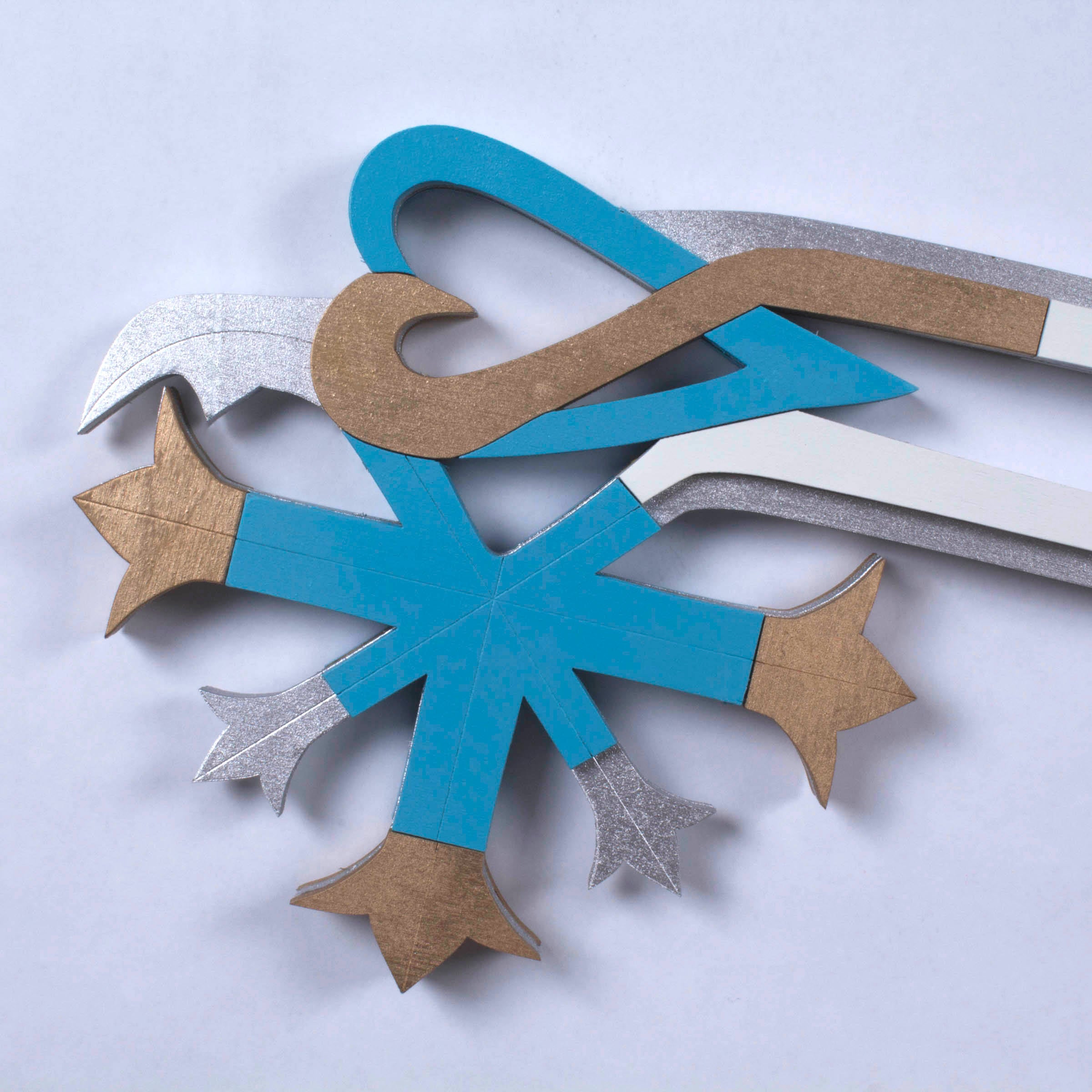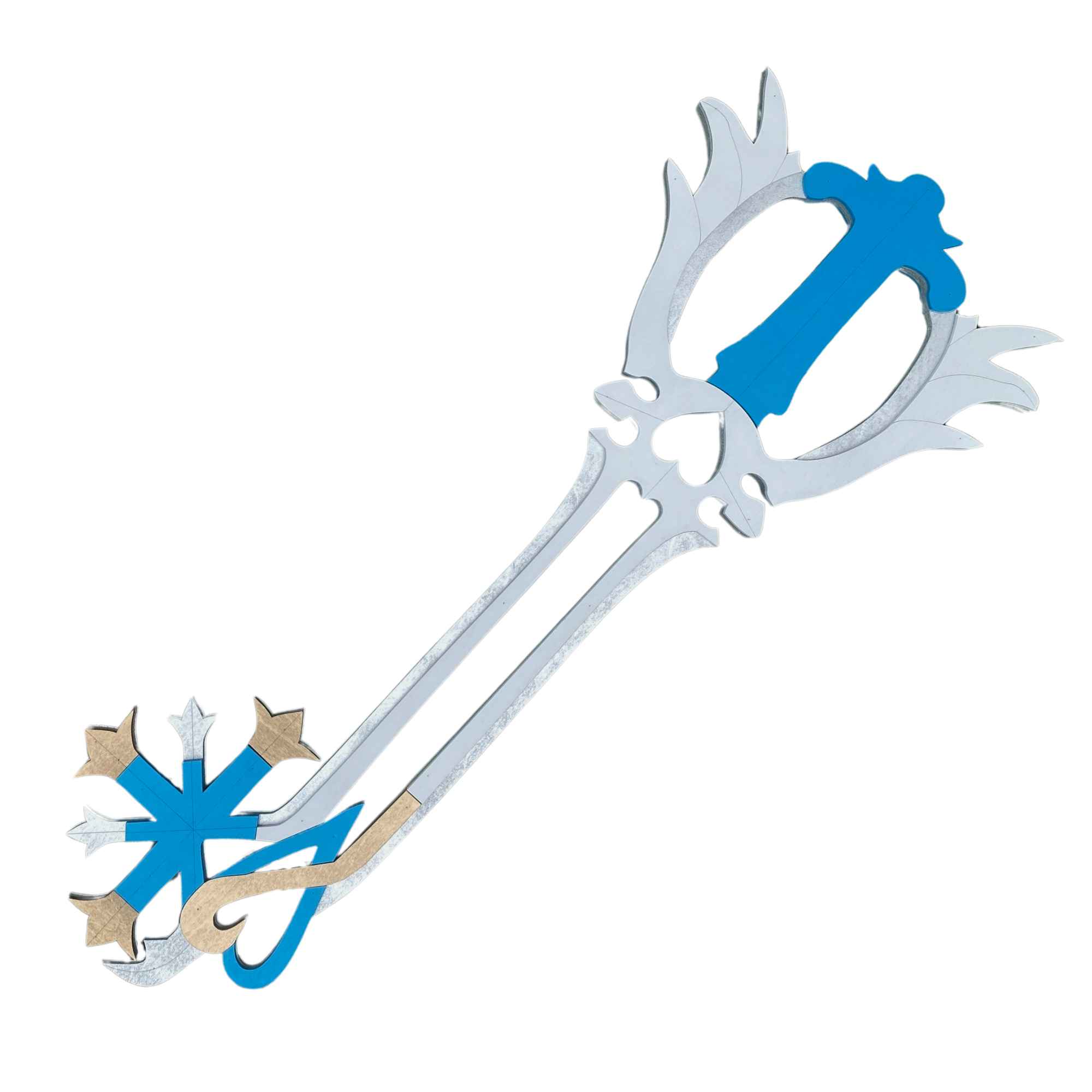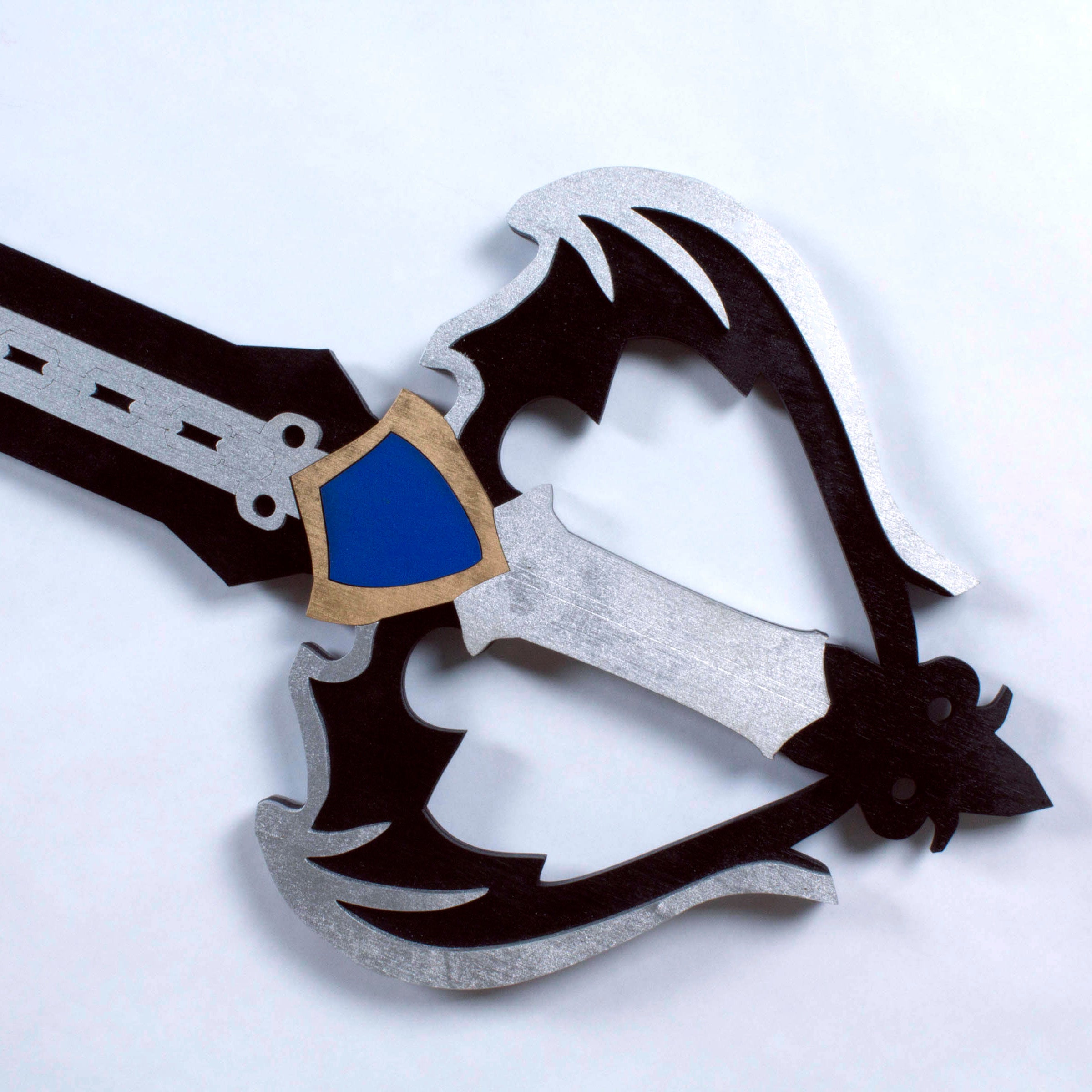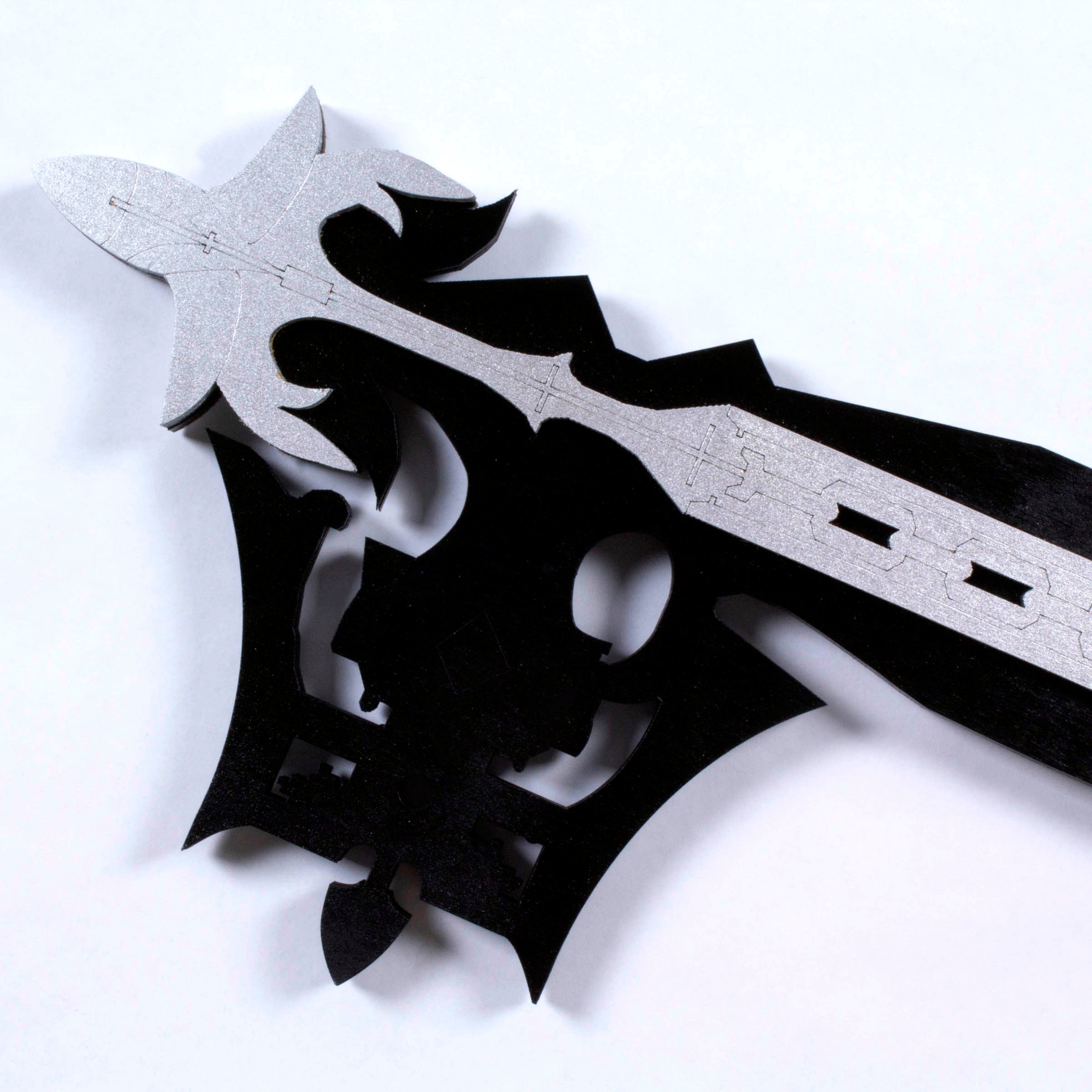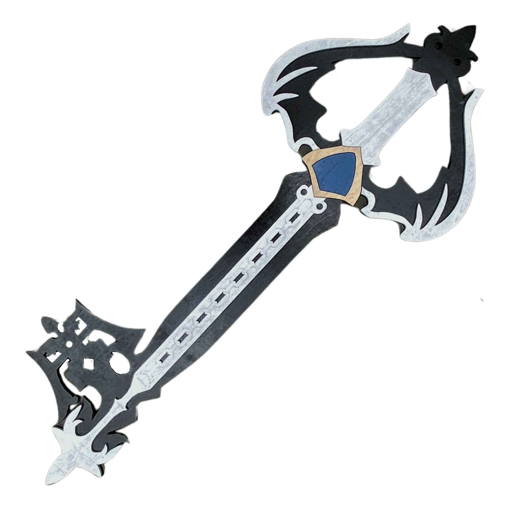 Oathkeeper and/or Oblivion Keyblade is hand crafted from layered ¼” thick wood, the costume replicas are durable and light weight. These layers provide structure and remarkable detail to create a replica as close to the original source as possible. After we have sanded, primed, painted, glued and micro nailed each layer together creating a strong and durable fully immersive cosplay accessory. These are highly decorated replica pieces made for the imagination; we do not encourage actual LARPing as paint and more delicate sections are prone to damage on collisions.