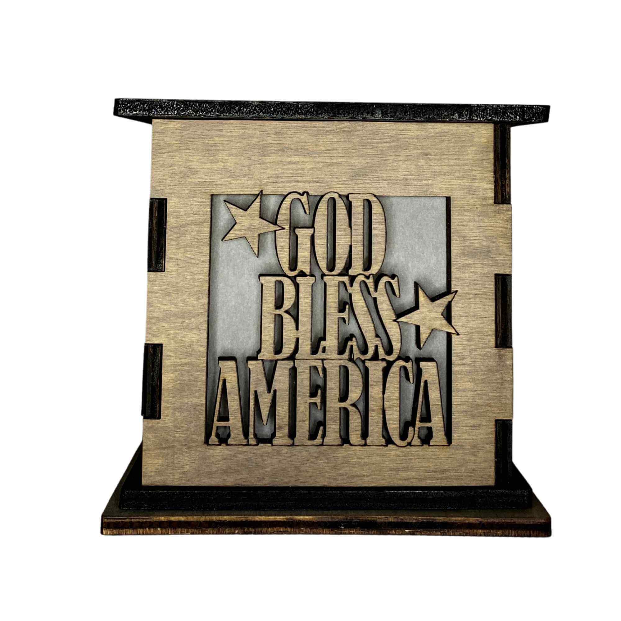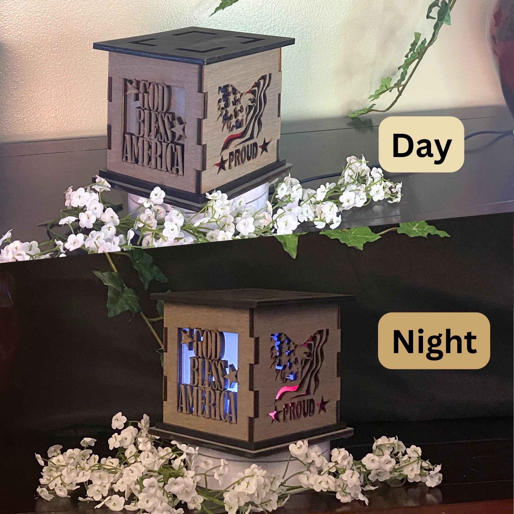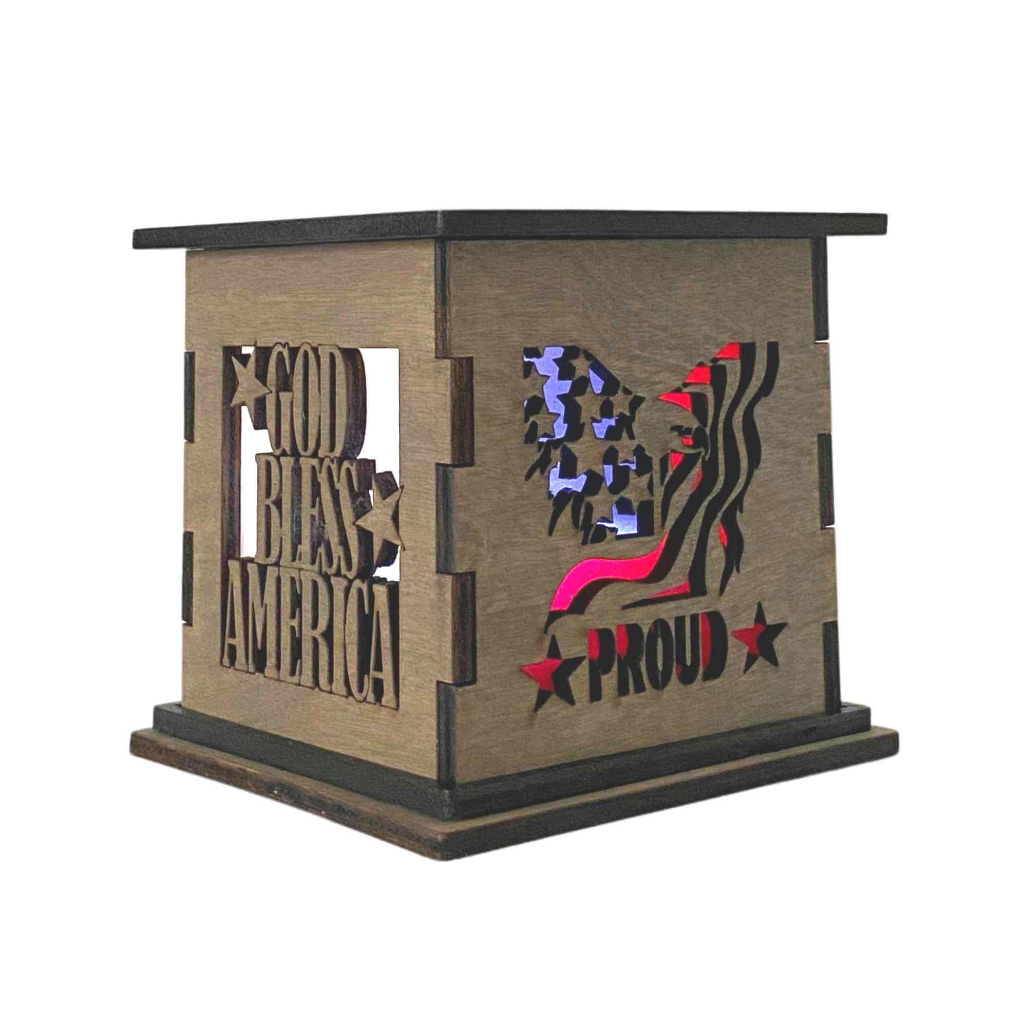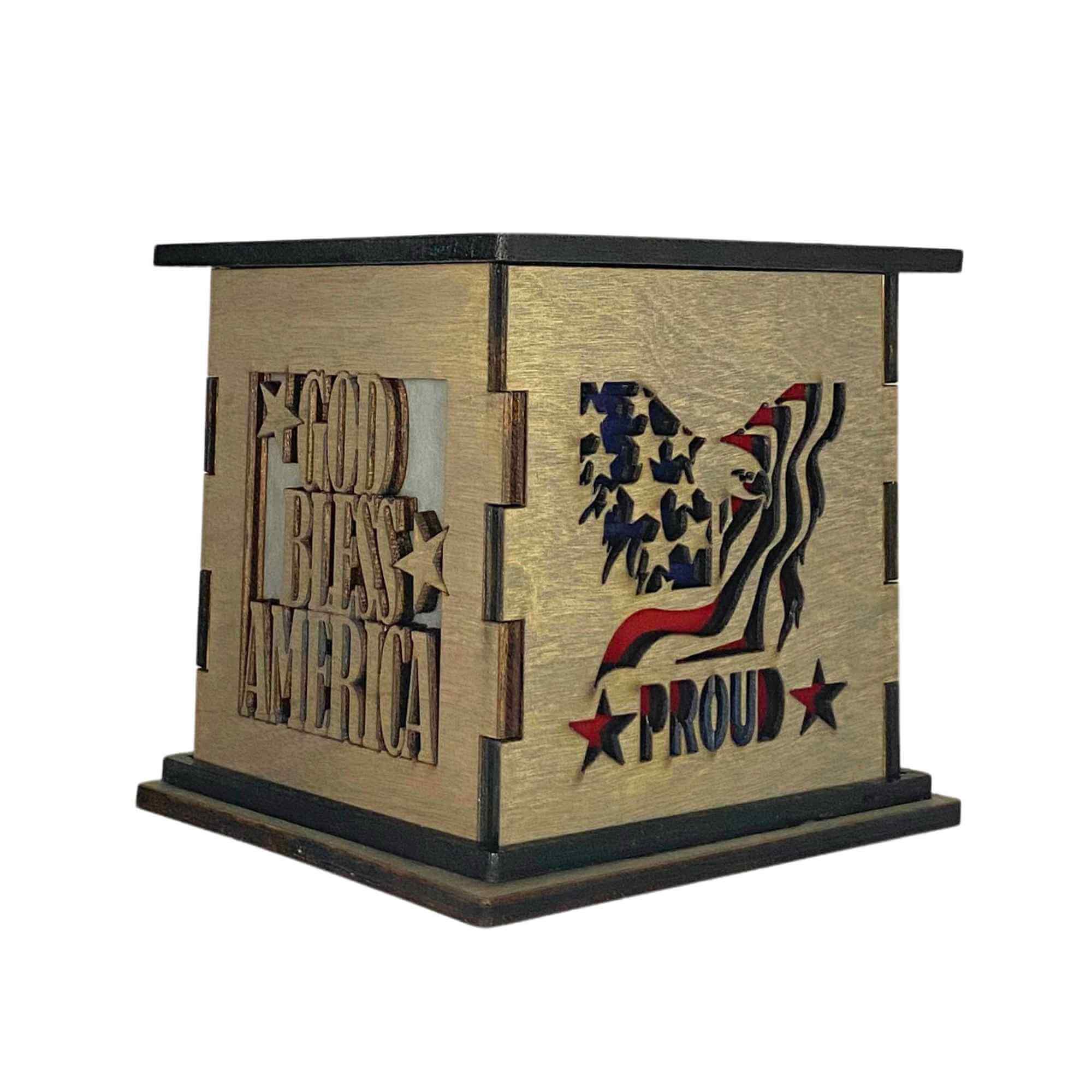 Celebrate our country and those that protect it with our Patriotic Light Up Box. Decorated with laser etching on two sides. The Patriotic box featuring the cut-out design of the words “God Bless America” among stars. The other decorated side on is an eagle in the shape of the United States flag.  This side sits in front of both red and blue translucent filters, while the other side features white.  Allowing a simple white tealight LED candle to glow through and produce the colors of the US flag.