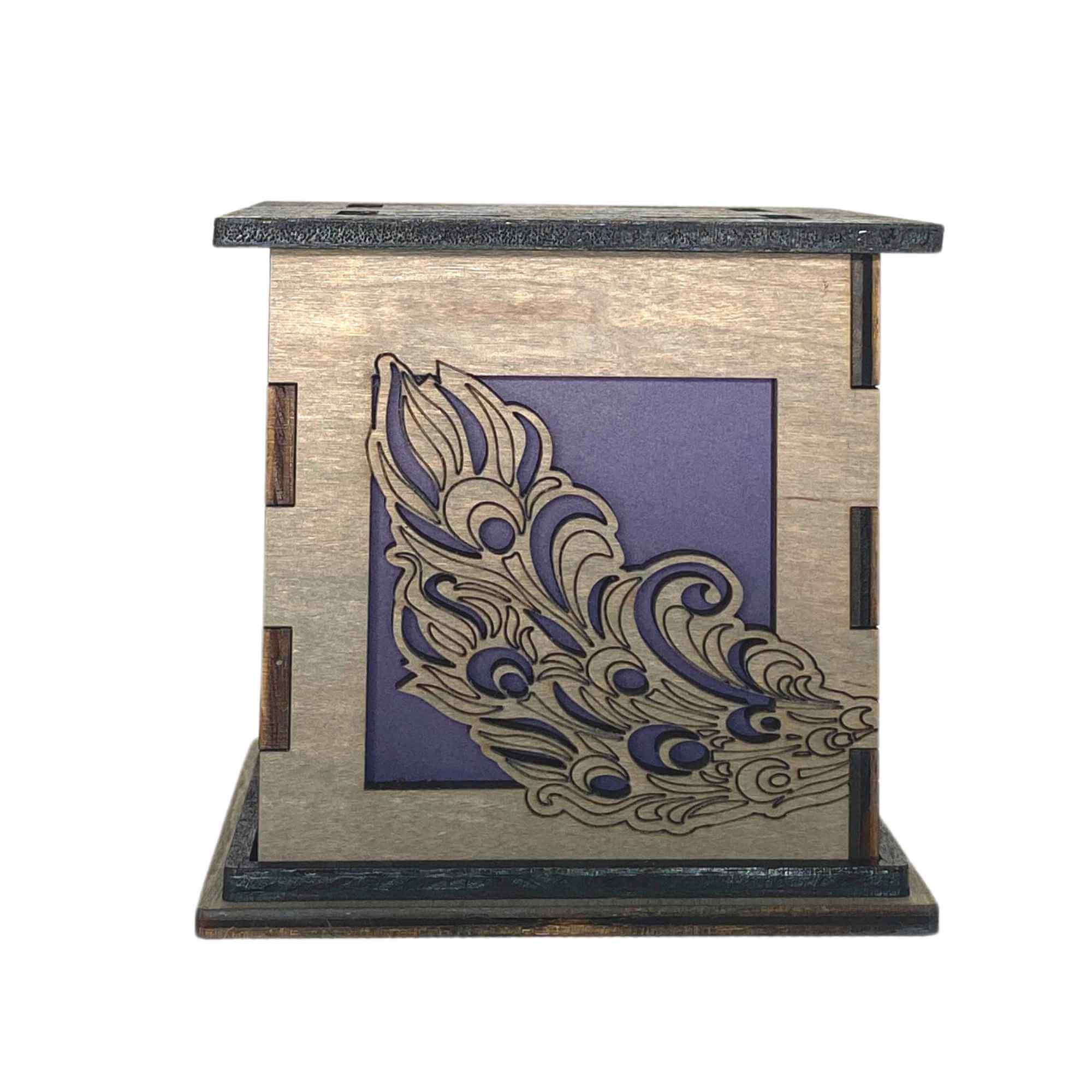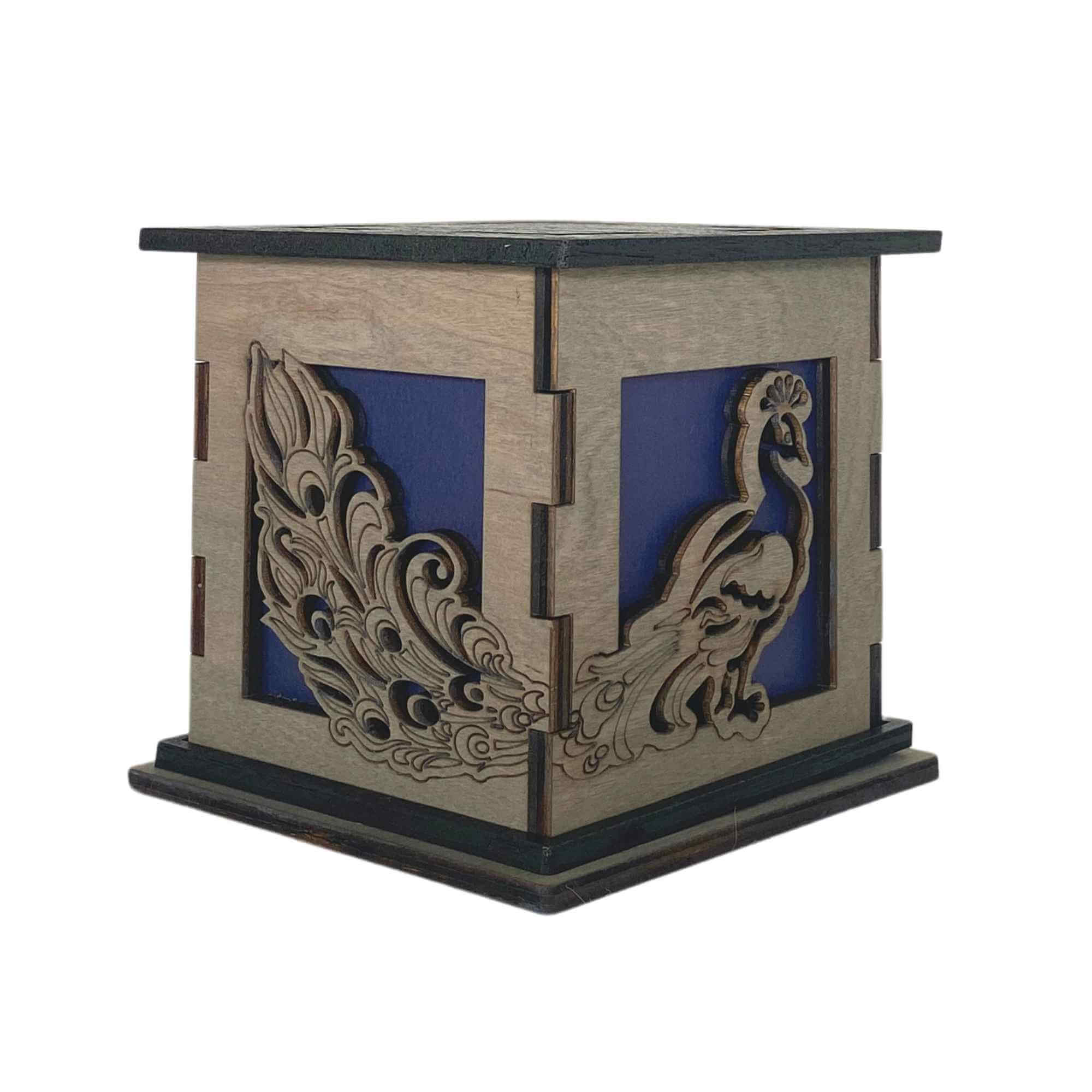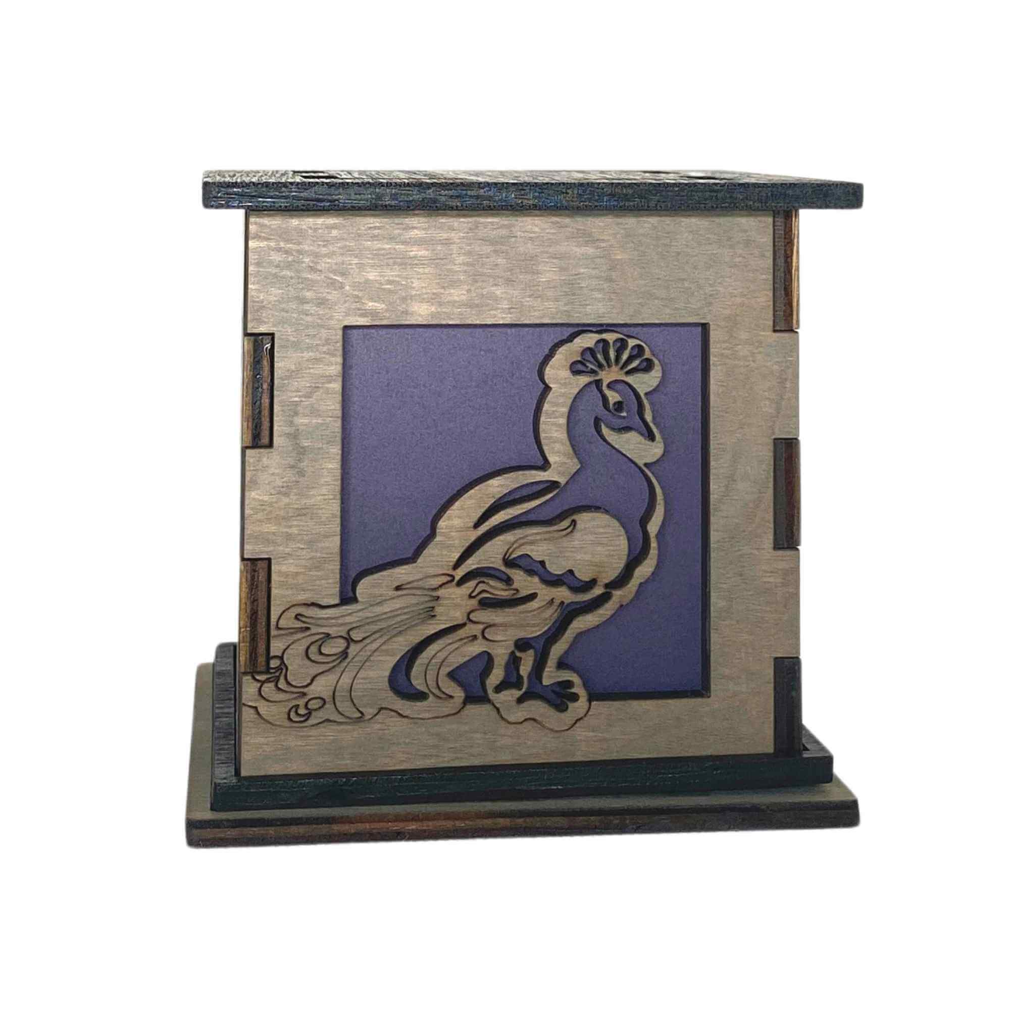 Bring the beauty of this colorful exotic bird into your home with the Peacock Light Up Box. Decorated on two sides with beautiful laser engraved and cut sides. One side features the head and body of a peacock. While the other side features the continuing plumage in the tail in wondrous detail. Each of these sides sits in front of a blue translucent color filter that along with the included LED tea light allow the box to glow.