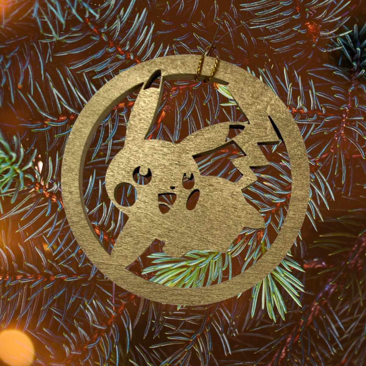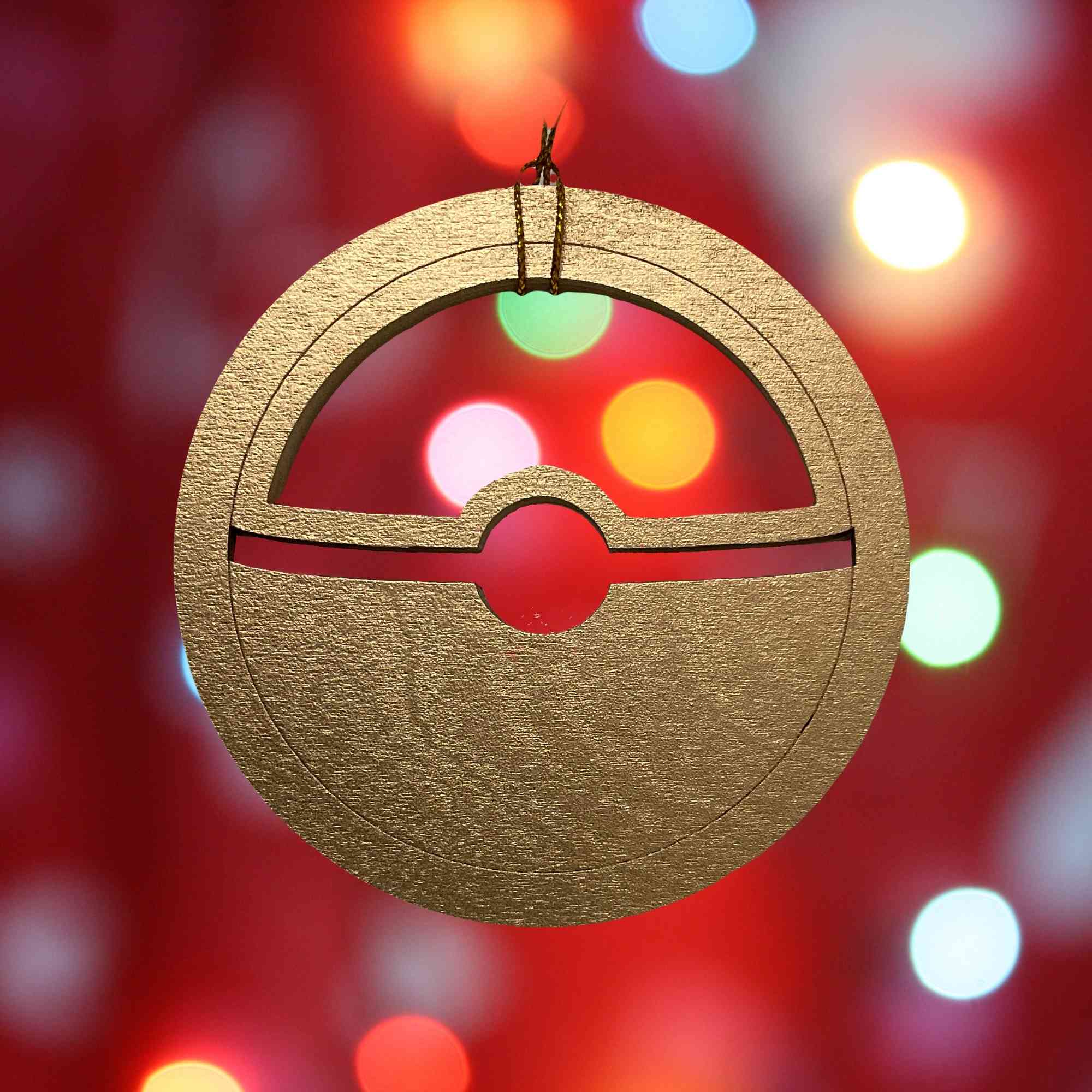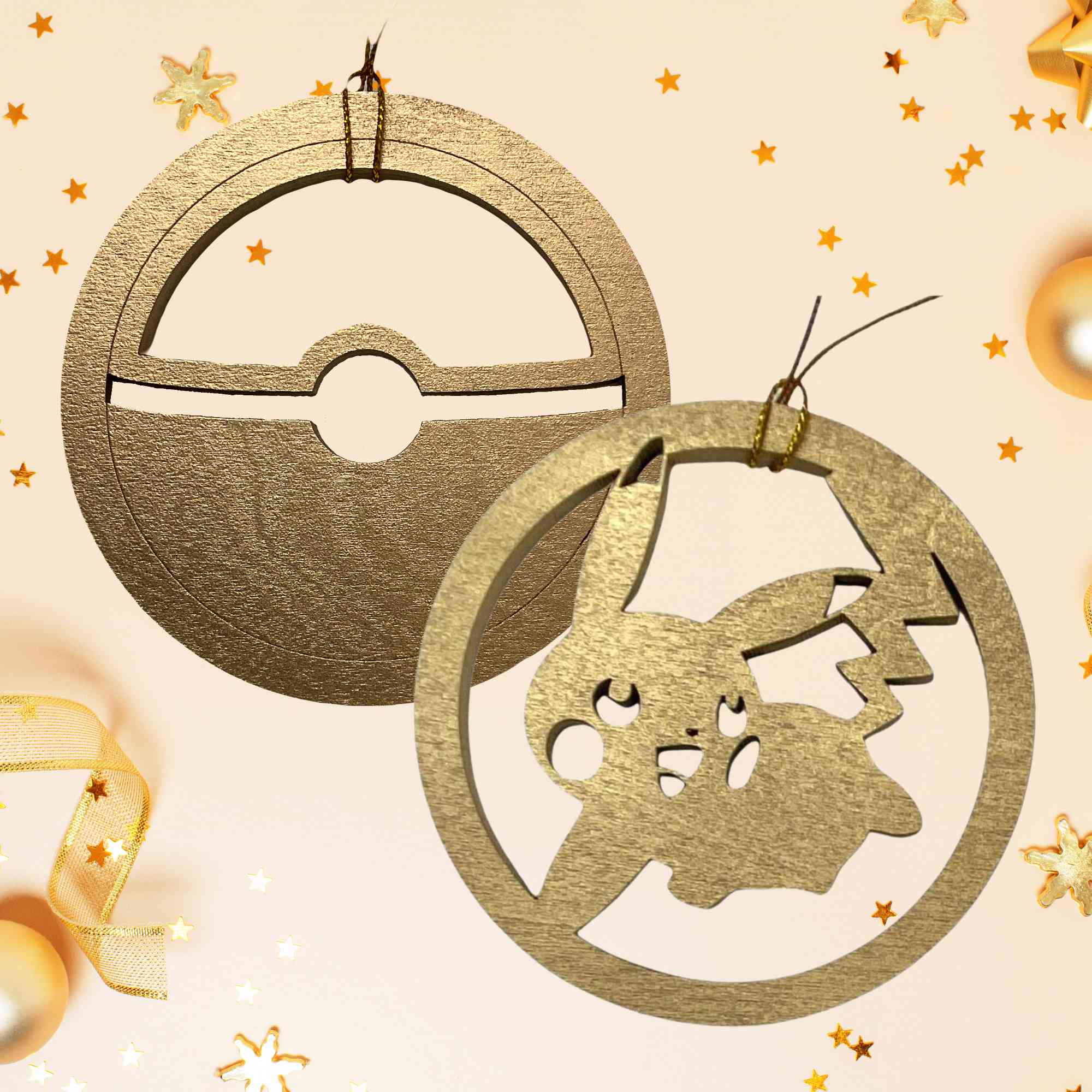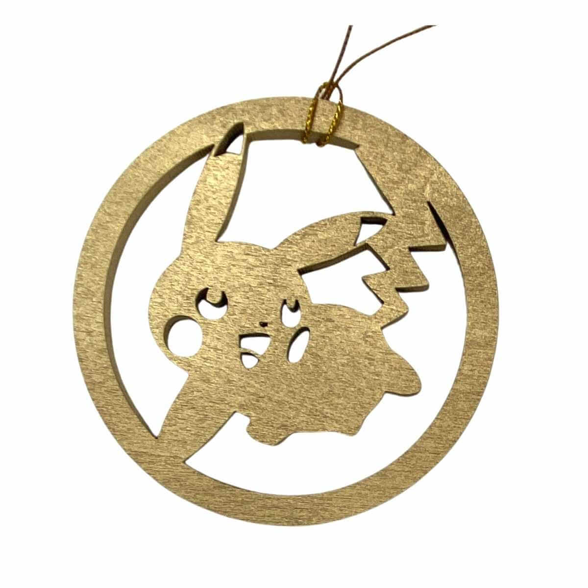 This ornately designed Pokemon Pikachu or Pokeball Ornament or Gift Tag is approximately 3.75″ in diameter and makes a great Christmas tree decoration or gift embellishment.  A beautiful keepsake, made from wood and cut through with the front side engraved providing a greater detailed ornament.  Both sides are painted a shiny gold and includes a gold metallic cord so it is ready to be hung on your Christmas Tree or utilized as a gift tag.  The lightweight design makes it easy to hang.