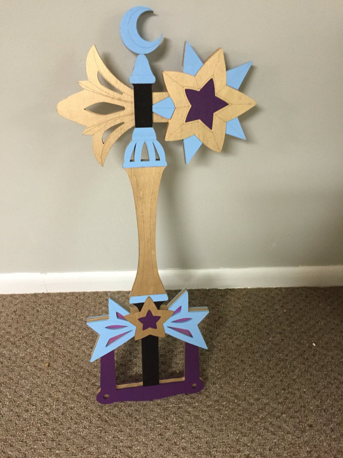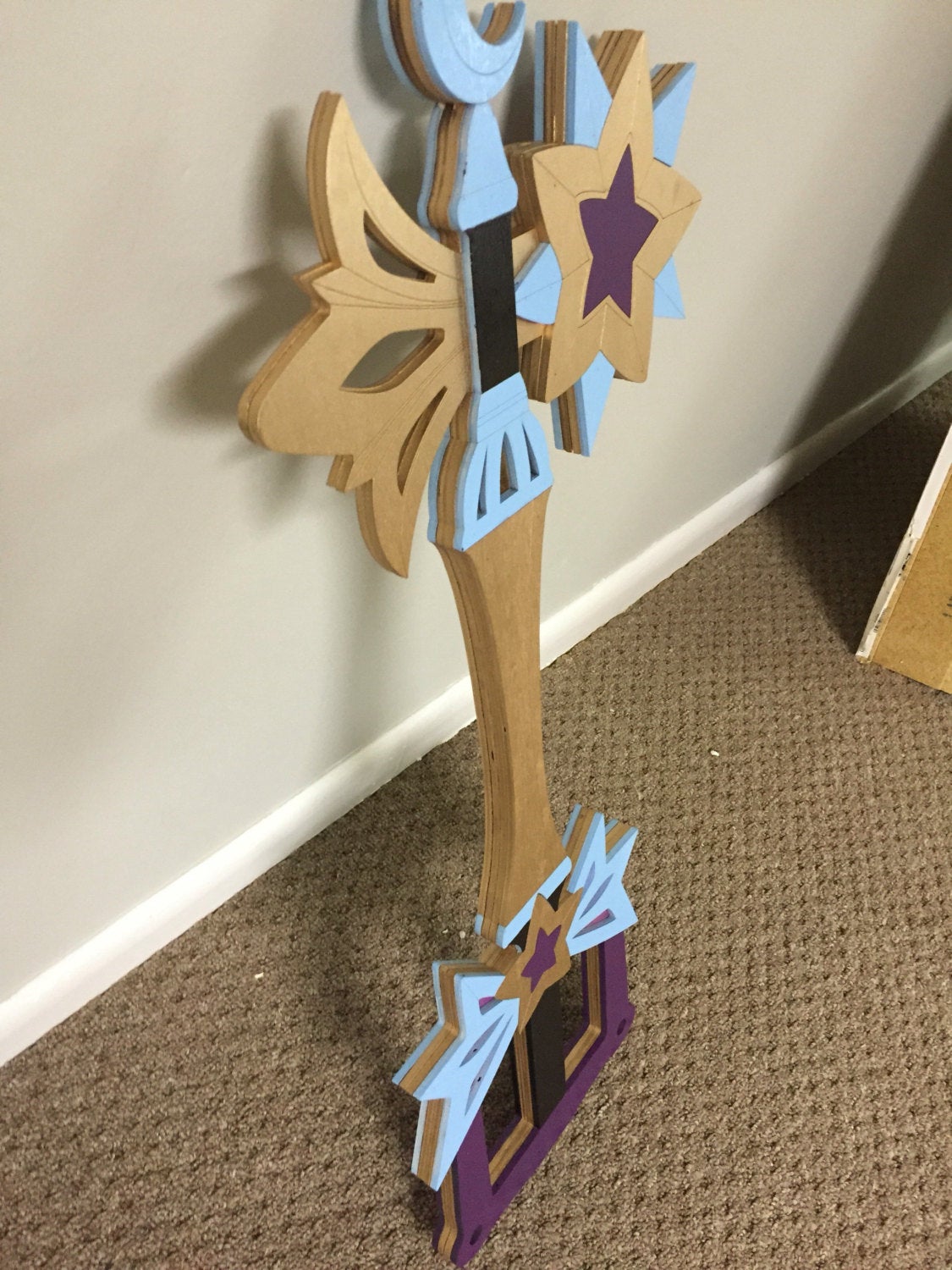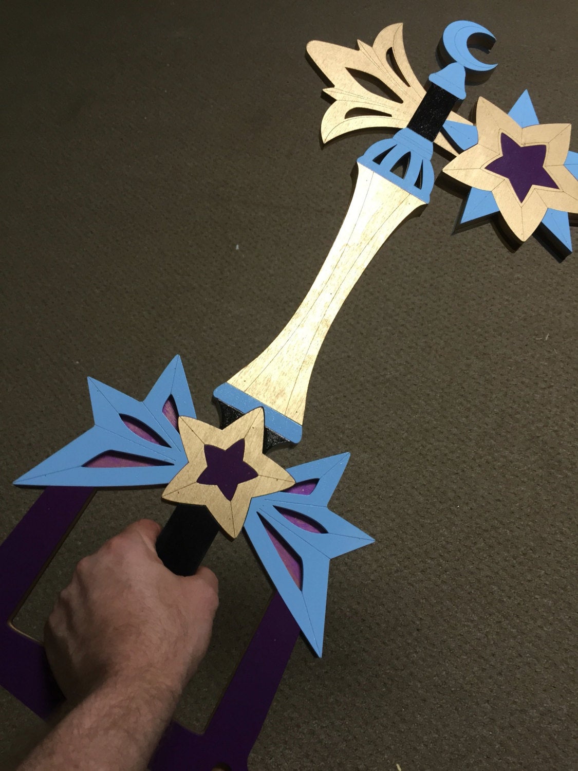 Starlight +31 Keyblade is hand crafted from layered ¼” thick wood, the costume replicas are durable and light weight. These layers provide structure and remarkable detail to create a replica as close to the original source as possible. After we have sanded, primed, painted, glued and micro nailed each layer together creating a strong and durable fully immersive cosplay accessory. These are highly decorated replica pieces made for the imagination; we do not encourage actual LARPing as paint and more delicate sections are prone to damage on collisions.