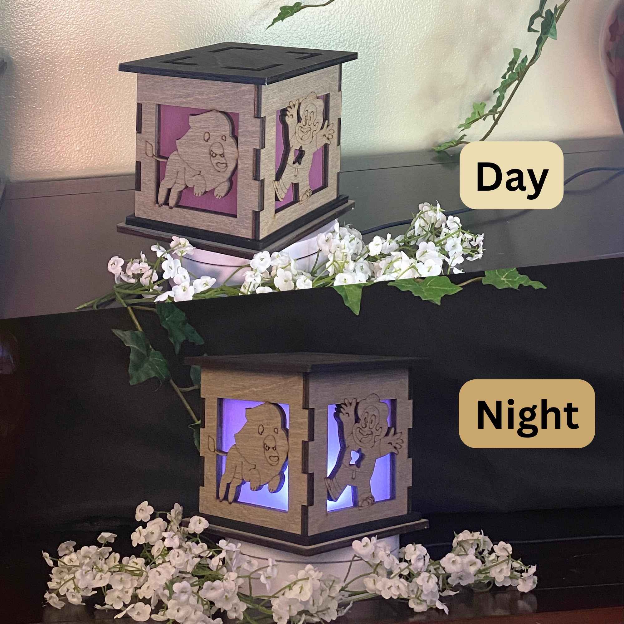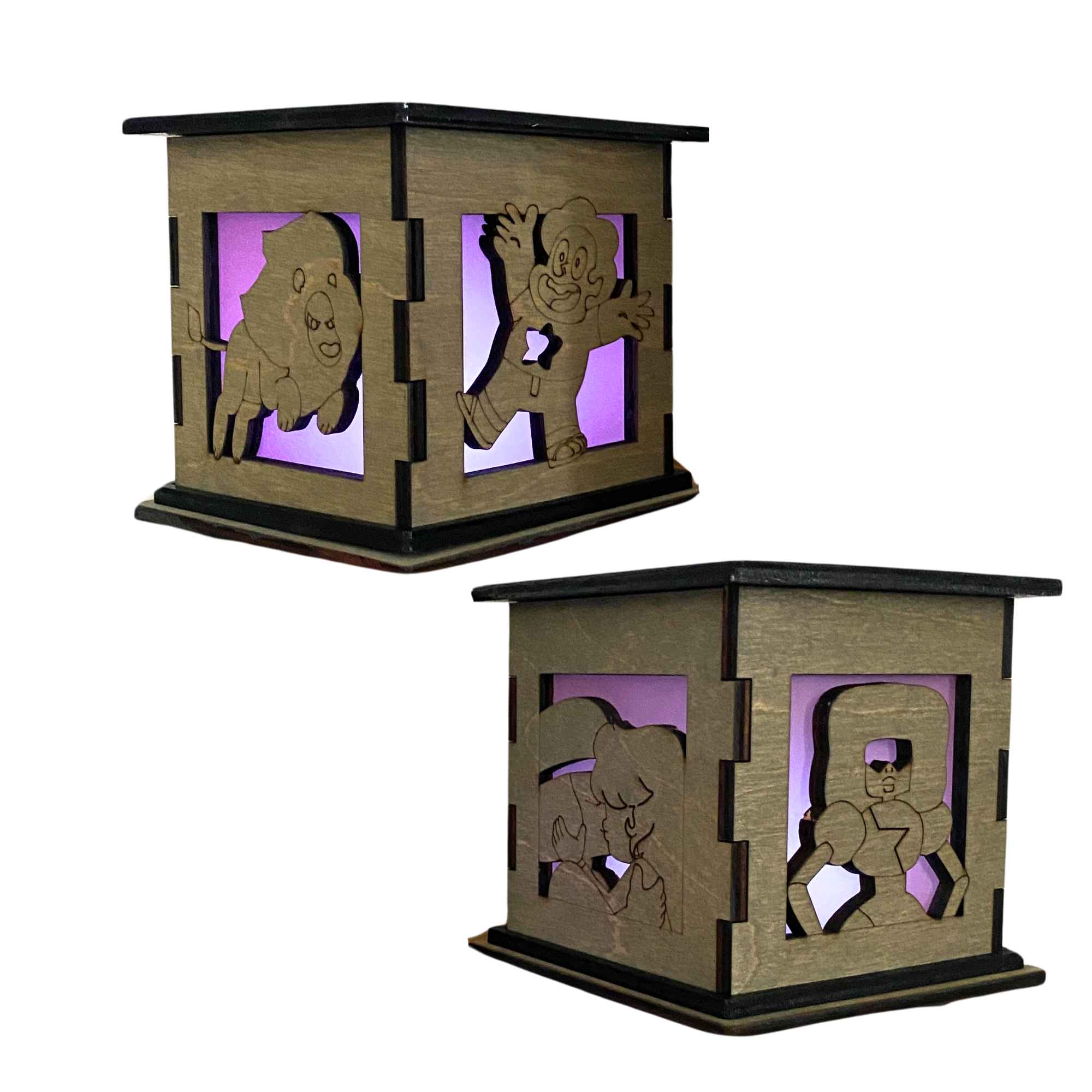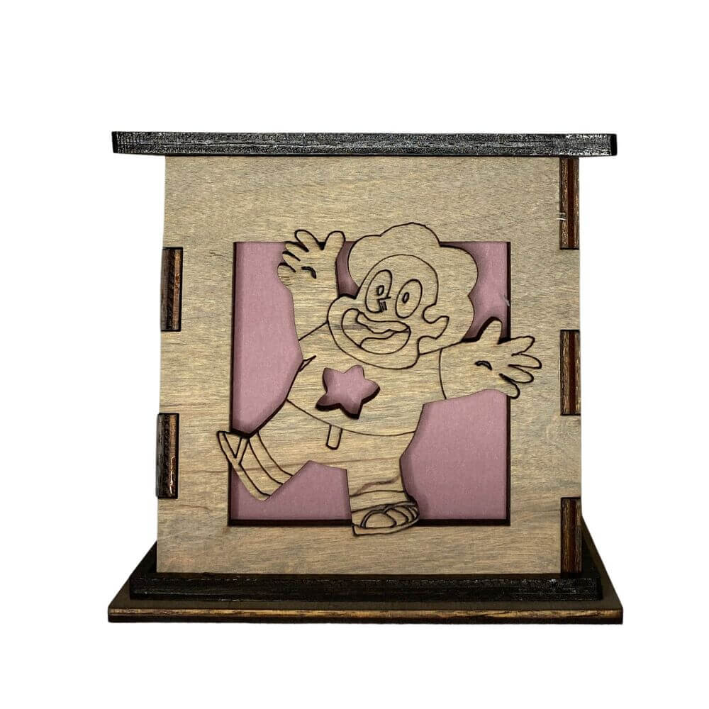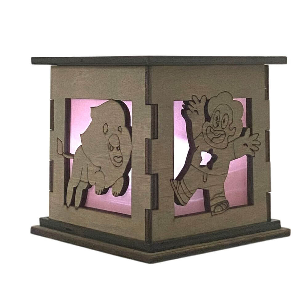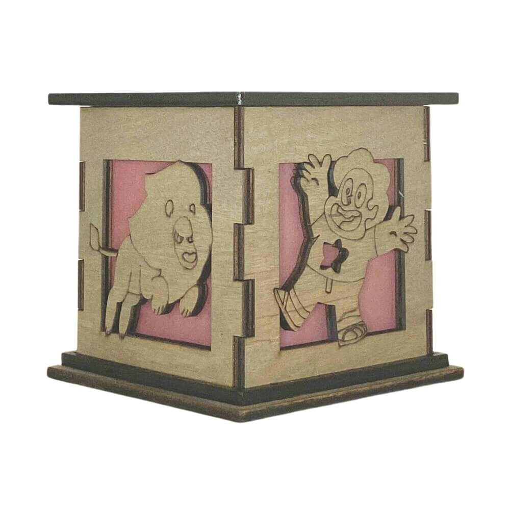 Show off your love of Steven Universe with this Light Box proudly displayed on your table, desk, or anywhere you can fit it. Inspired by the popular cartoon series, Steven Universe, each box is engraved and cut out on two sides. One side features Steven with this Gem belly button cut out while the other side of the box features a cut out of his trusty companion Lion.