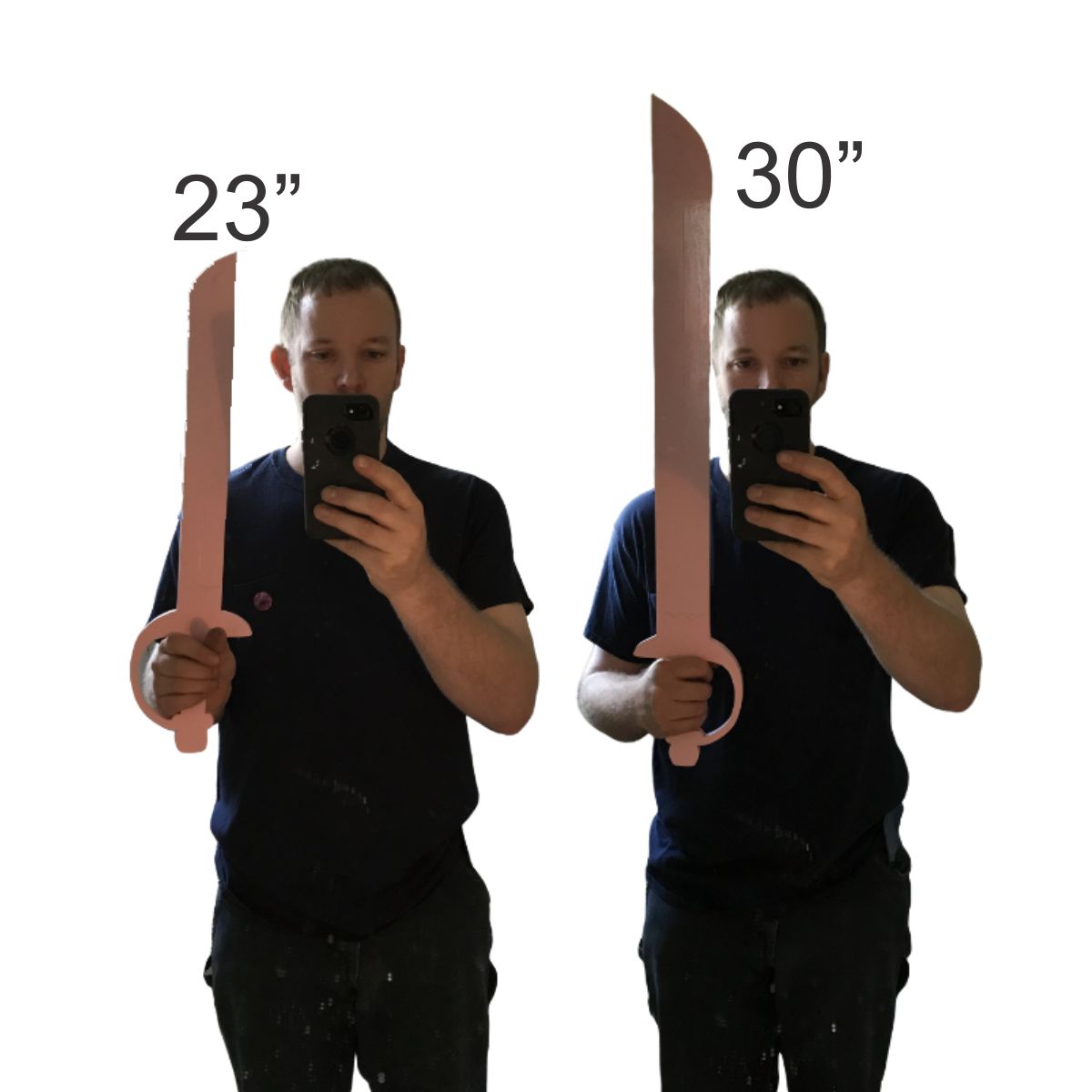 Conventional size is a con friendly size of a 23″ sword and a 17″ shield. The product gallery photo offers a comparison on all 3 sizes that we offer. Unsure of the size you need? Then check the product gallery photos on How to Measure for a conventional sized sword and shield using regular sized 8.5″ x 11″ paper. If the mock-up looks too large then you may wish to choose our petite size listed separately. Similarly, If the mock-up feels too small then choose the X-Large size that is also listed separately.