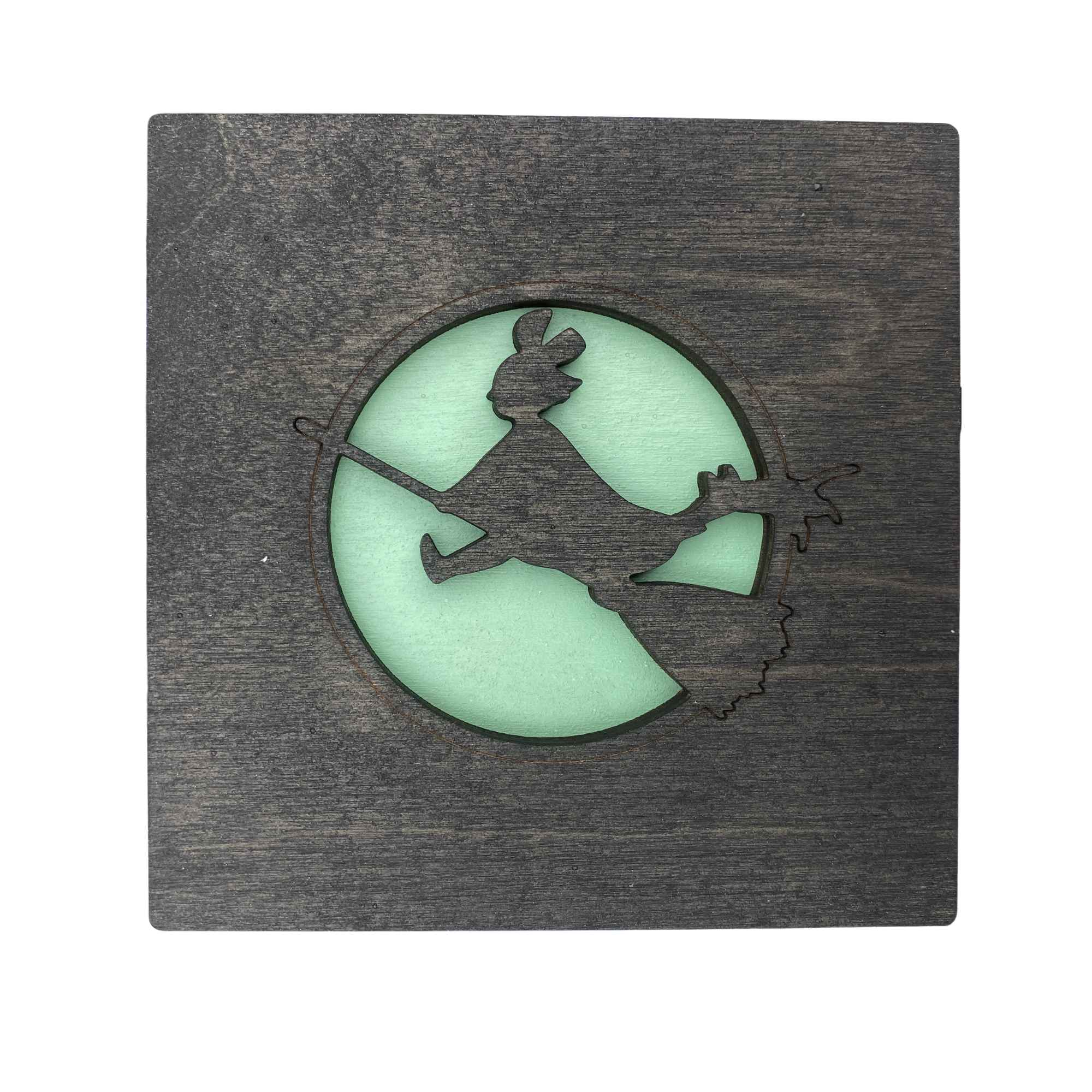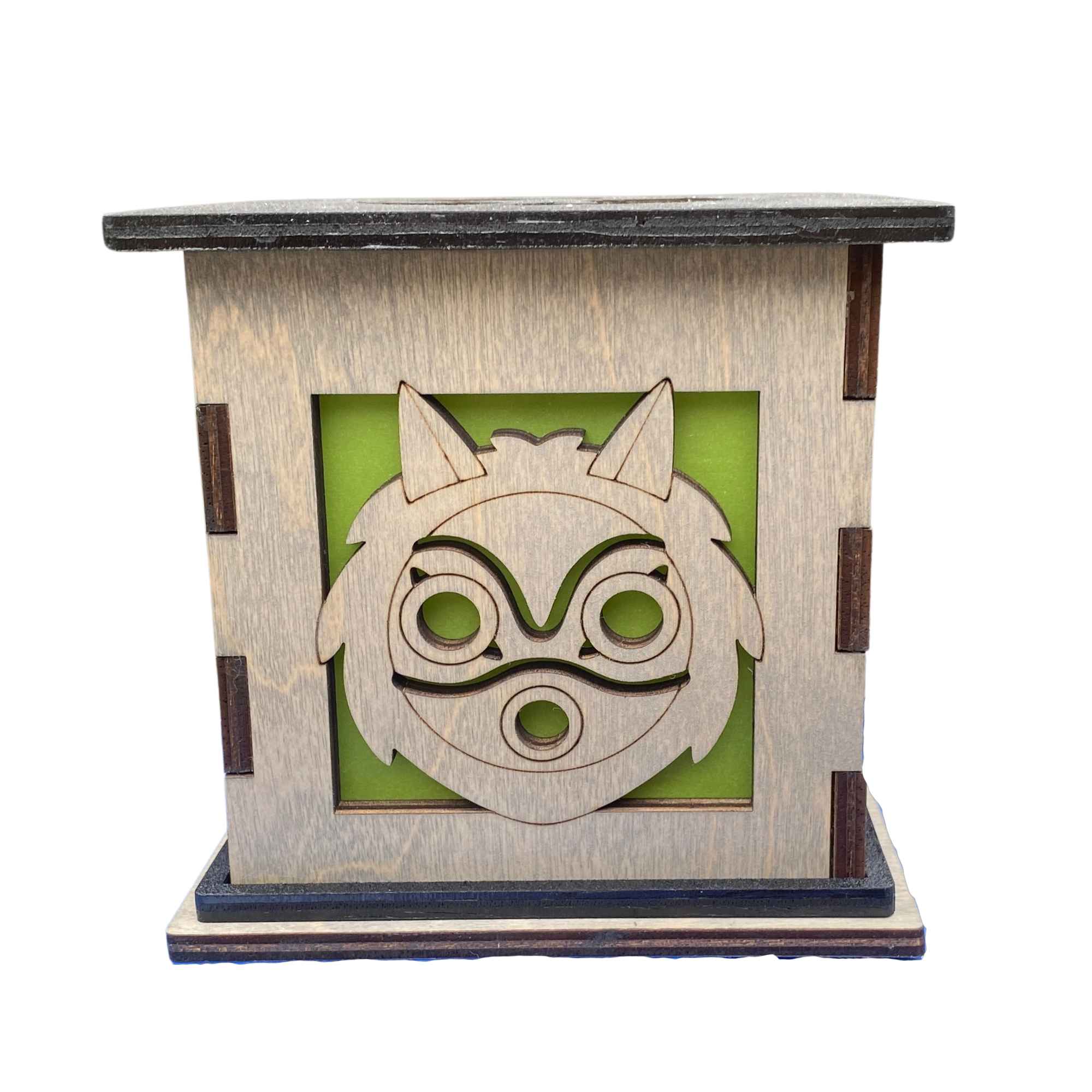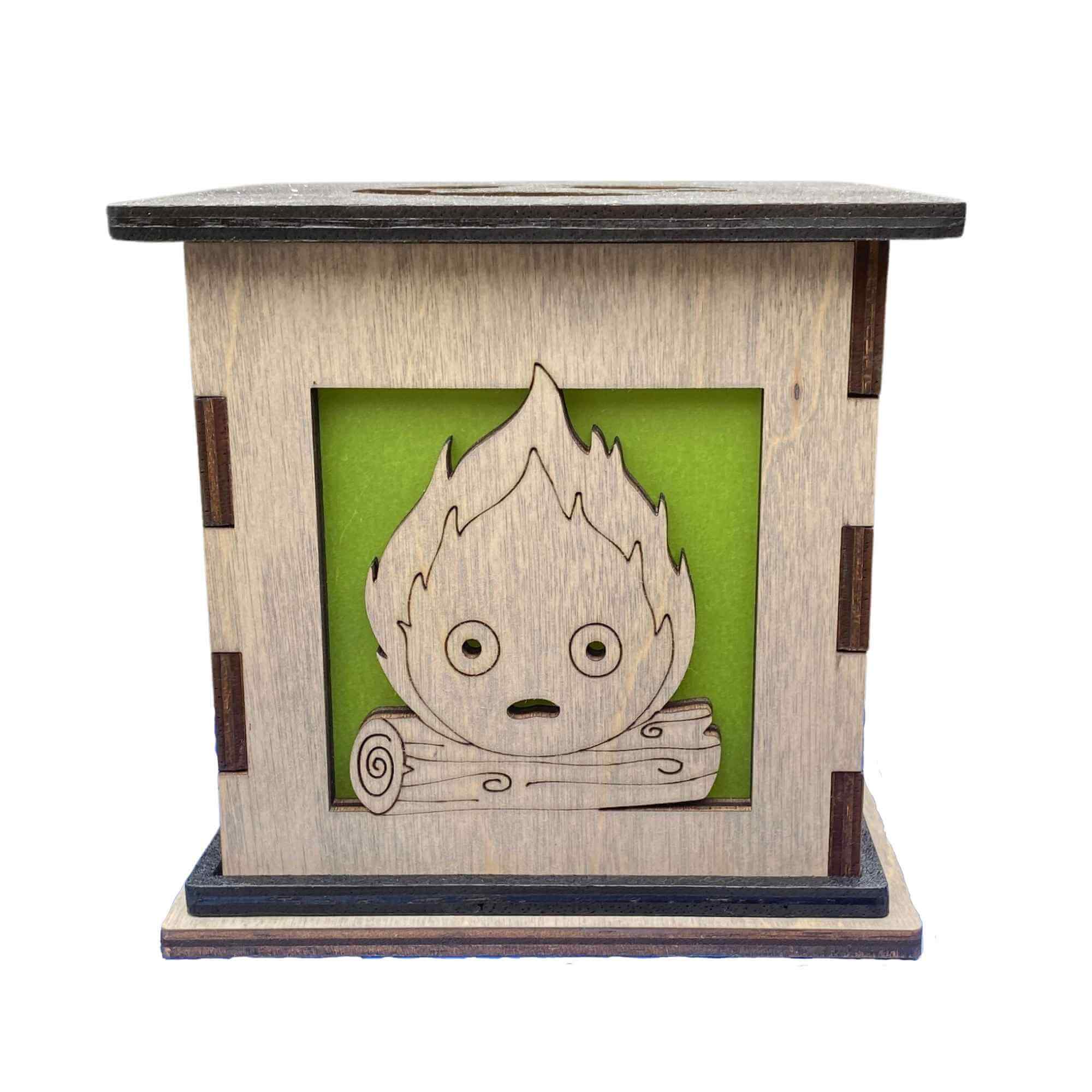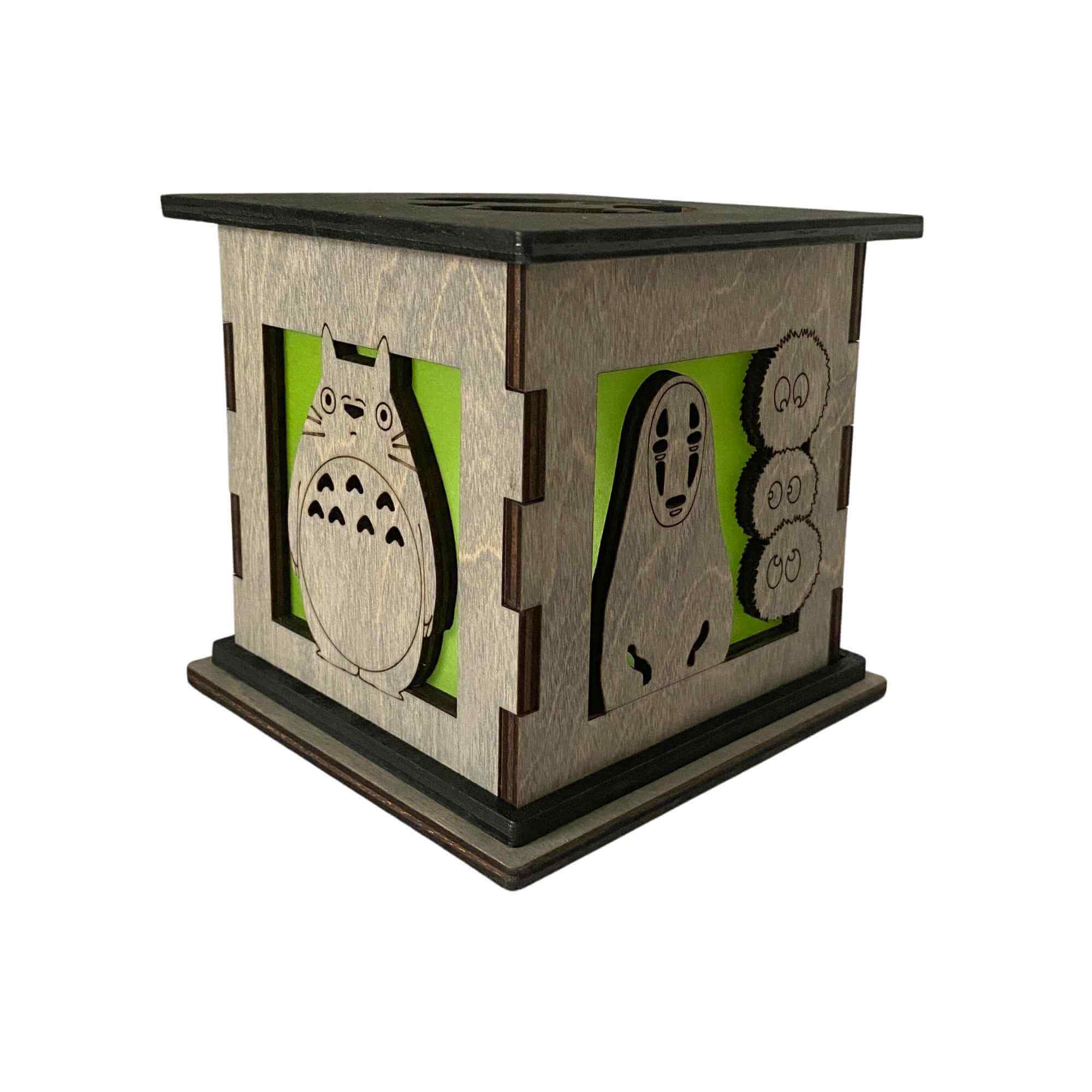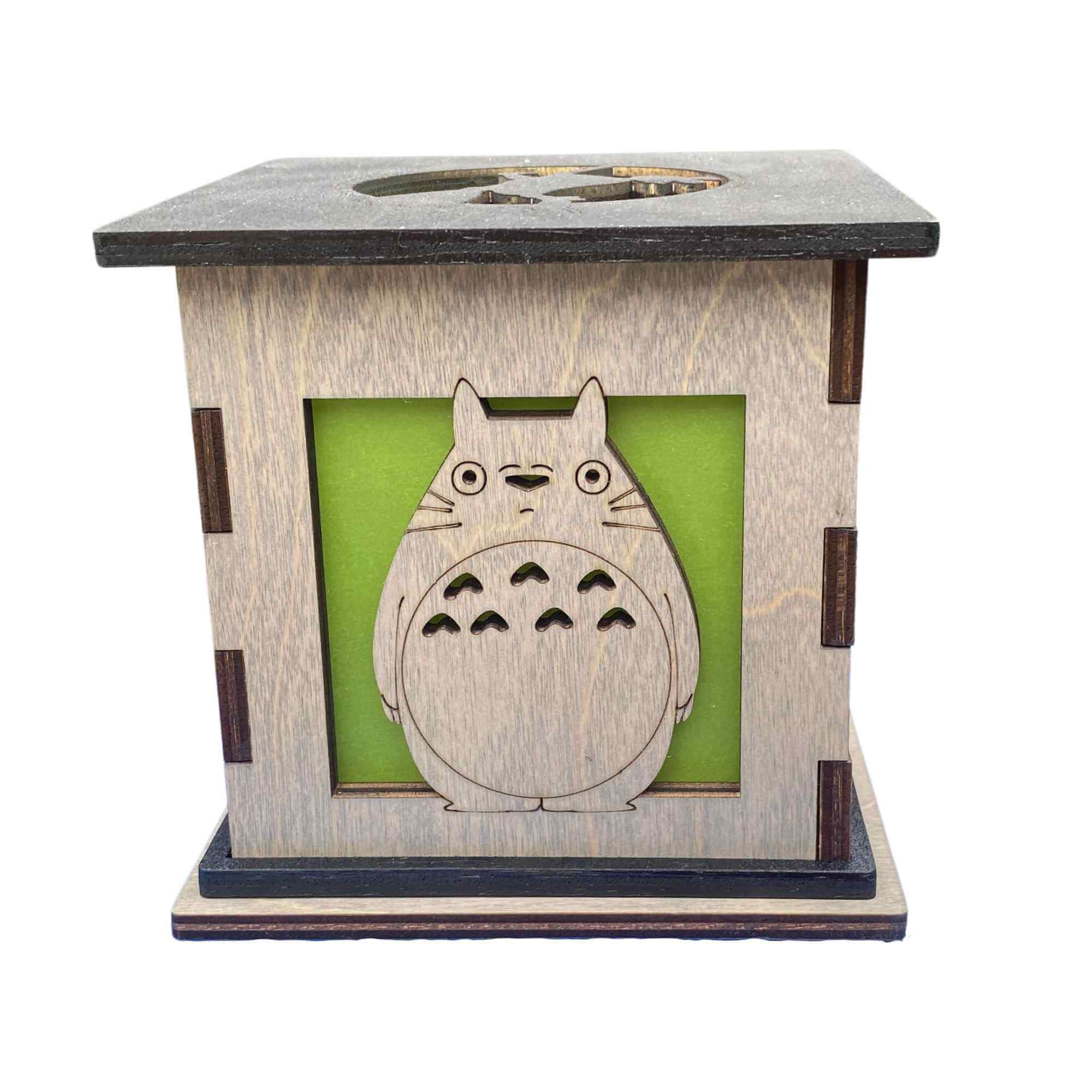 This nightlight measures at 5″ on each side. Creating a cubed box that is an excellent decorative keepsake for your table, shelf, mantle, bedside, desk and more. Beautifully stained grey to match any existing home décor. Lined with a colored translucent filter that gives your box a pop of color even when not lit up. Featured on the top is a painted black top with four cut outs featuring the same color on display on the sides. The black top and rim contrast against the grey and give the box an overall elegant look. The Studio Ghibli Light Box comes with a white tea light that allows the box to give off its glow. These details result in a candle holder that has that unique combination of nerdy with sophistication. Giving the option to display your passions while not taking away from keeping a beautiful home.