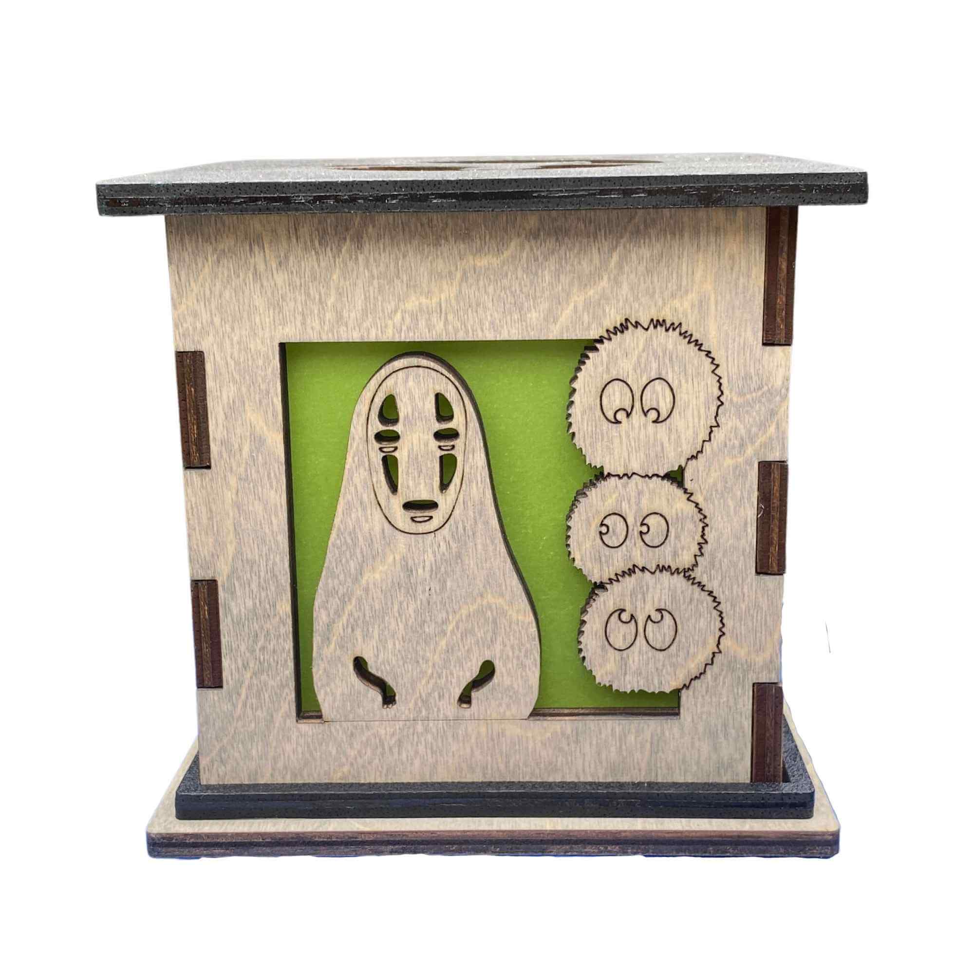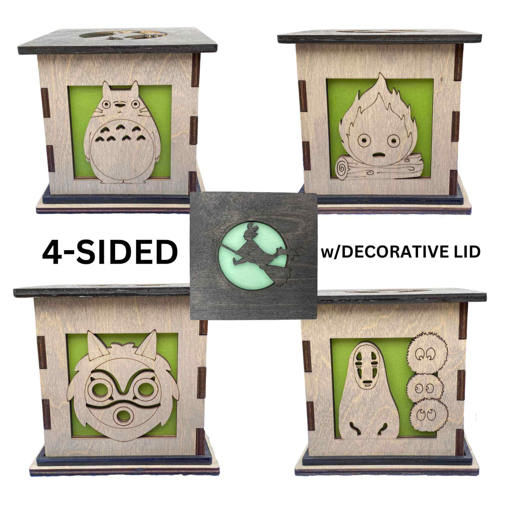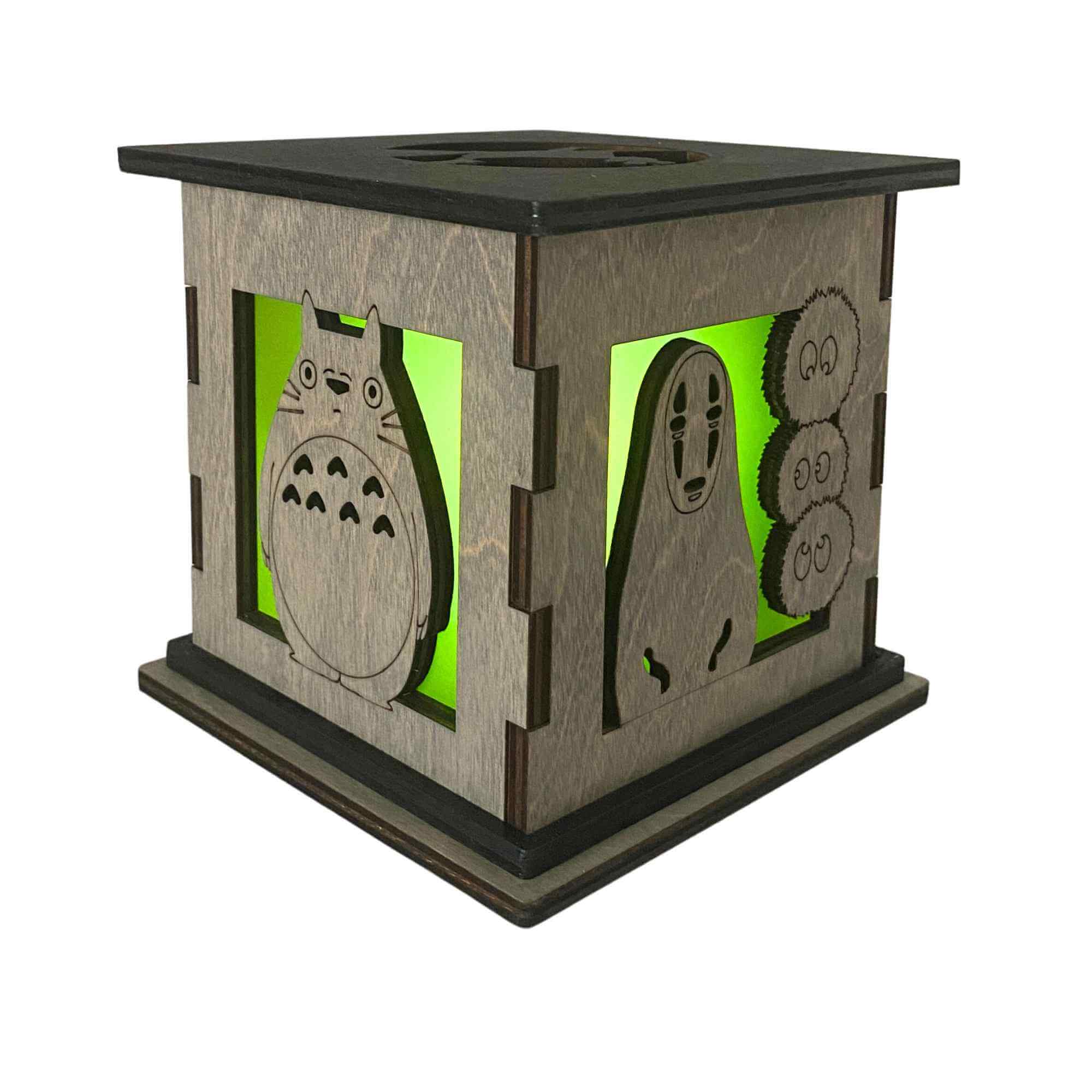 Light up your home or office with the excitement of this Studio Ghibli Anime Light Box. Inspired by the characters from the legendary Studio Ghibli series. The lid is decorated with Kiki’s Delivery Service and the box is decorated on all four sides with references to excite any fan and make for an excellent birthday present. One side of the light box features Moro from Princess Monoke, one side features Calcifer from Howls Moving Castle, one side features Totoro from My Neighbor Totoro and the other side features No Face and the Soot Sprites from Spirited Away. Each sits in front of a green translucent filter to light up in the darker hours of the day. Therefore, making the Ghibli Studio Light Box a perfect night light or decoration for any room.