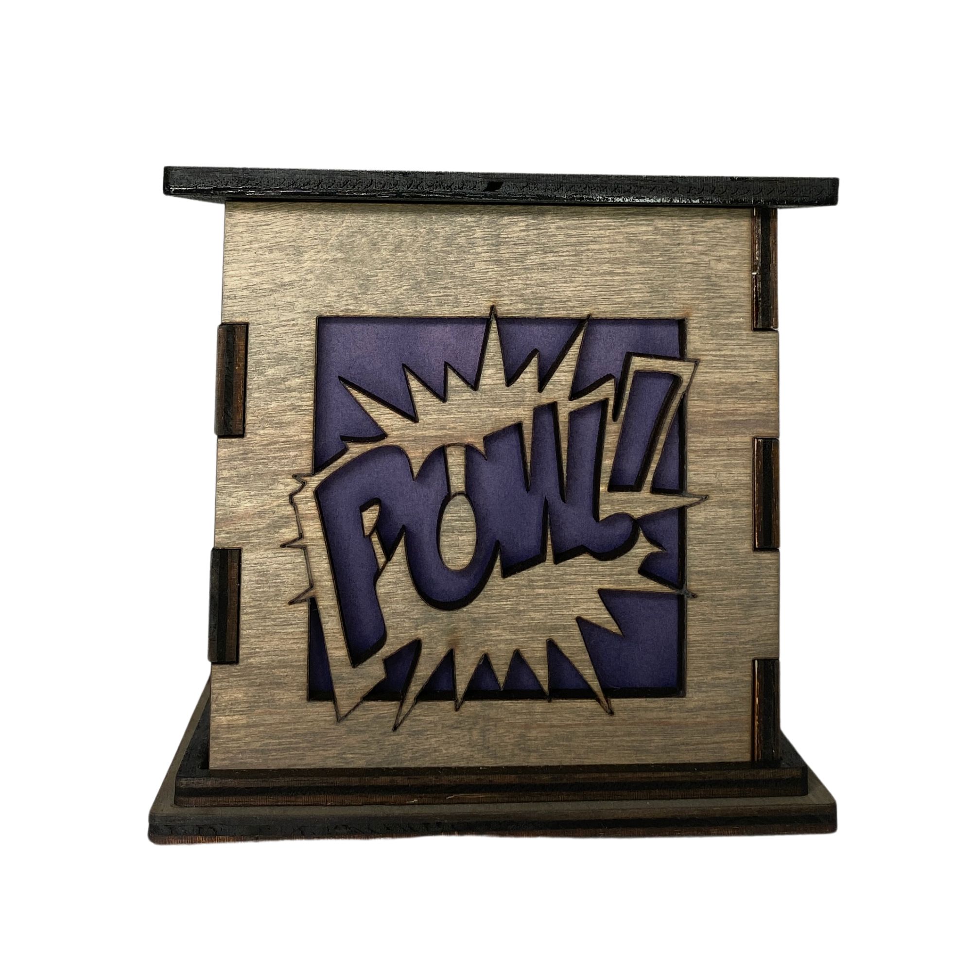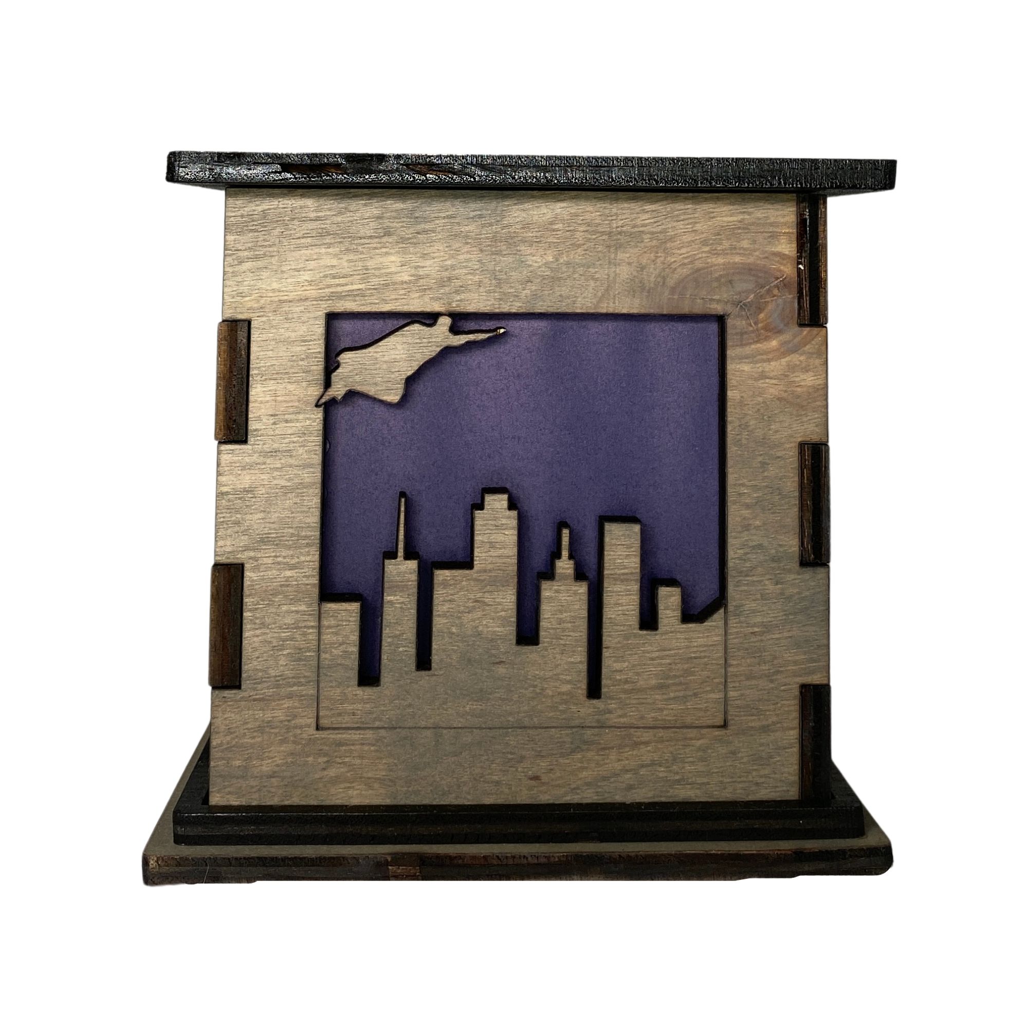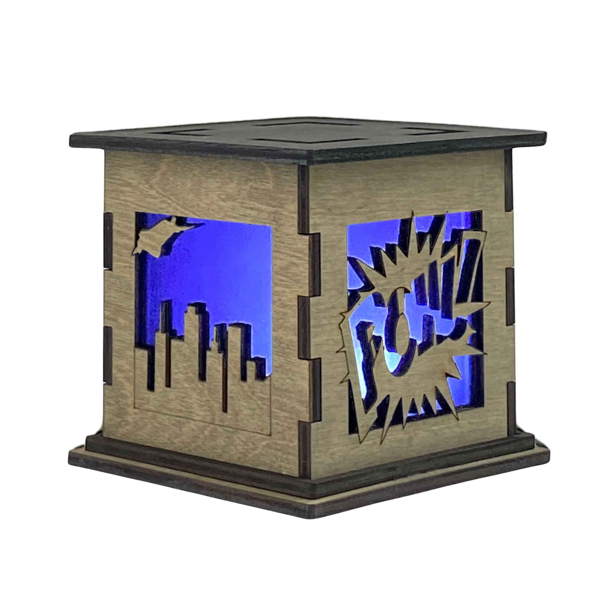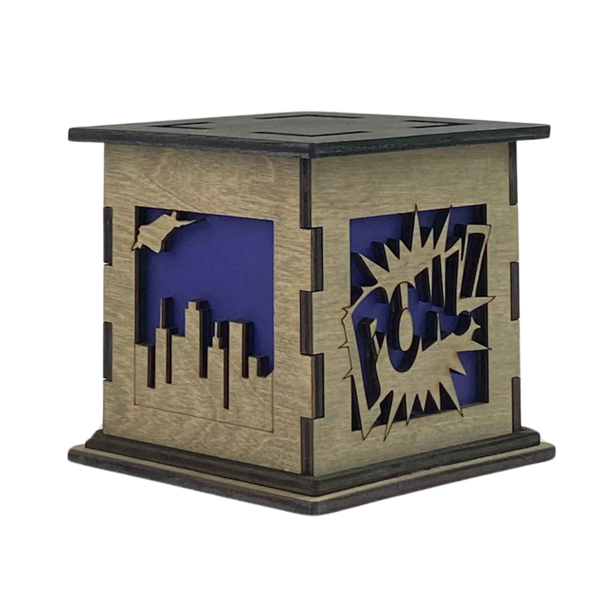Show off your love for larger-than-life heroics with the Superhero Glow Box. This handcrafted wooden box features two dynamic sides: one side showcases a superhero flying over a cityscape with towering buildings. While the other side features a cut out of an iconic comic book POW! The included battery-operated tealight inside the box shines through a blue filter. Thus, adding a soft light that brings these epic designs to life.