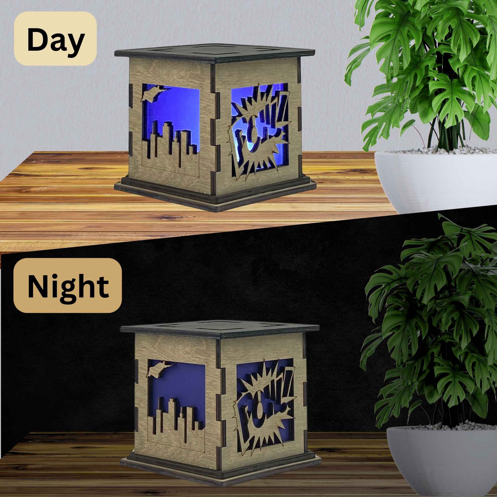 Whether you’re a fan of comic books, superhero movies, or just love a touch of heroic flair. This Superhero Glow Box will instantly elevate your space. The city scene and the flying superhero evoke the power and energy of your favorite caped crusaders. While the POW symbol design brings a playful comic book vibe to the box. The blue filter adds to the dramatic effect, creating a glowing backdrop that enhances the designs, making it a perfect centerpiece for your bedroom, office, or living room.