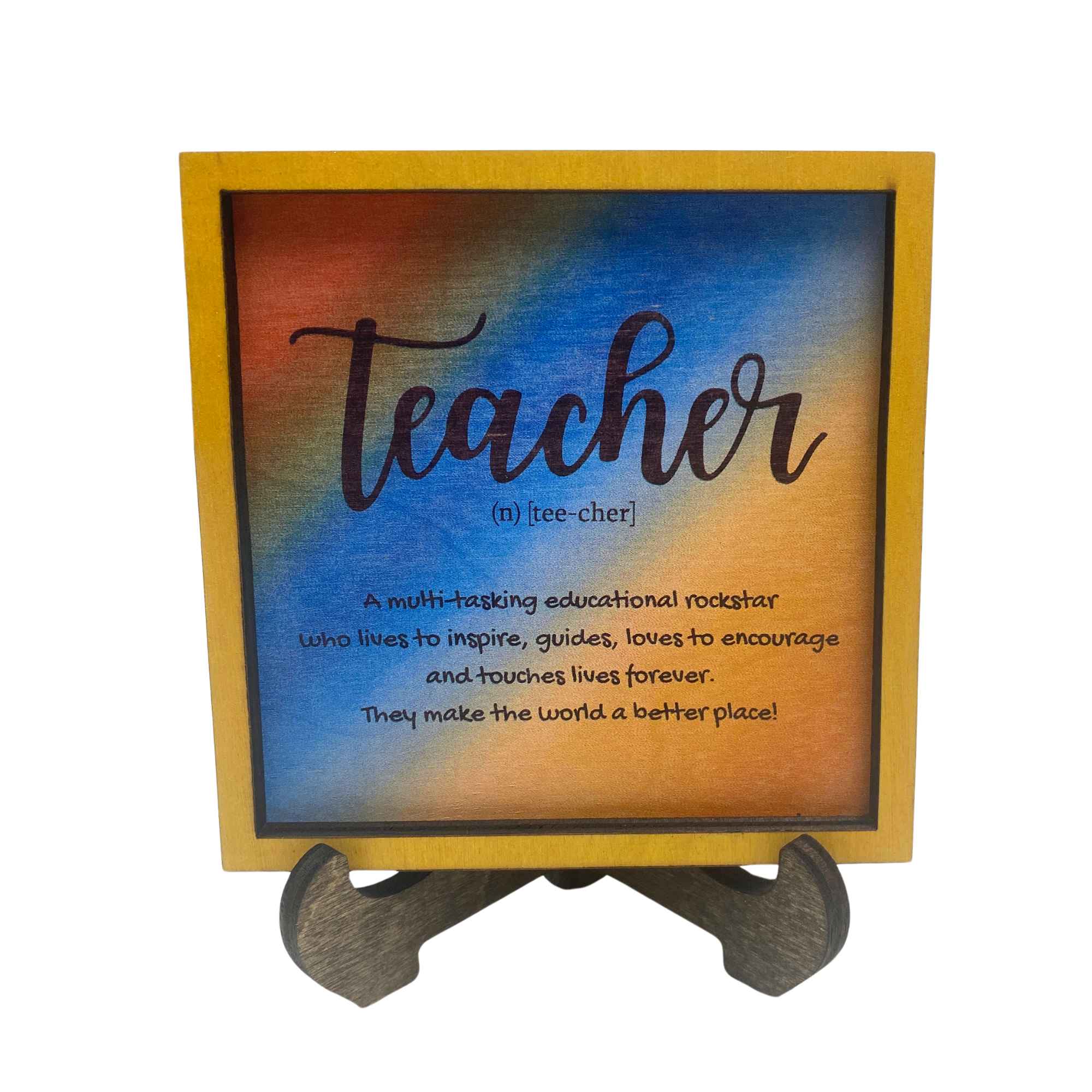 Teacher Definition:  This heartfelt message defining the word Teacher: “A multi-tasking education rockstar who lives to inspire, guides, loves to encourage and touches lives forever.  They make the world a better place!”  A gift that combines uniqueness, inspiration, and gratitude all in one.