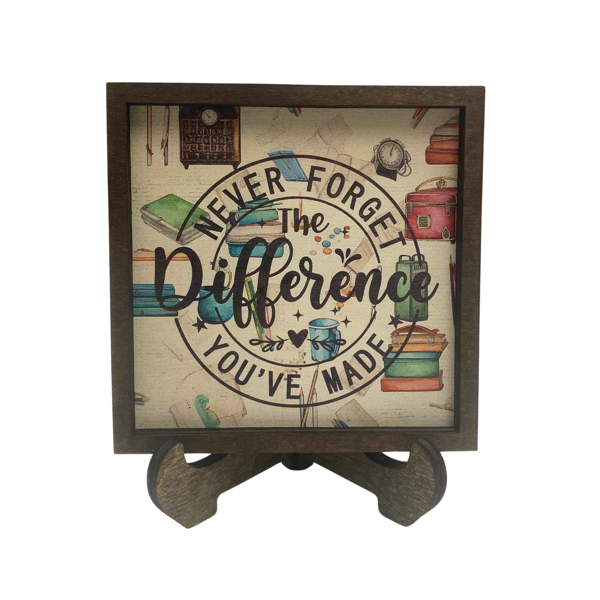 The Difference You’ve Made:   The background of the sign is adorned with powerful words that read “Never Forget the Difference You’ve Made.” These words beautifully encapsulate the immeasurable influence teachers have on shaping young minds. The sign is elegantly framed with a brown border, adding a touch of sophistication to any teacher’s workspace.