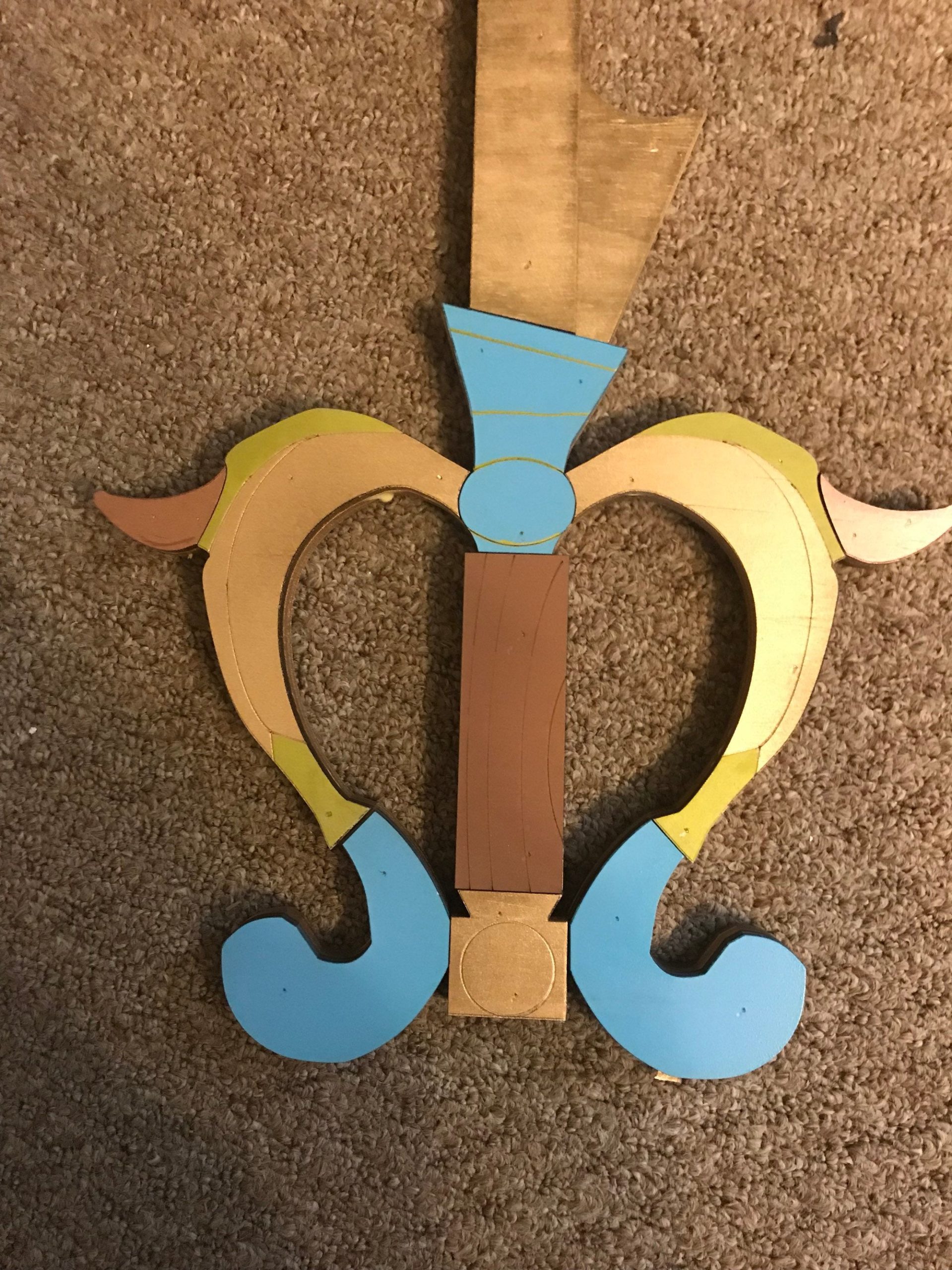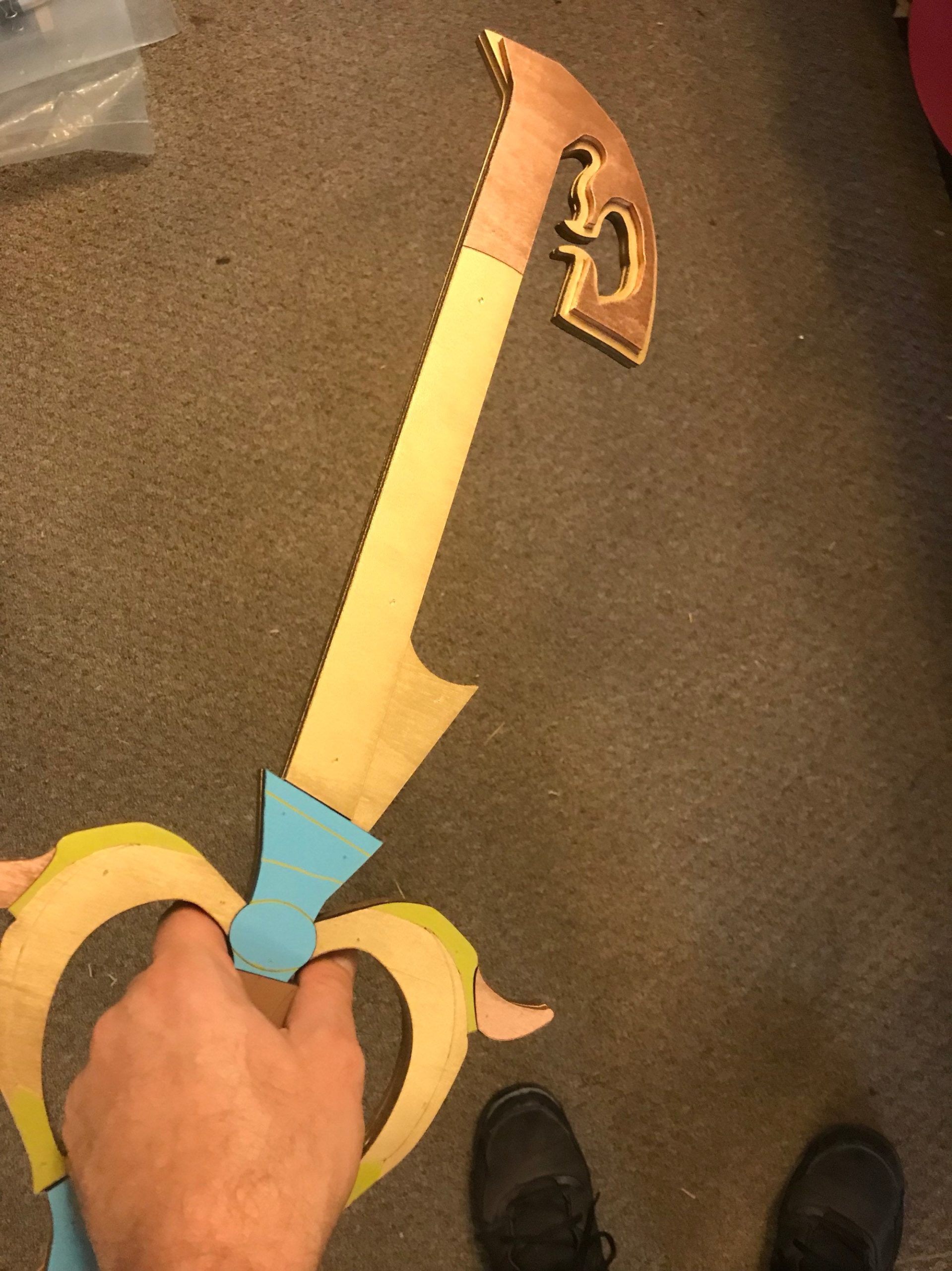 Three Wishes Keyblade is hand crafted from layered ¼” thick wood, the costume replicas are durable and light weight. These layers provide structure and remarkable detail to create a replica as close to the original source as possible. After we have sanded, primed, painted, glued and micro nailed each layer together creating a strong and durable fully immersive cosplay accessory. These are highly decorated replica pieces made for the imagination; we do not encourage actual LARPing as paint and more delicate sections are prone to damage on collisions.