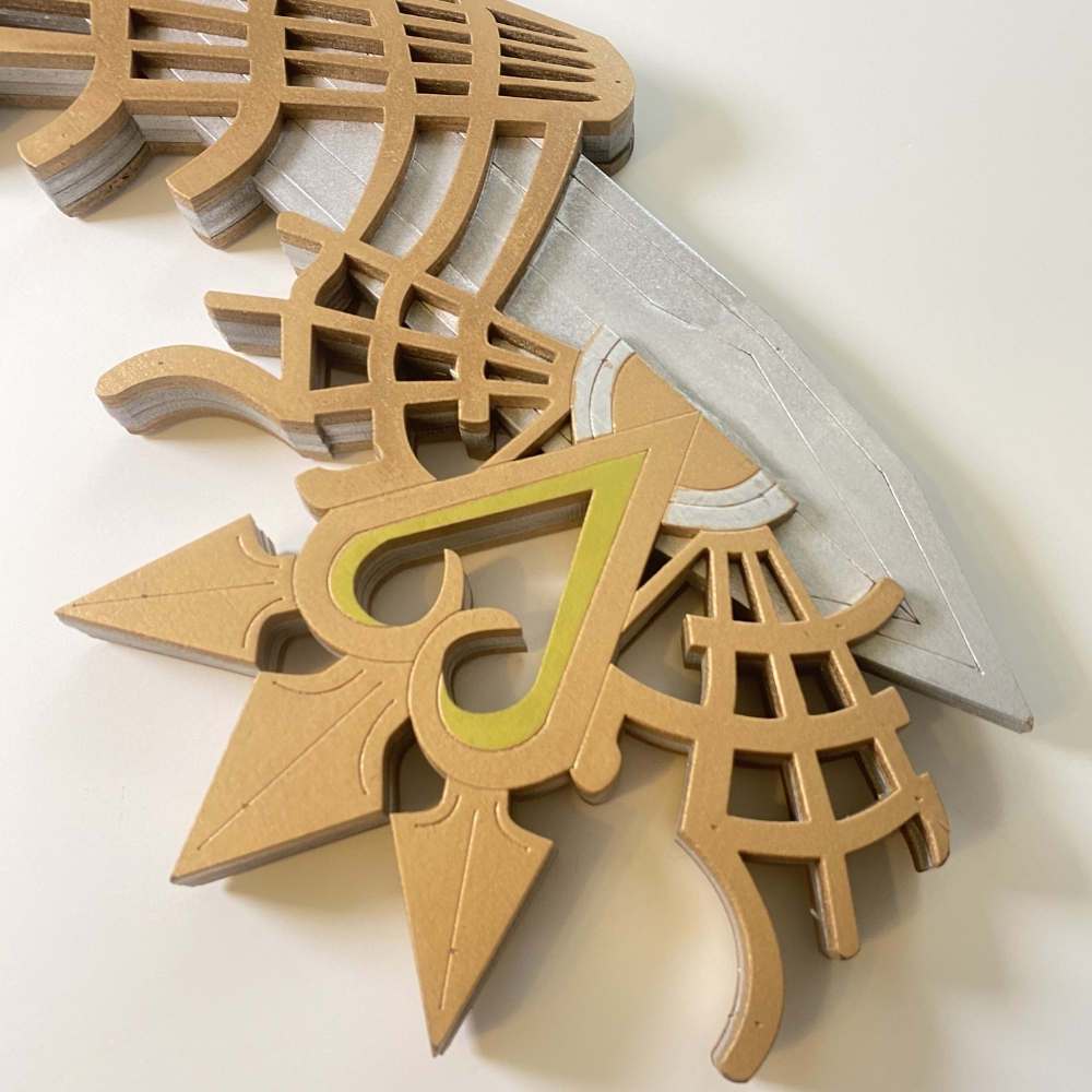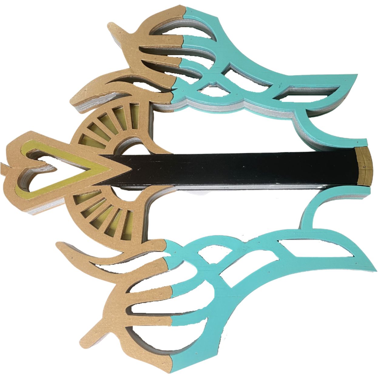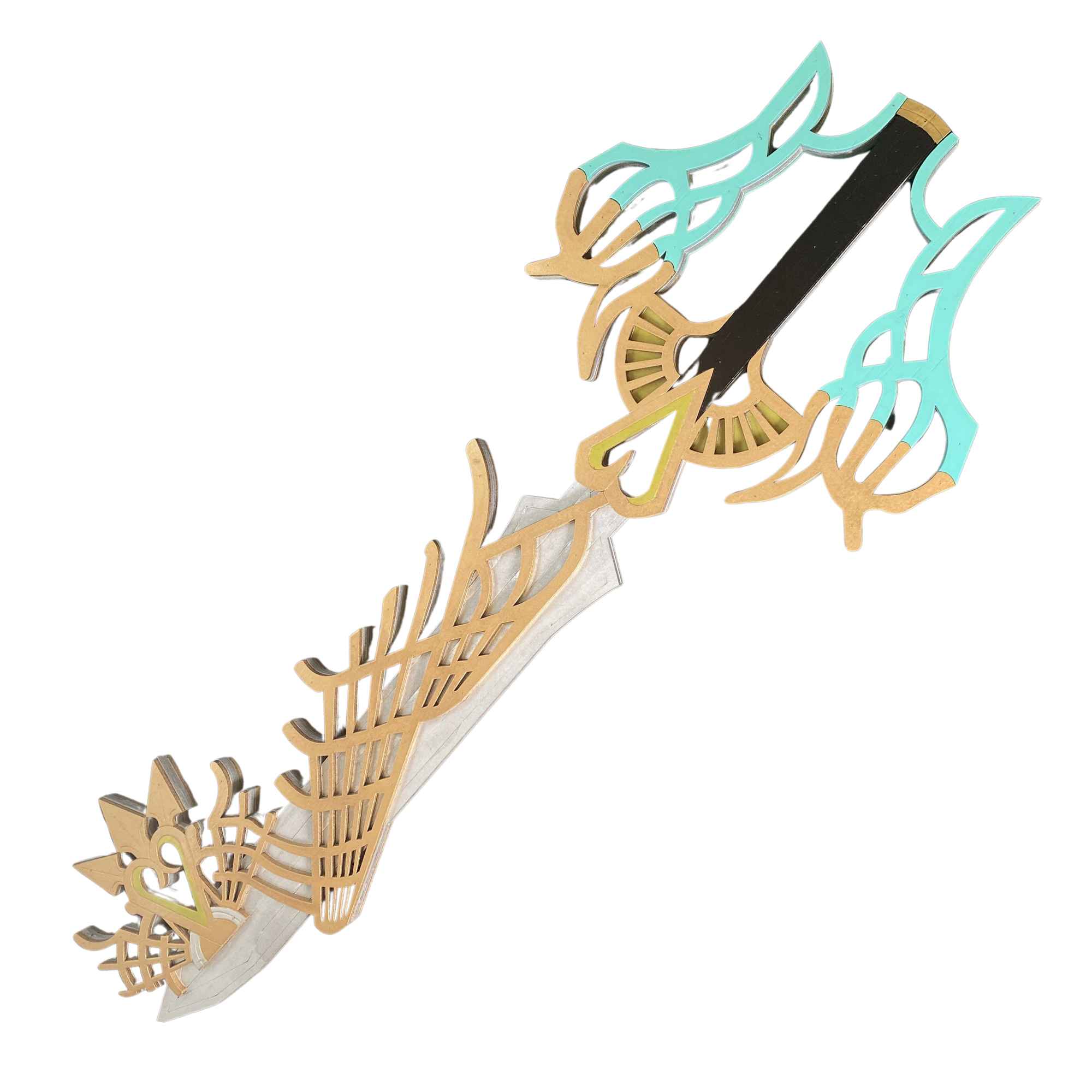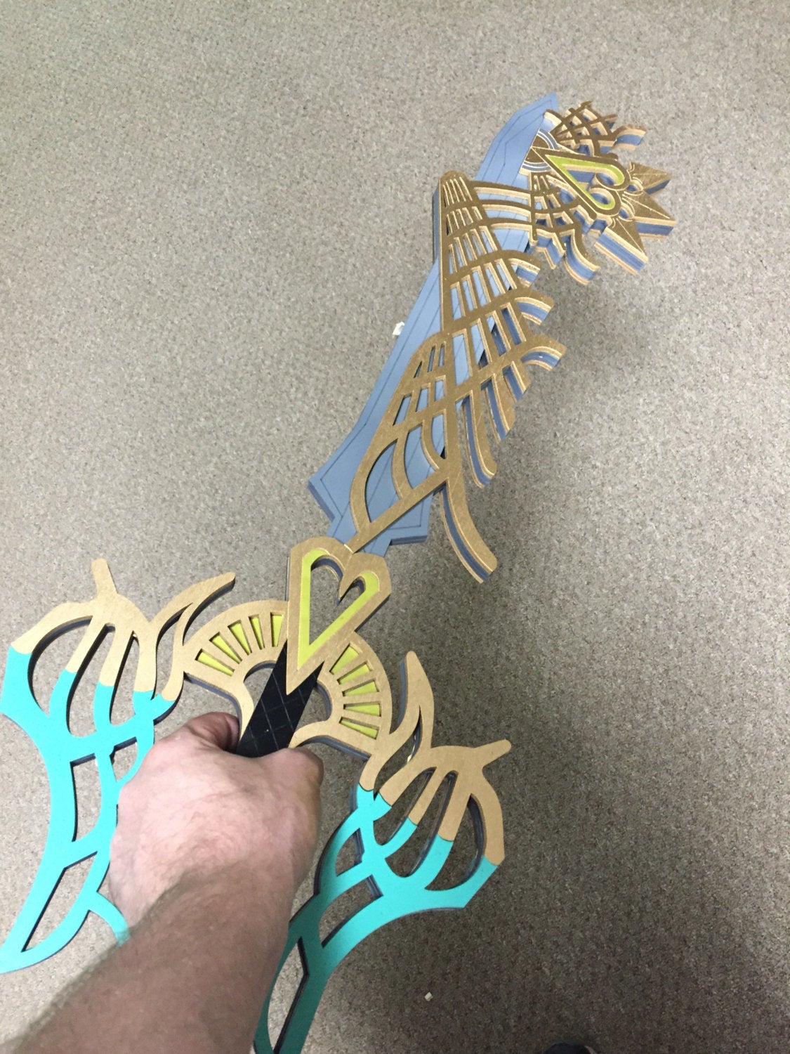 Ultima Weapon Keyblade is hand crafted from layered ¼” thick wood, the costume replicas are durable and light weight. These layers provide structure and remarkable detail to create a replica as close to the original source as possible. After we have sanded, primed, painted, glued and micro nailed each layer together creating a strong and durable fully immersive cosplay accessory. These are highly decorated replica pieces made for the imagination; we do not encourage actual LARPing as paint and more delicate sections are prone to damage on collisions.