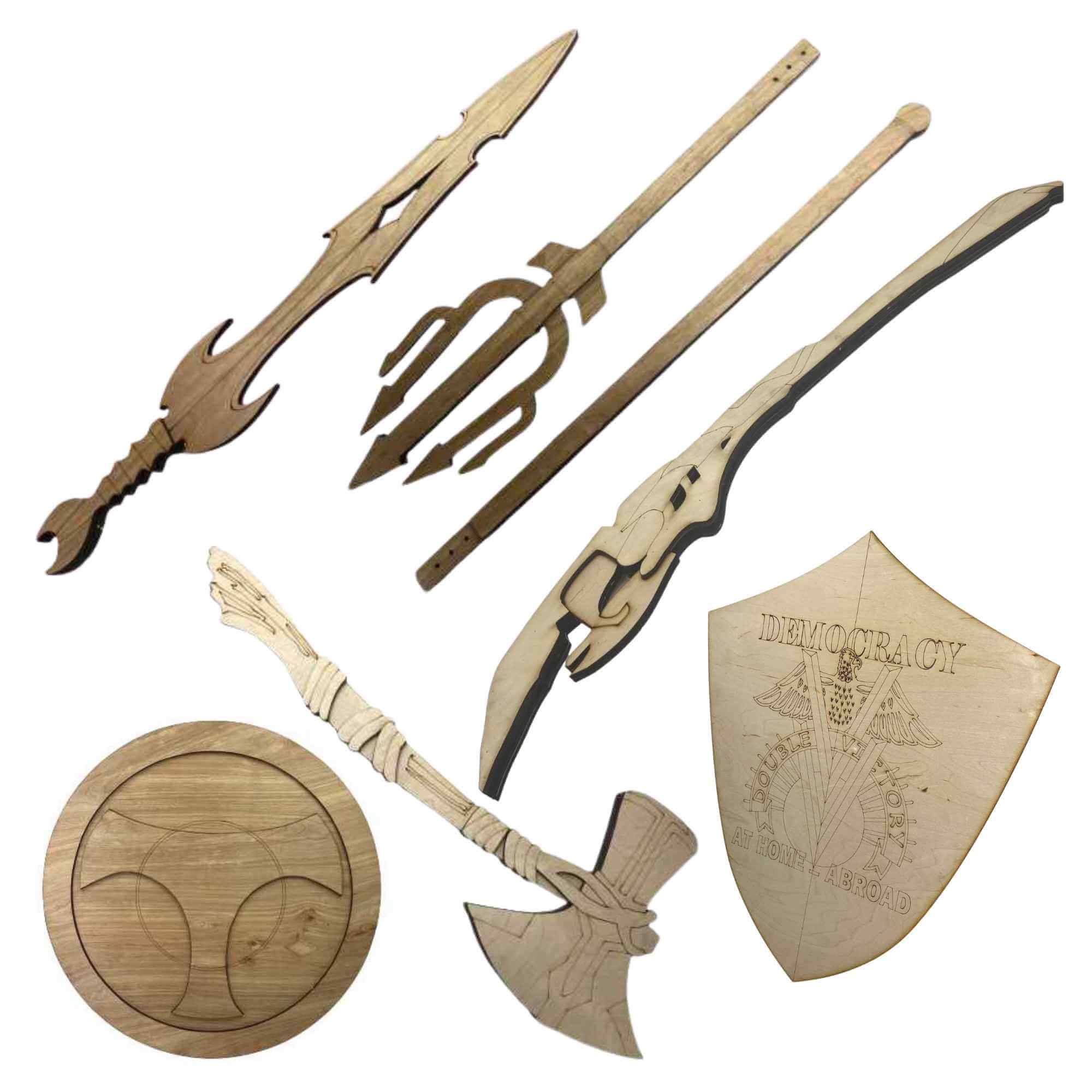 Hand crafted from layered ¼” thick wood, durable and light weight. These layers provide structure and remarkable detail to create a replica as close to the original source as possible. After we have glued and micro nailed each layer together creating a strong and durable fully immersive cosplay accessory. With your artistic touches, you too can make a highly decorated replica piece made for the imagination; we do not encourage actual LARPing as paint and more delicate sections are prone to damage on collisions.