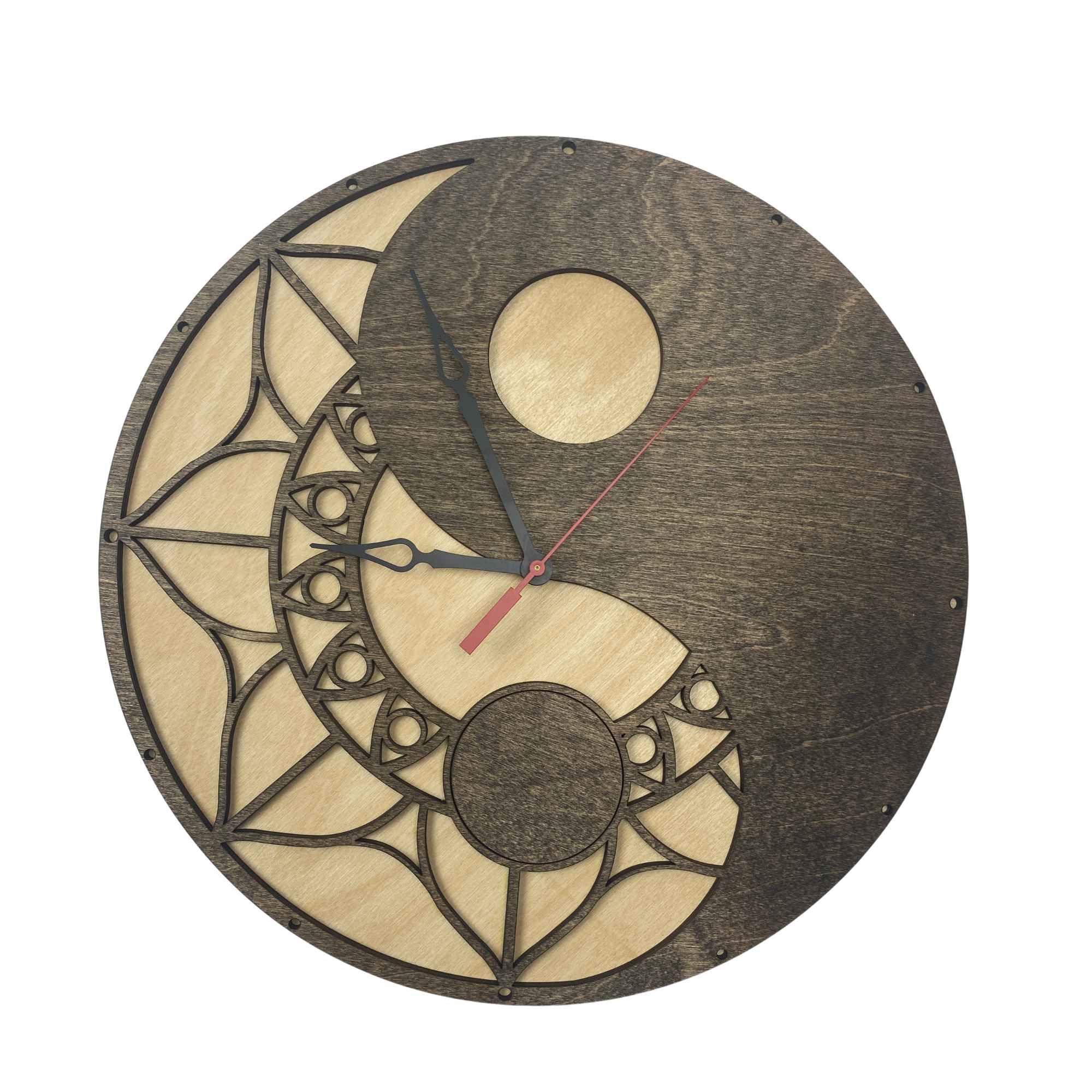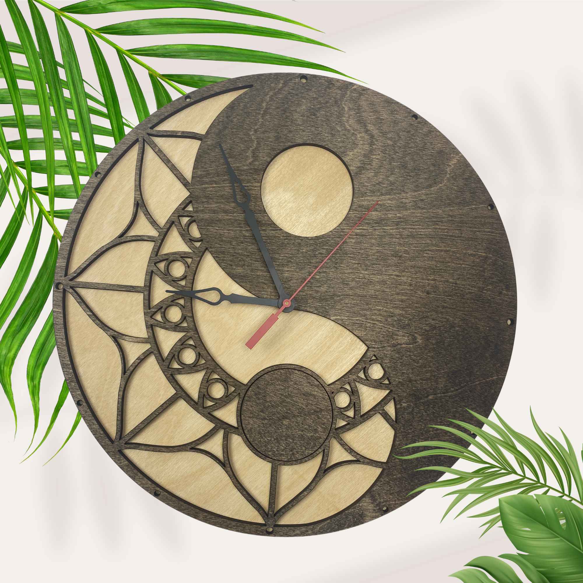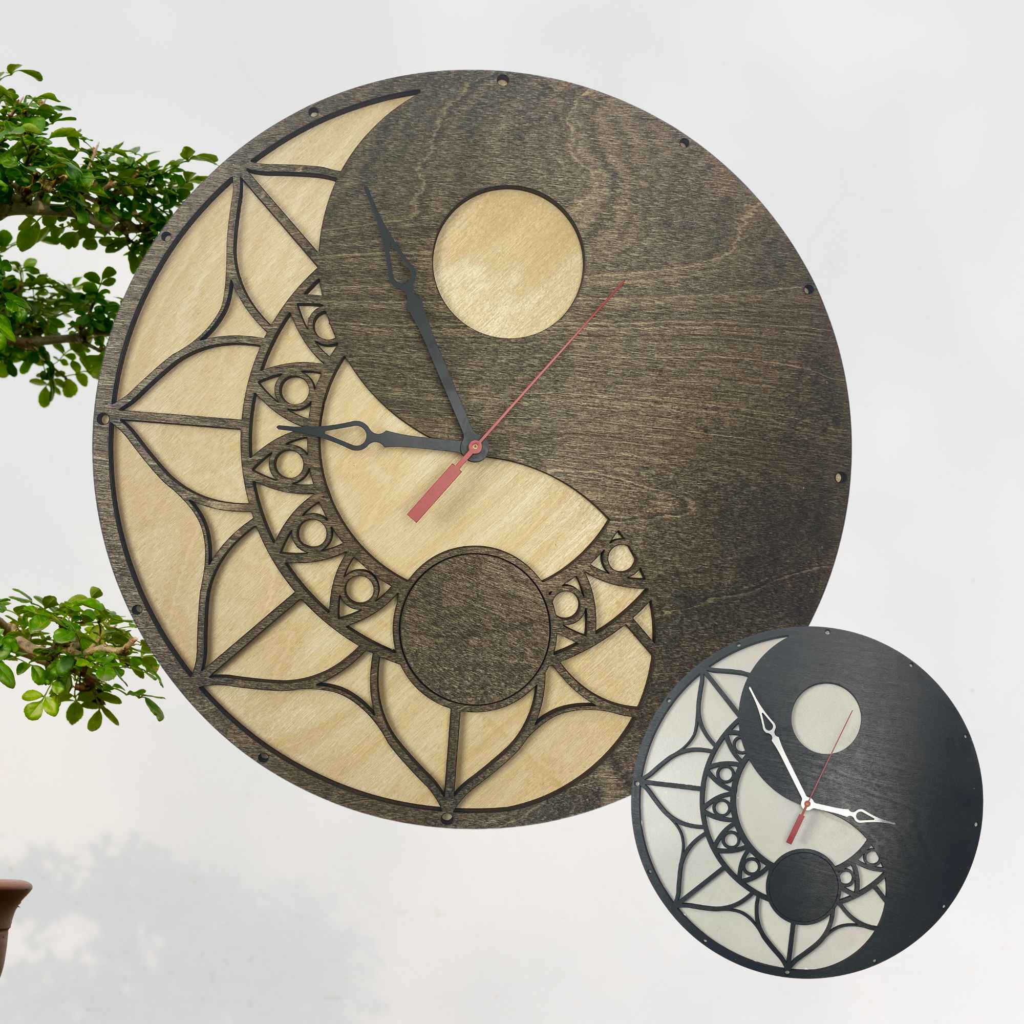 Elevate your space with our 14″ organic wood Yin-Yang Mandala Clock.  A harmonious blend of artistic beauty and functional timekeeping.  This clock is available in two stunning options: a warm two-tone wood stain or a modern black and white contrast, a cater to diverse preferences.  The Yin-Yang design with a Mandala center is meticulously crafted from organic wood.  Immerse yourself in  tranquility as this exquisite timepiece seamlessly integrates into your space, combining aesthetic appeal with the soothing essence of a zen lifestyle.  Bring balance and sophistication to your surrounds with our unique Yin-Yang Mandala Clock.