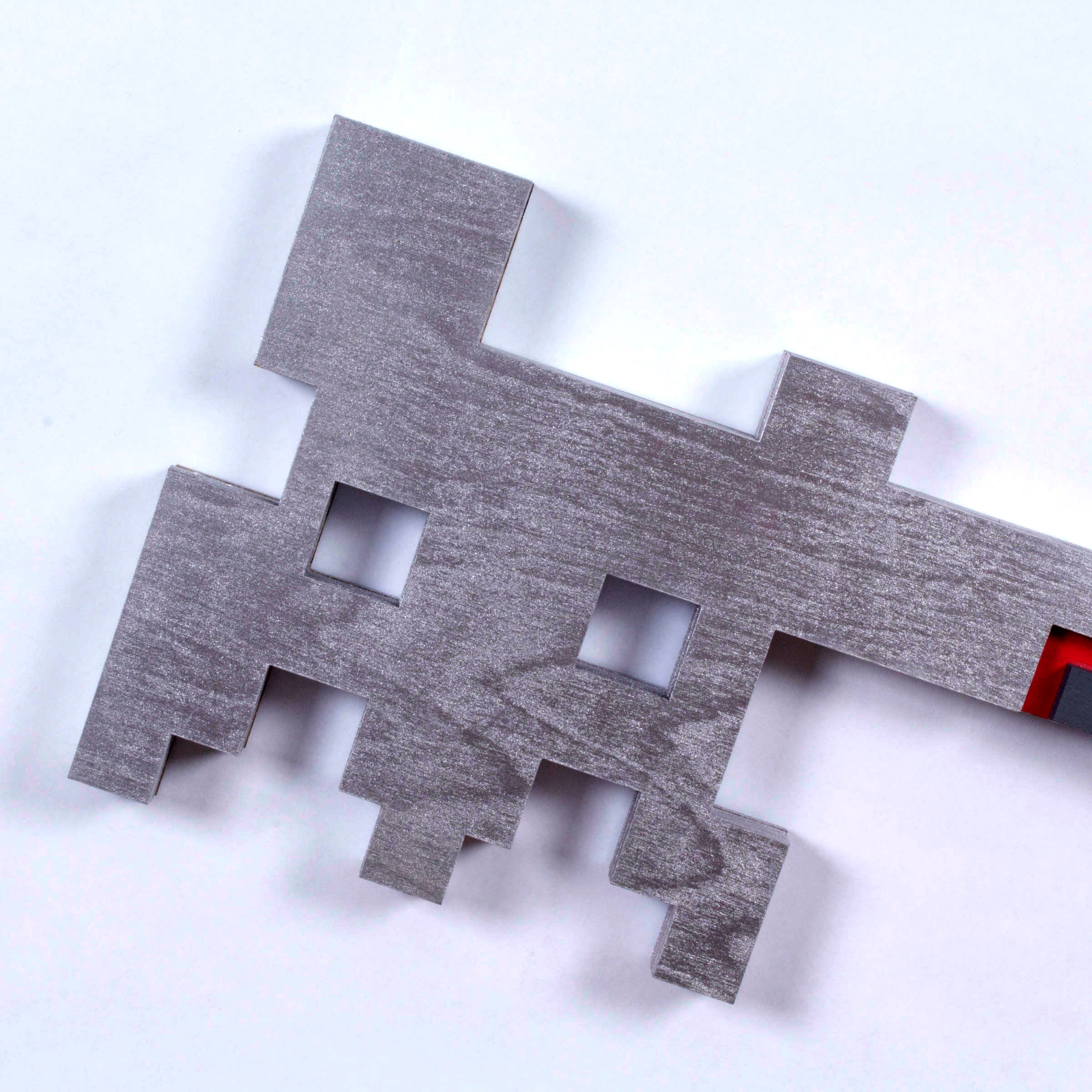 This isn’t a glitch on your screen, but the Zero/One Keyblade. Made to reseble a heavily pixelated Kingdom Key, this keyblade was wielded by Data-Sora in Kingdom Heats Re:Coded. The wooden keyblade is 31″ long, 13″ wide, and lightweight to make for a easily displayable wall piece or easily carried cosplay prop.