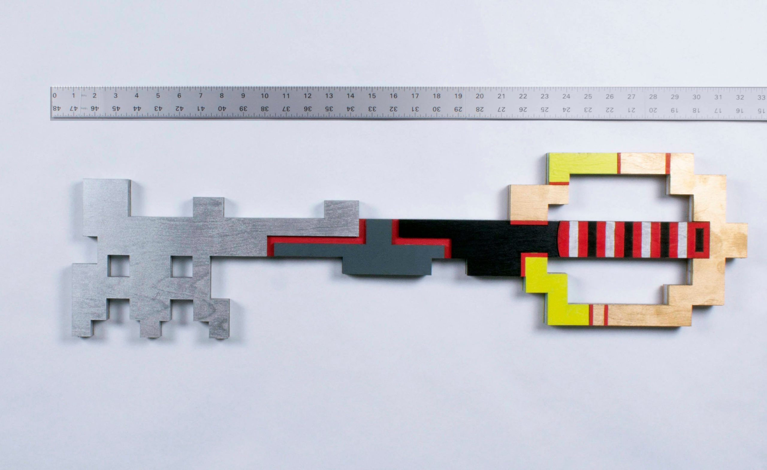 Zero/One Keyblade is hand crafted from layered ¼” thick wood, the costume replicas are durable and light weight. These layers provide structure and remarkable detail to create a replica as close to the original source as possible. After we have sanded, primed, painted, glued and micro nailed each layer together creating a strong and durable fully immersive cosplay accessory. These are highly decorated replica pieces made for the imagination; we do not encourage actual LARPing as paint and more delicate sections are prone to damage on collisions.